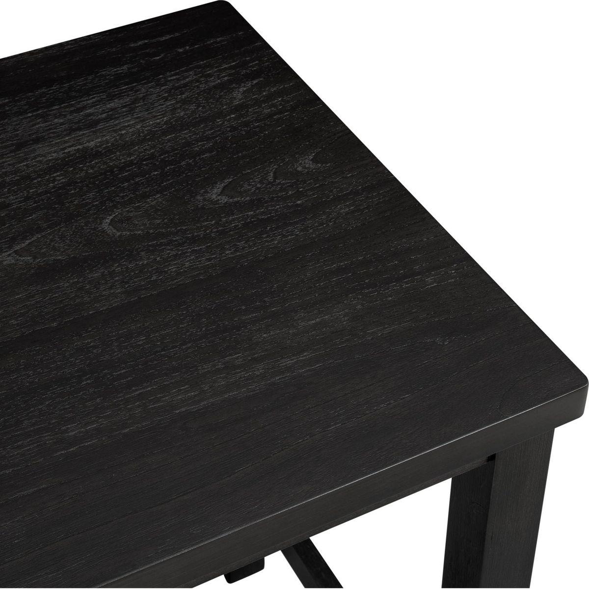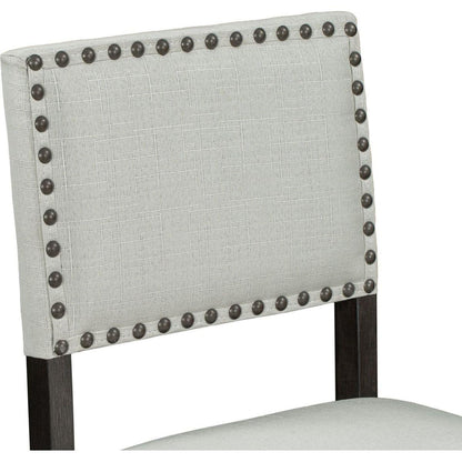 Enjoy the natural textured wood table in a classic long rectangle design that will make an impact in any space. Brass finished nail head trimming around the seat cushions and a flair of design while securing the fabric firmly to the seat for high durability.