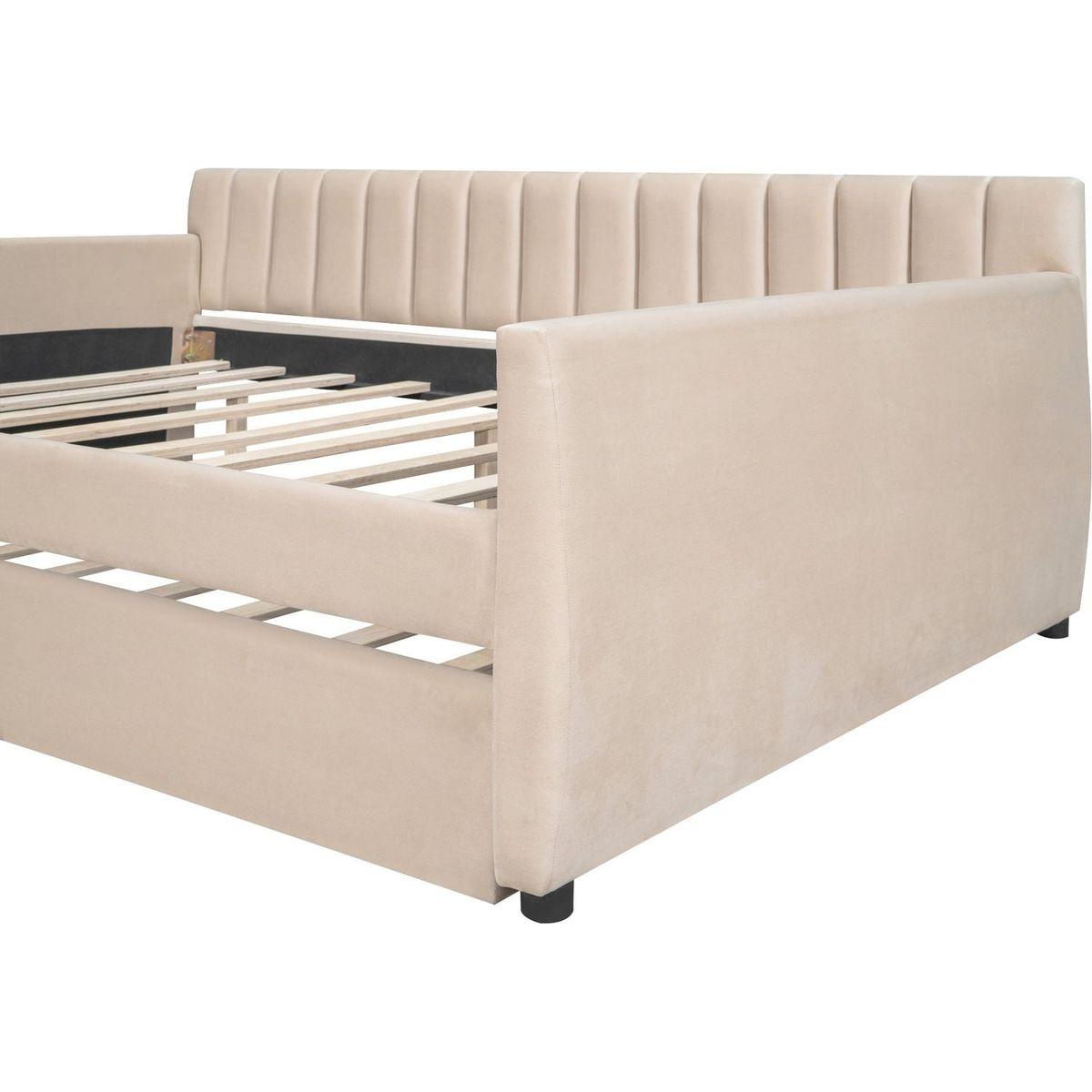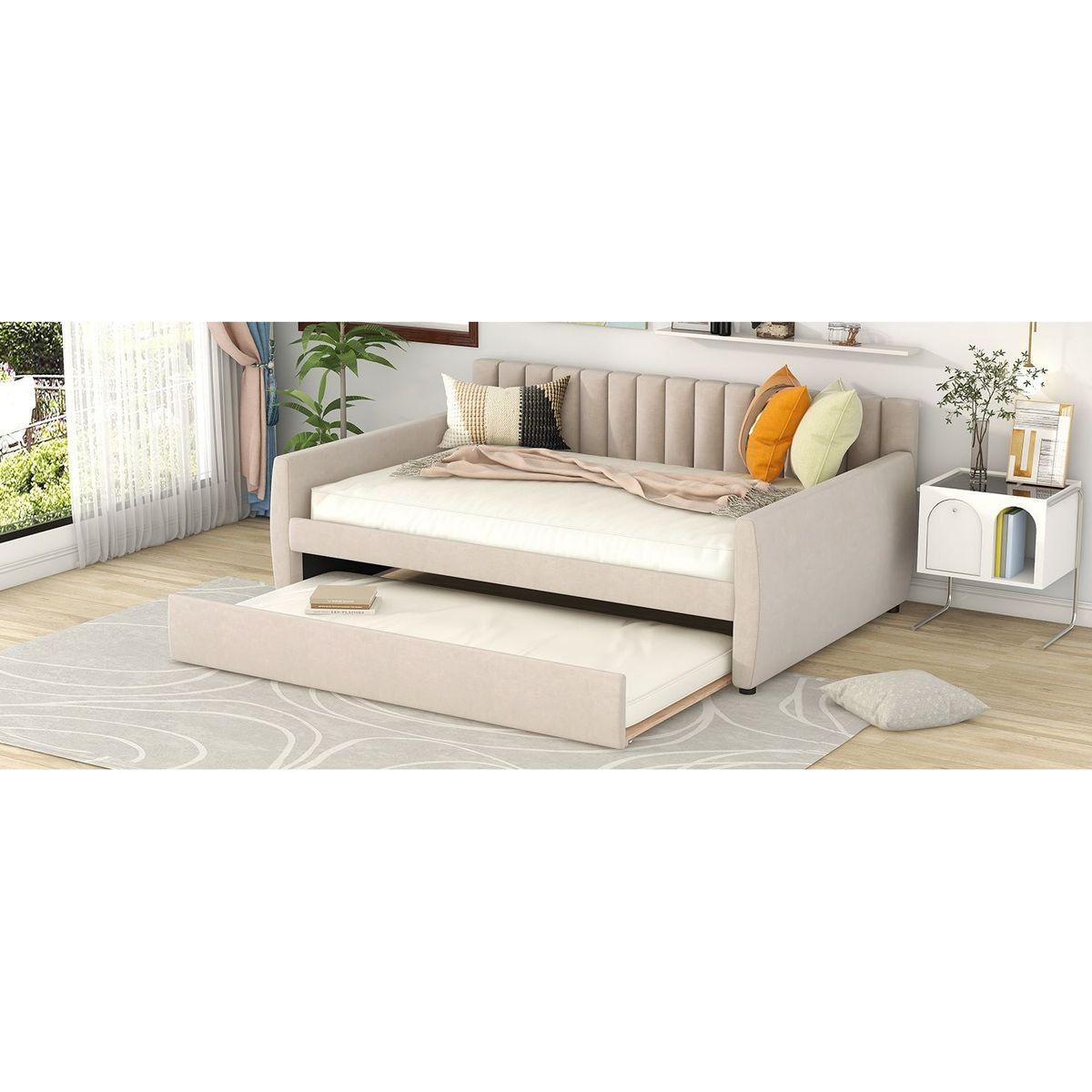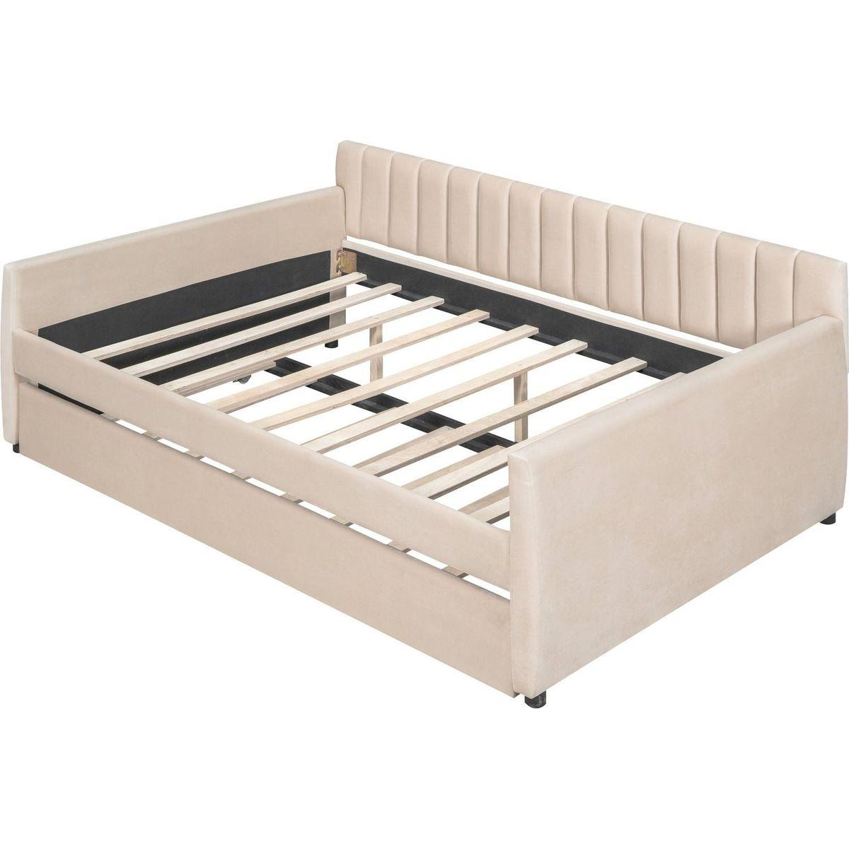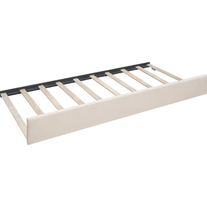 Full Size Upholstered daybed with Trundle and Wood Slat Support, Beige