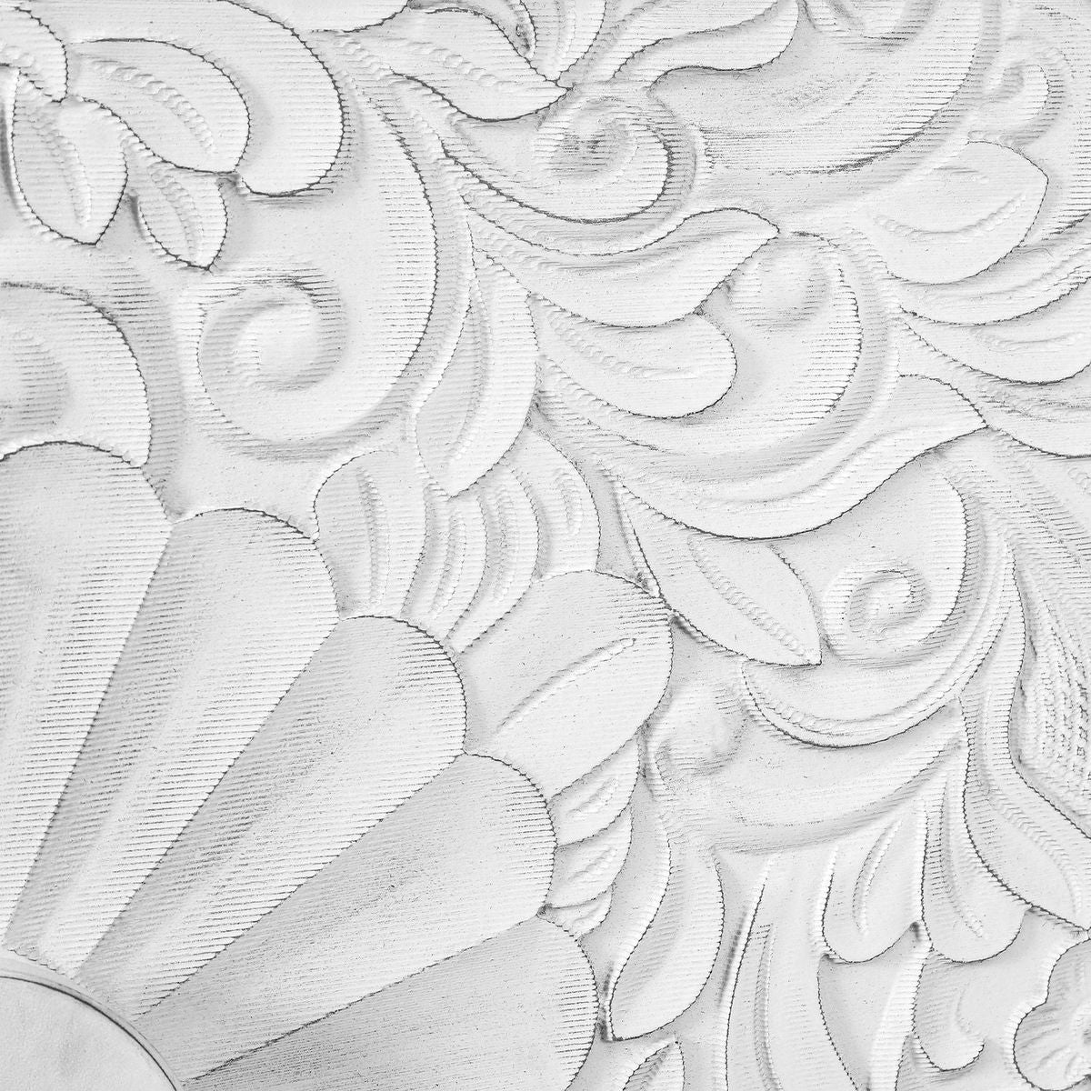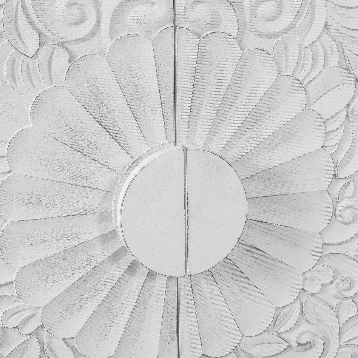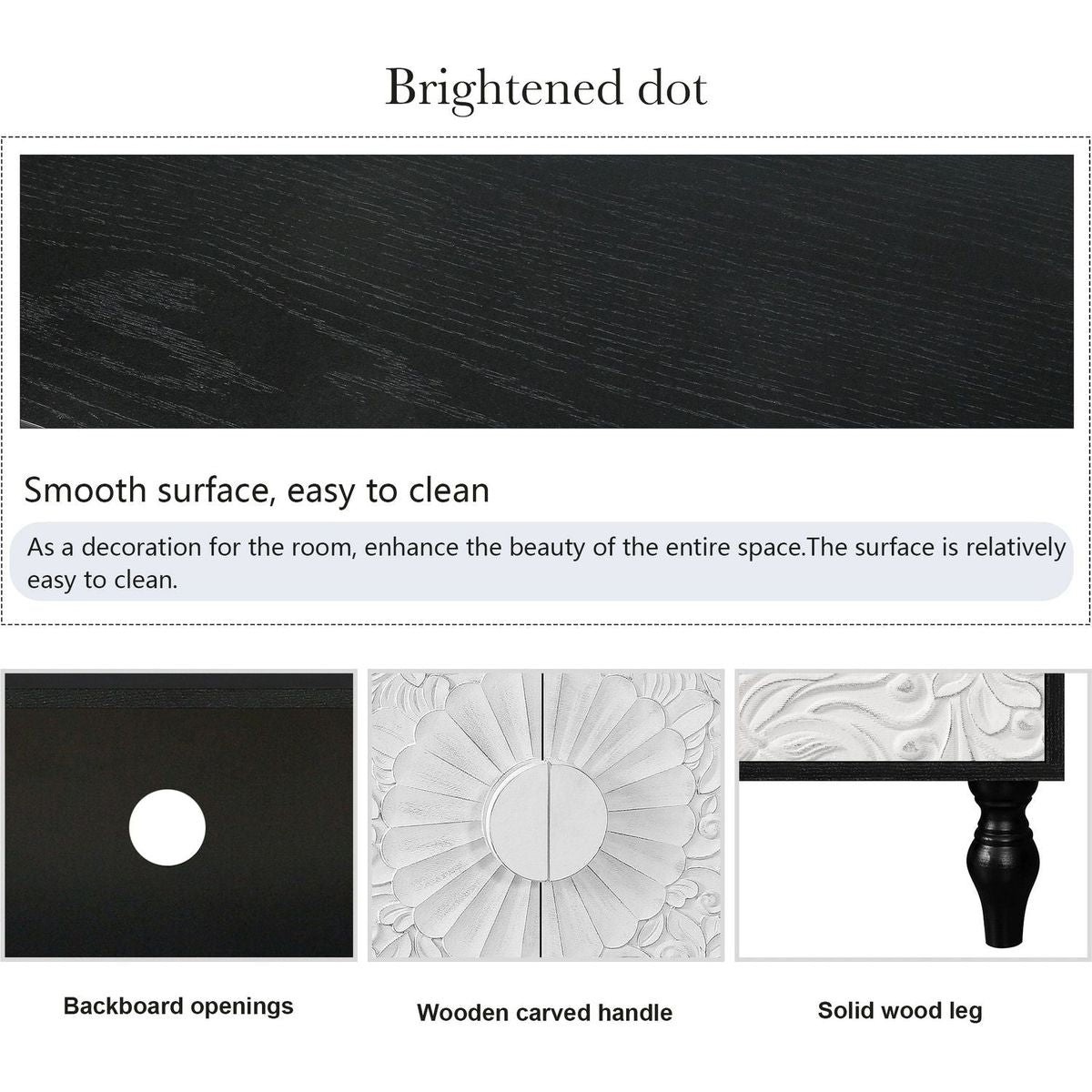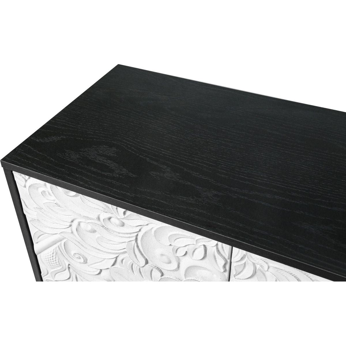 The entire piece of furniture using white carving flower door symmetrical design, so that the carving on the door and the handle highlights the sense of high-level design outside, together with the black glossy frame and Roman columns of the feet, can better highlight the whole furniture design effect bold, luxurious