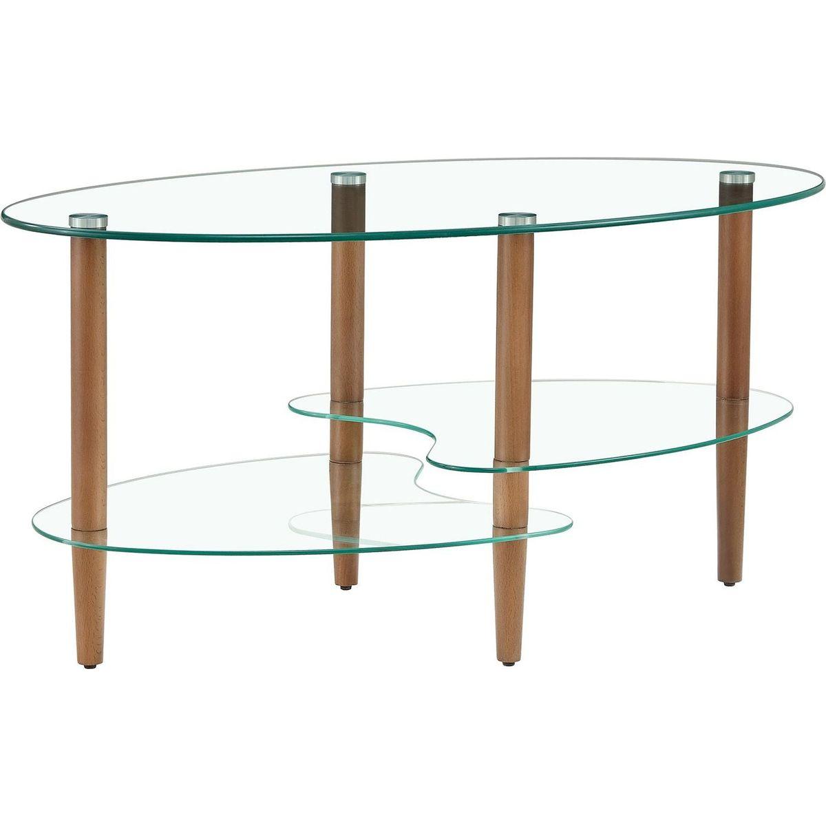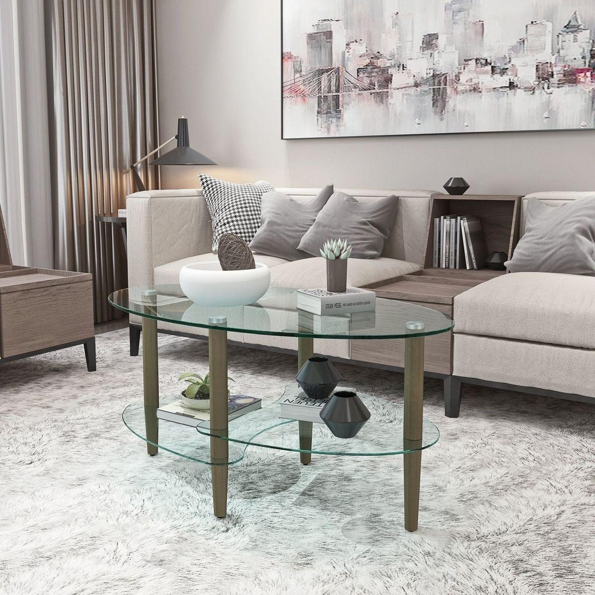 Transparent Oval glass coffee table, modern table in living room Oak wood leg tea table 3-layer glass table