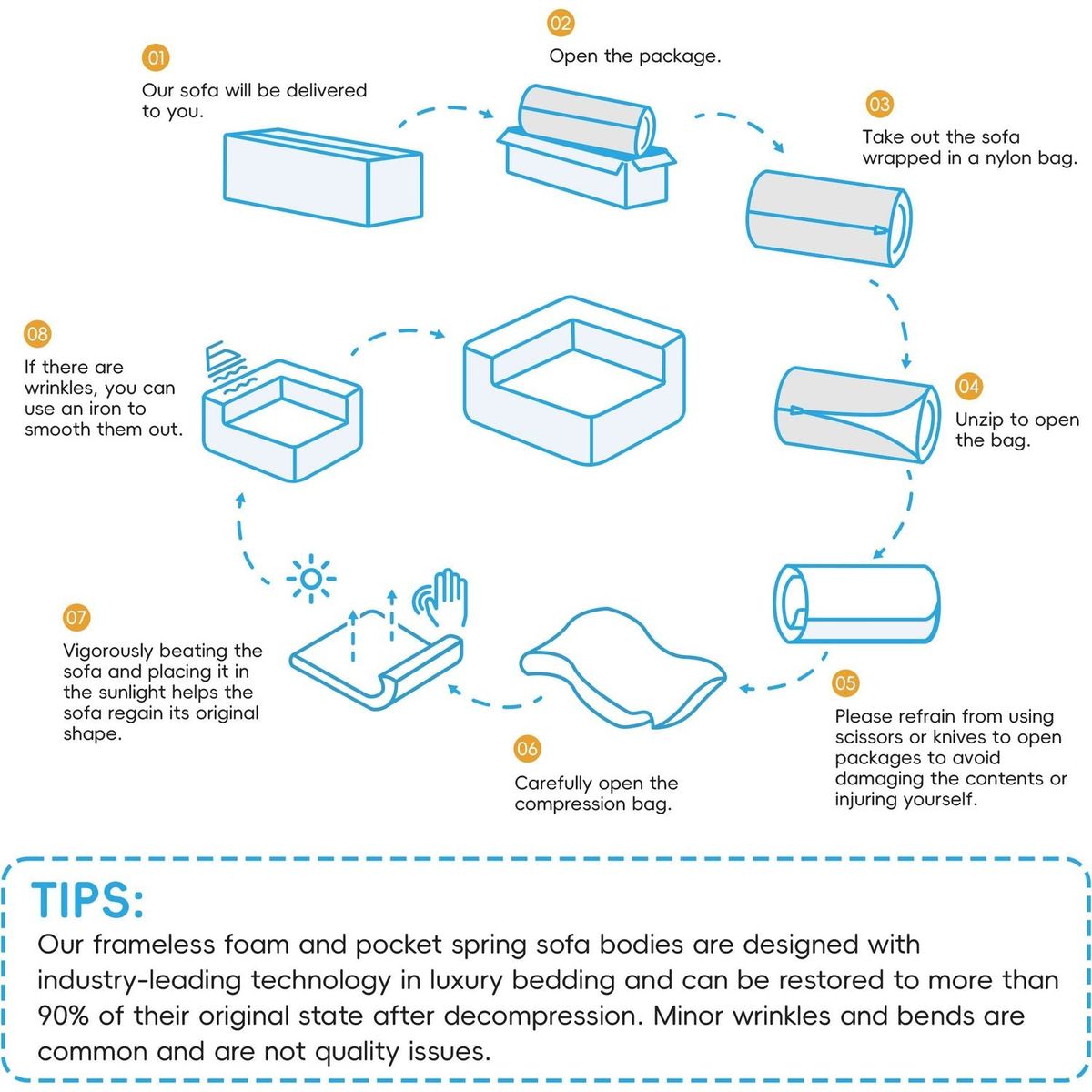 - No Assembly Required: The sofa's design eliminates the need for assembly, making it convenient and hassle-free. Upon delivery, you can immediately enjoy the sofa without the time-consuming process of putting it together. This saves you effort and ensures a seamless experience from the moment it arrives.It is important to note that the sofa needs to sit for 72 hours to a week after opening to ensure full rebound.