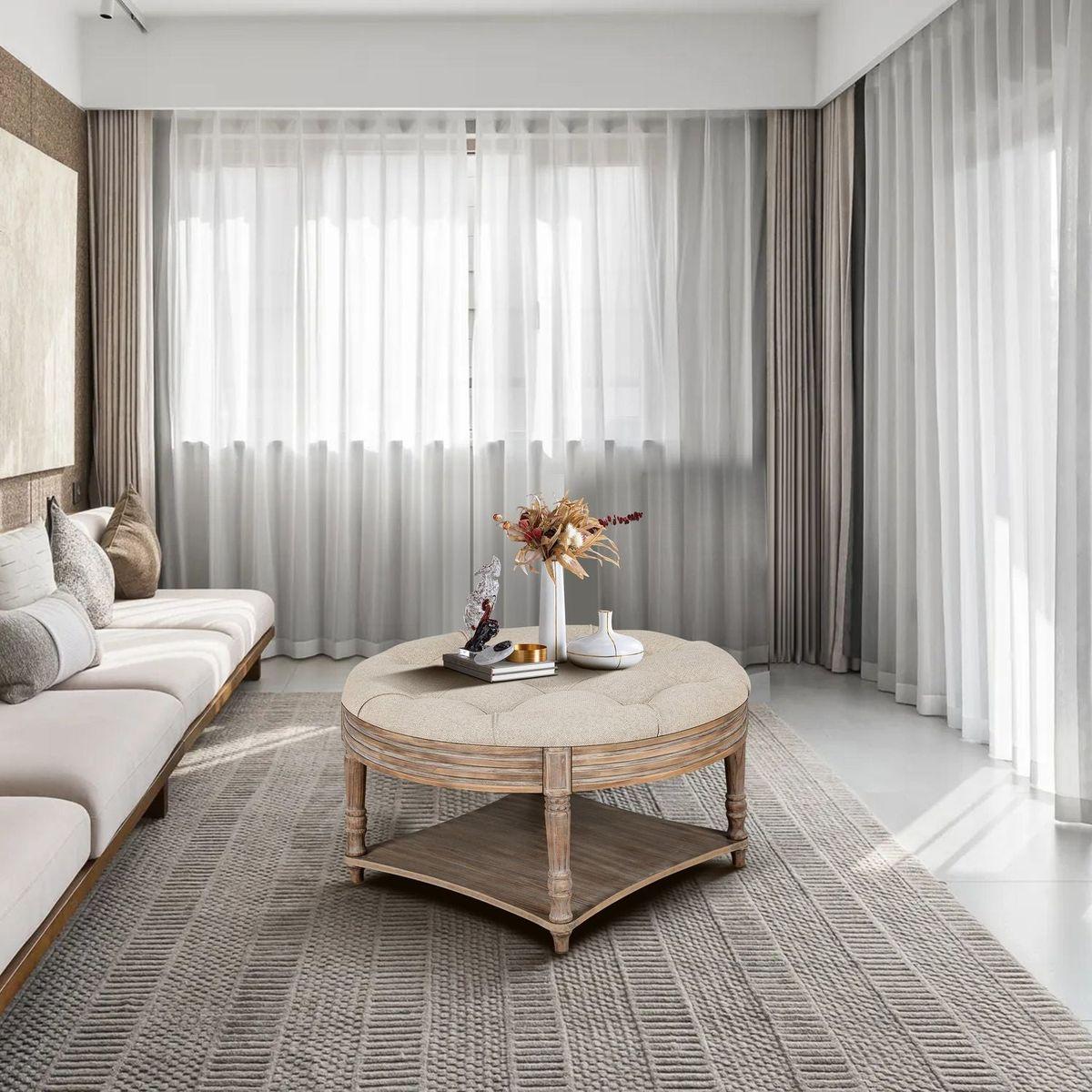 Large Round Ottoman Coffee Table 2 Tier Oversized Button Tufted Ottoman with Wooden Shelf Storage Farmhouse Upholstered Coffee Table Living Room Footstool Ottoman Linen