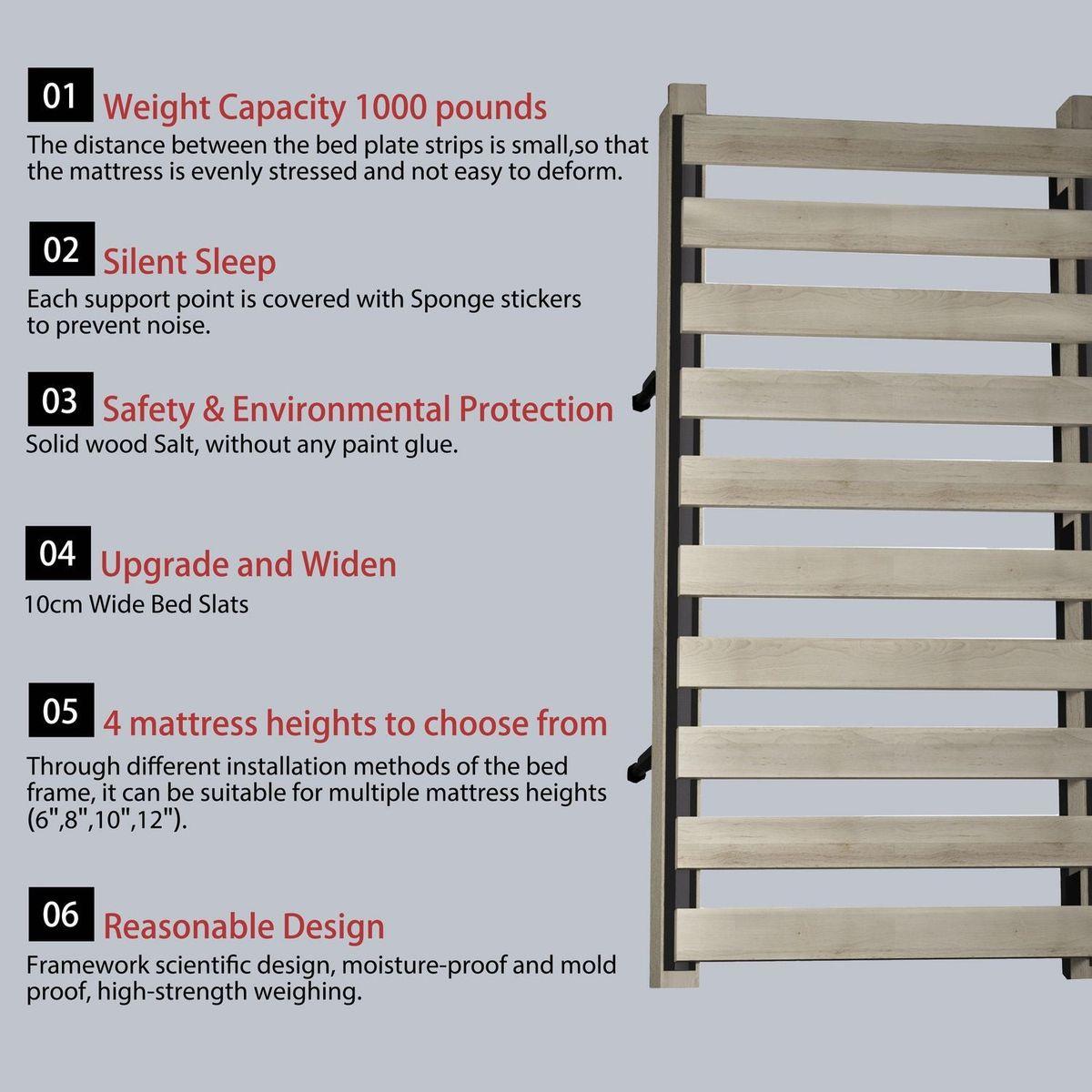 - [Solid & Sturdy]: The frame and slats are made of solid pine wood, which is hard, firm, corrosion resistant, not easy to deform and crack, and has a long service life. The bed slat structure consists of 20 widened slats, with a width of about 10cm, providing dense and powerful support for the weight of up to 1000 pounds. The solid wood feet are scientifically designed to withstand pressure and provide sturdy and stable support without deformation.