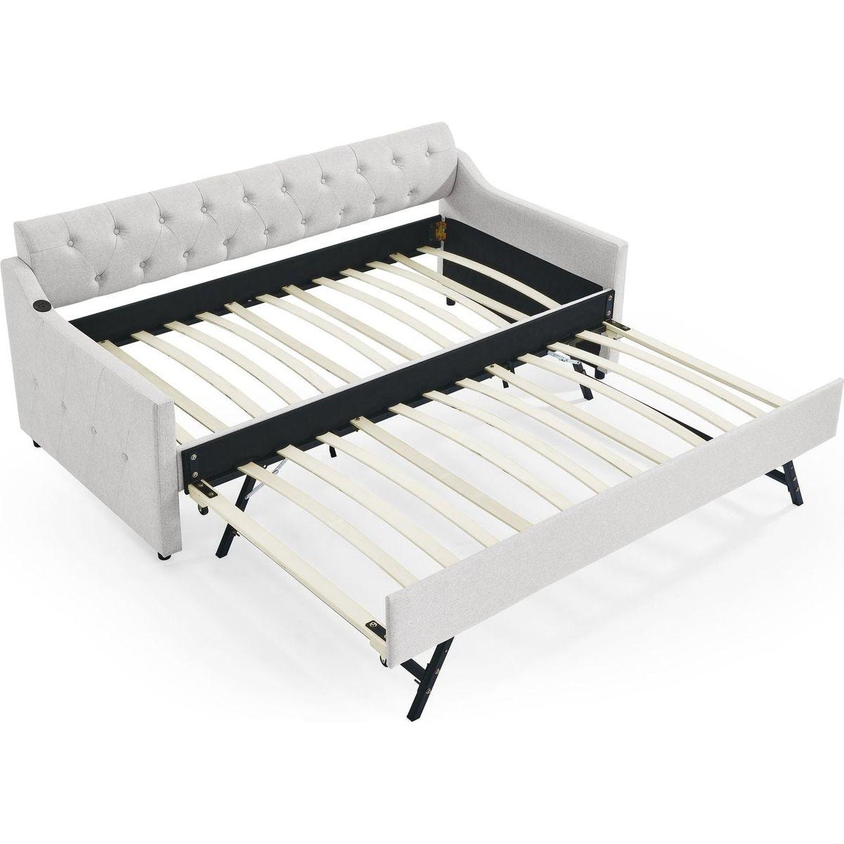 Twin Size Upholstery DayBed with Twin Size Erectable Trundle and USB Charging Design, Linen Beige