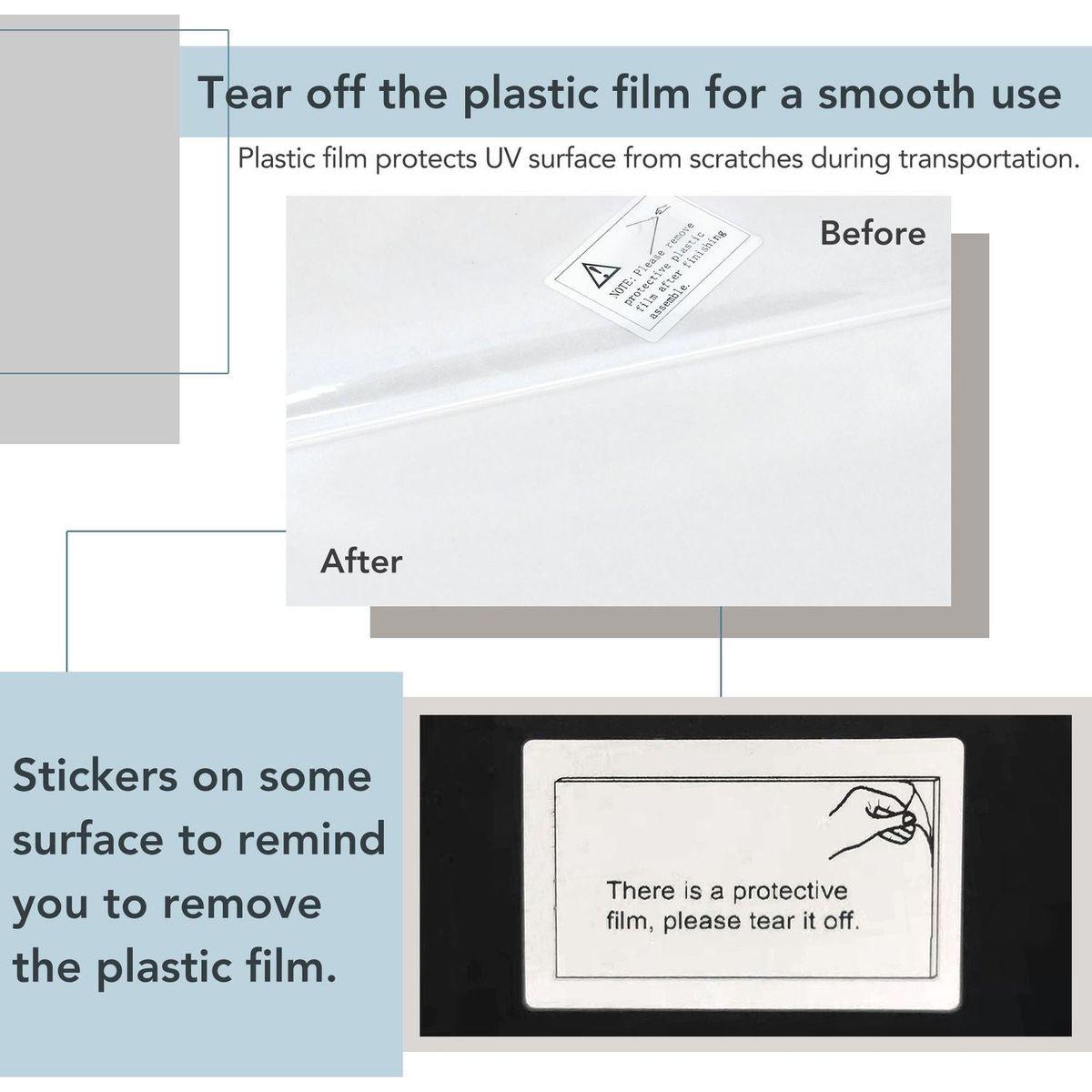 | Notice | The plastic film for protecting UV from scratches should be teared off before put into use. If there is light dust on the edge, it can be wiped with a wet rag. |