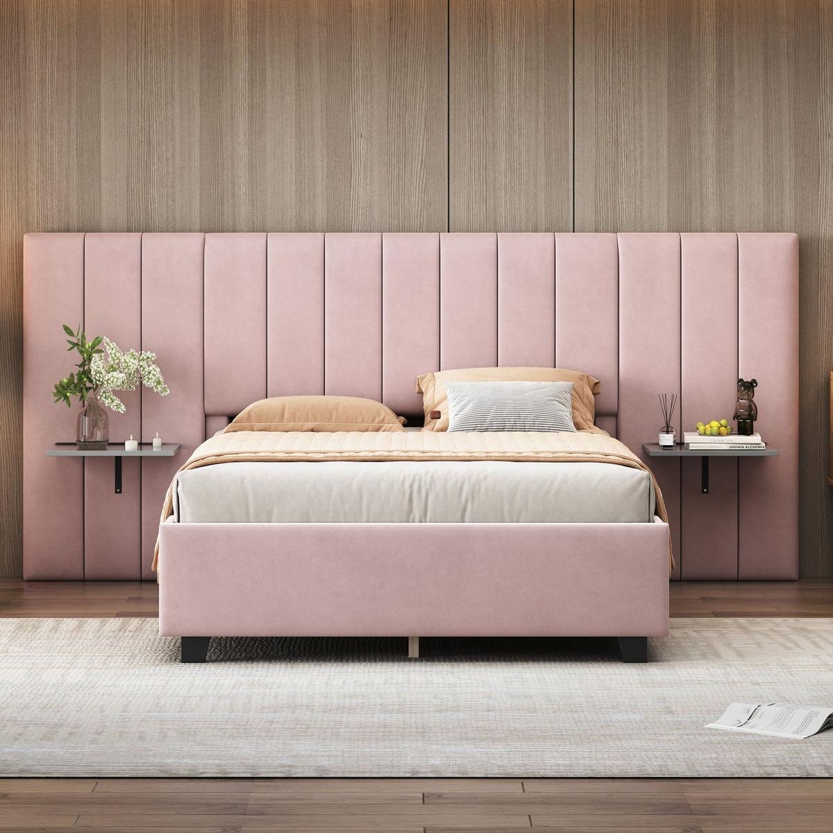 Full Size Upholstered Platform Bed with Big Headboard, Bedroom Furniture, Velvet, Pink
