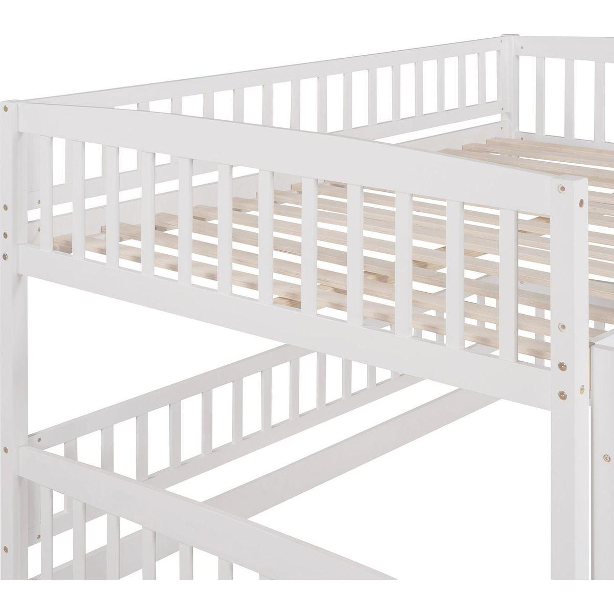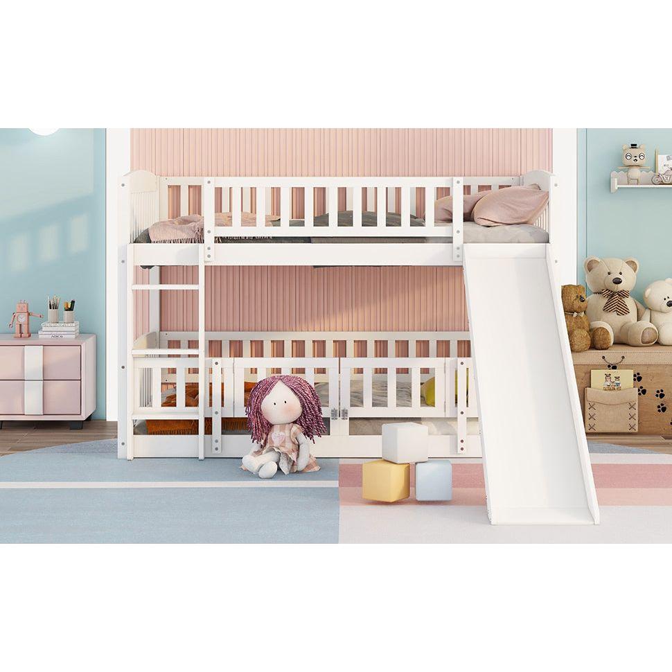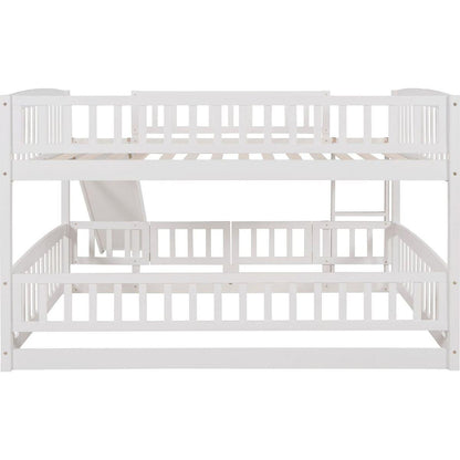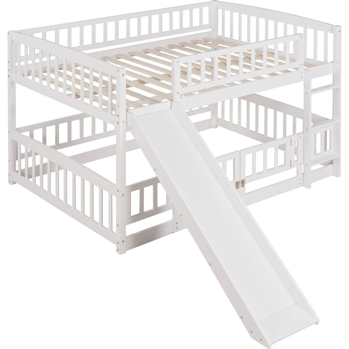 Bunk Bed with Slide, Full Over Full Low Bunk Bed with Fence and Ladder for Toddler Kids Teens White