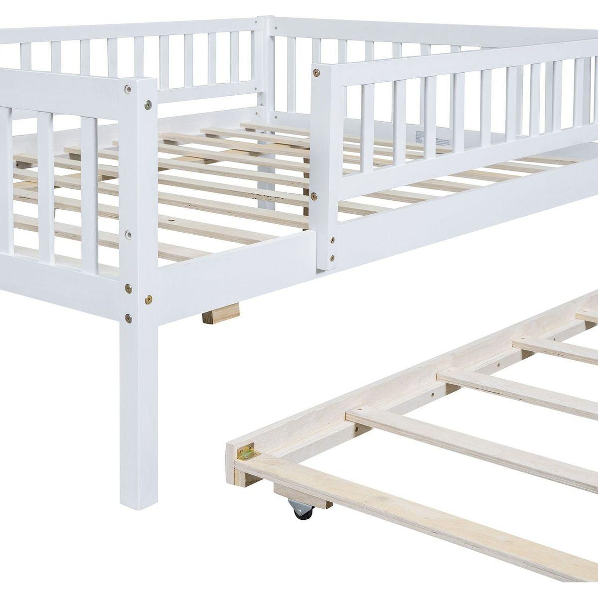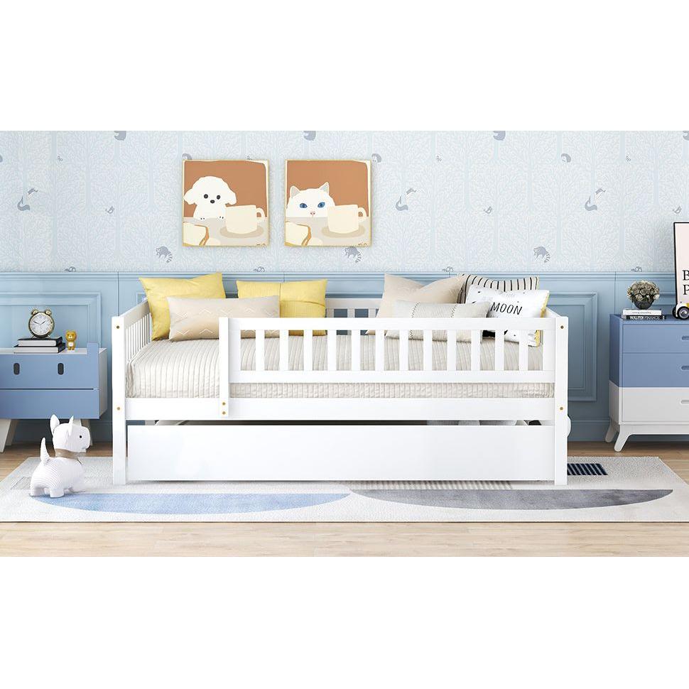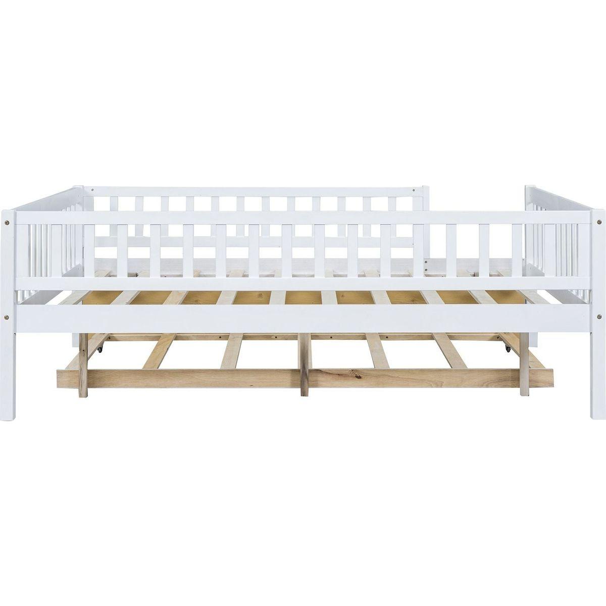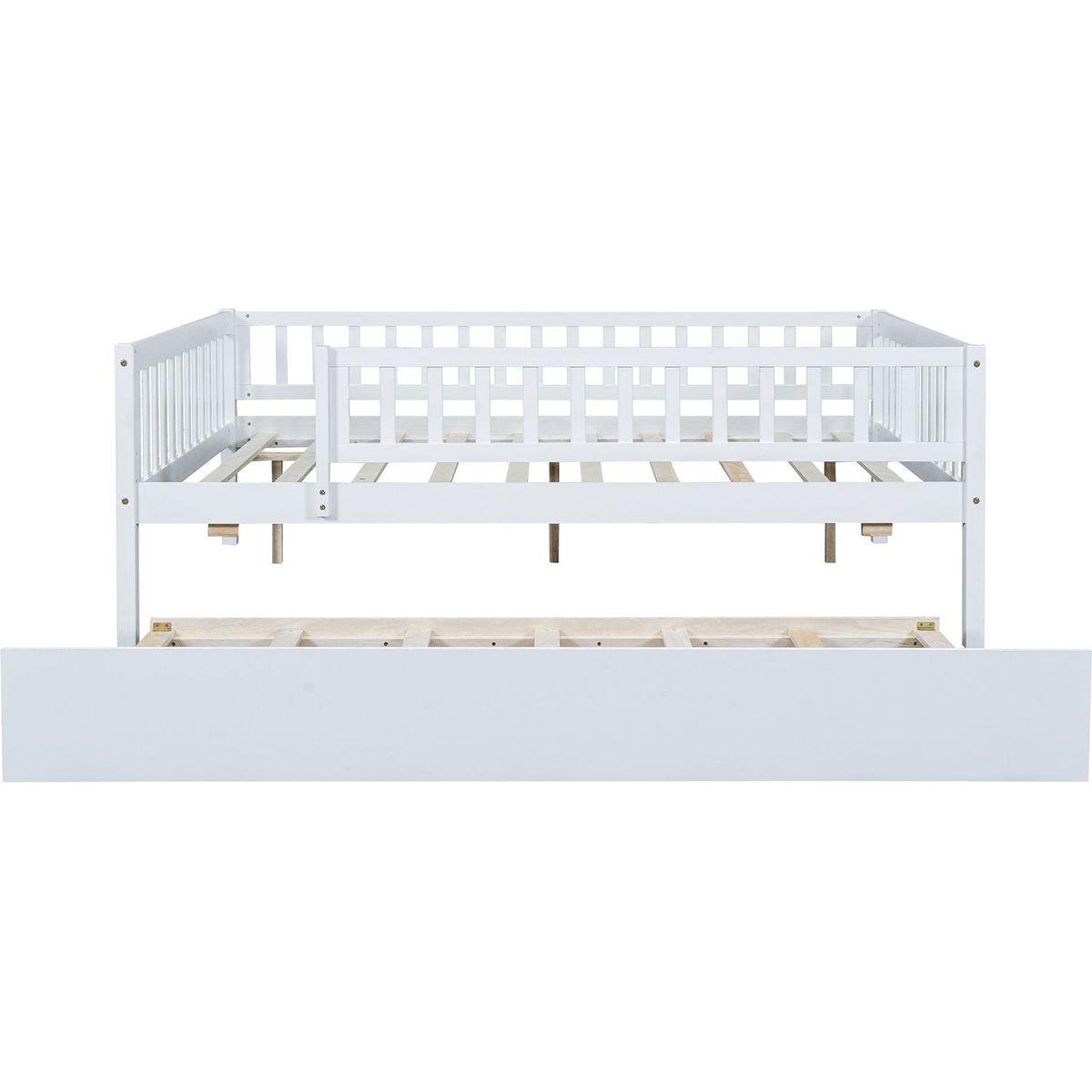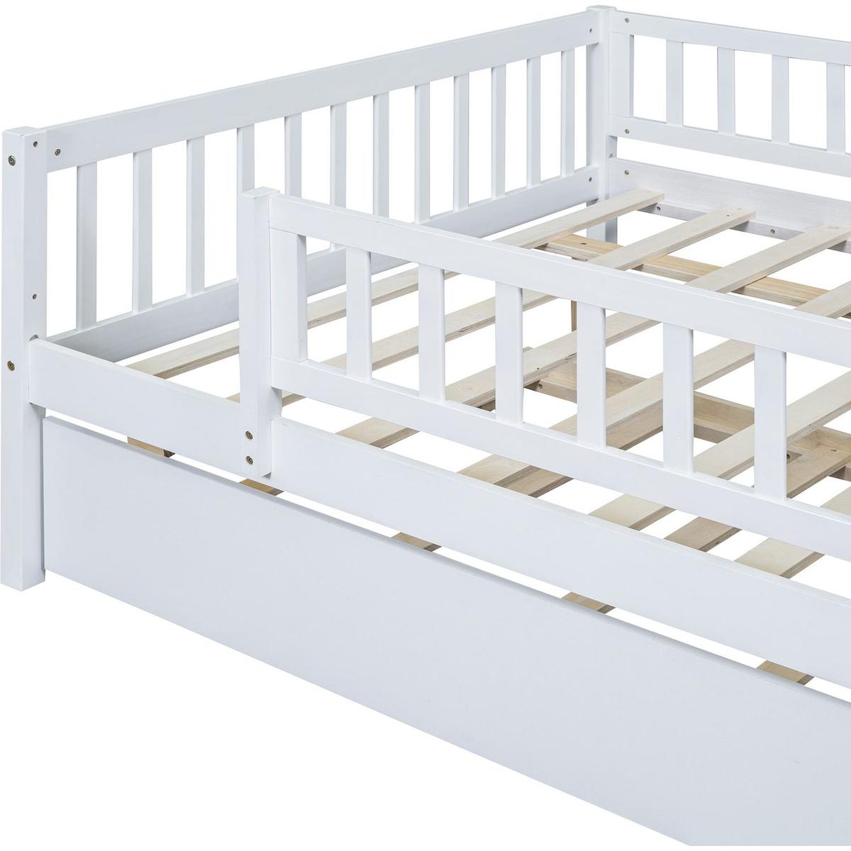 Full Size Wood Daybed with Trundle and Fence Guardrails, White