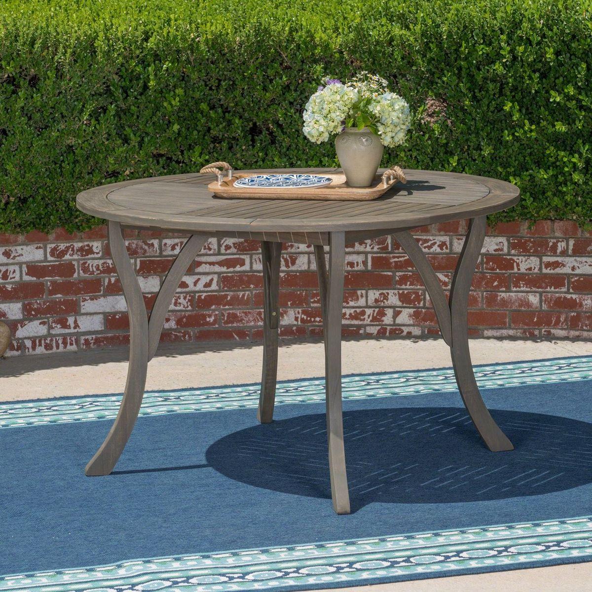 - Enjoy this stylish outdoor acacia wood table, prefect for any patio set up. Feature a beautiful teak finish, this circular table is a wonderful addition.