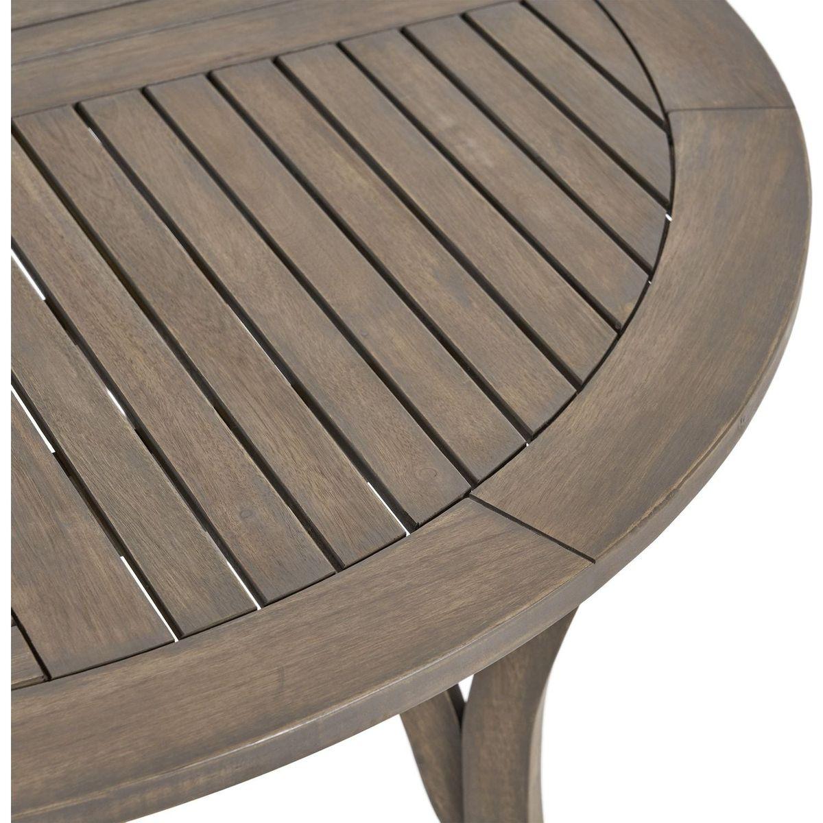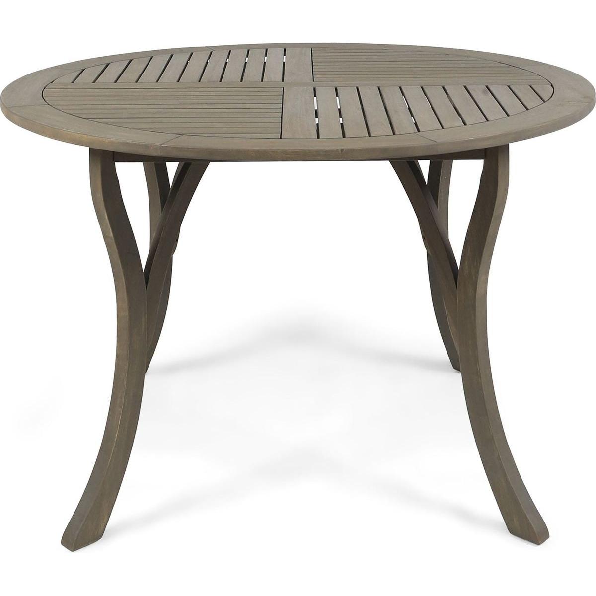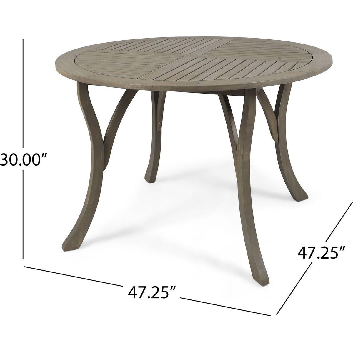 - Includes: One (1) Table. Material: Acacia Wood. Finish: Grey. Assembly Required
