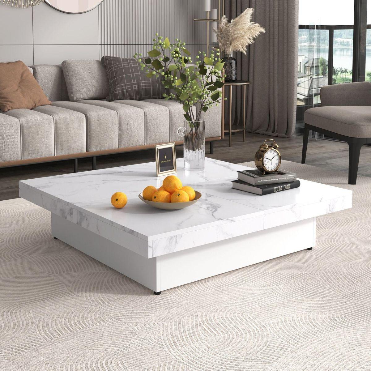 Square Marble Veneer Coffee Table Sliding Top with Storage in White 39.4''