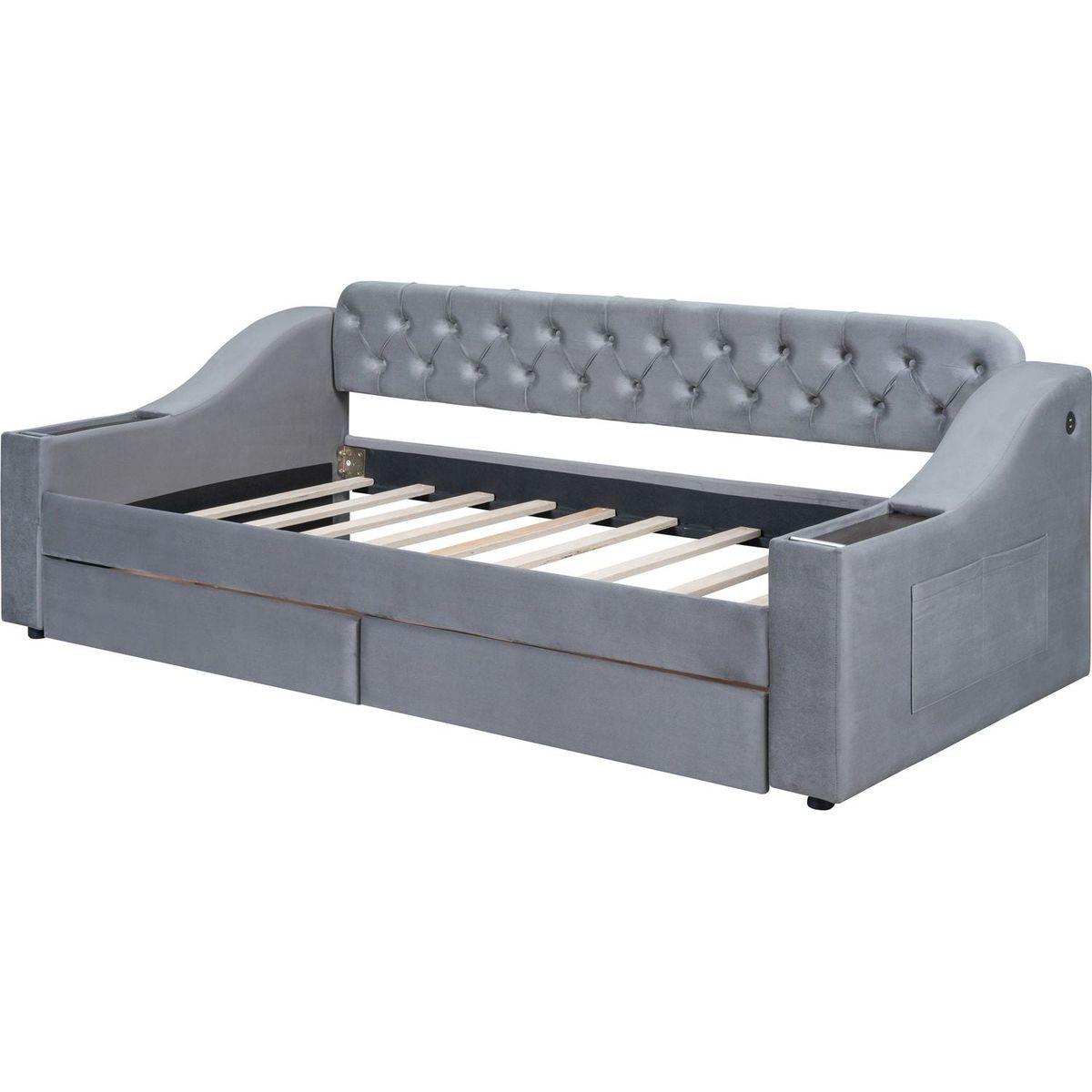 Twin Size Upholstered Daybed with Storage Armrests and USB Port, Gray