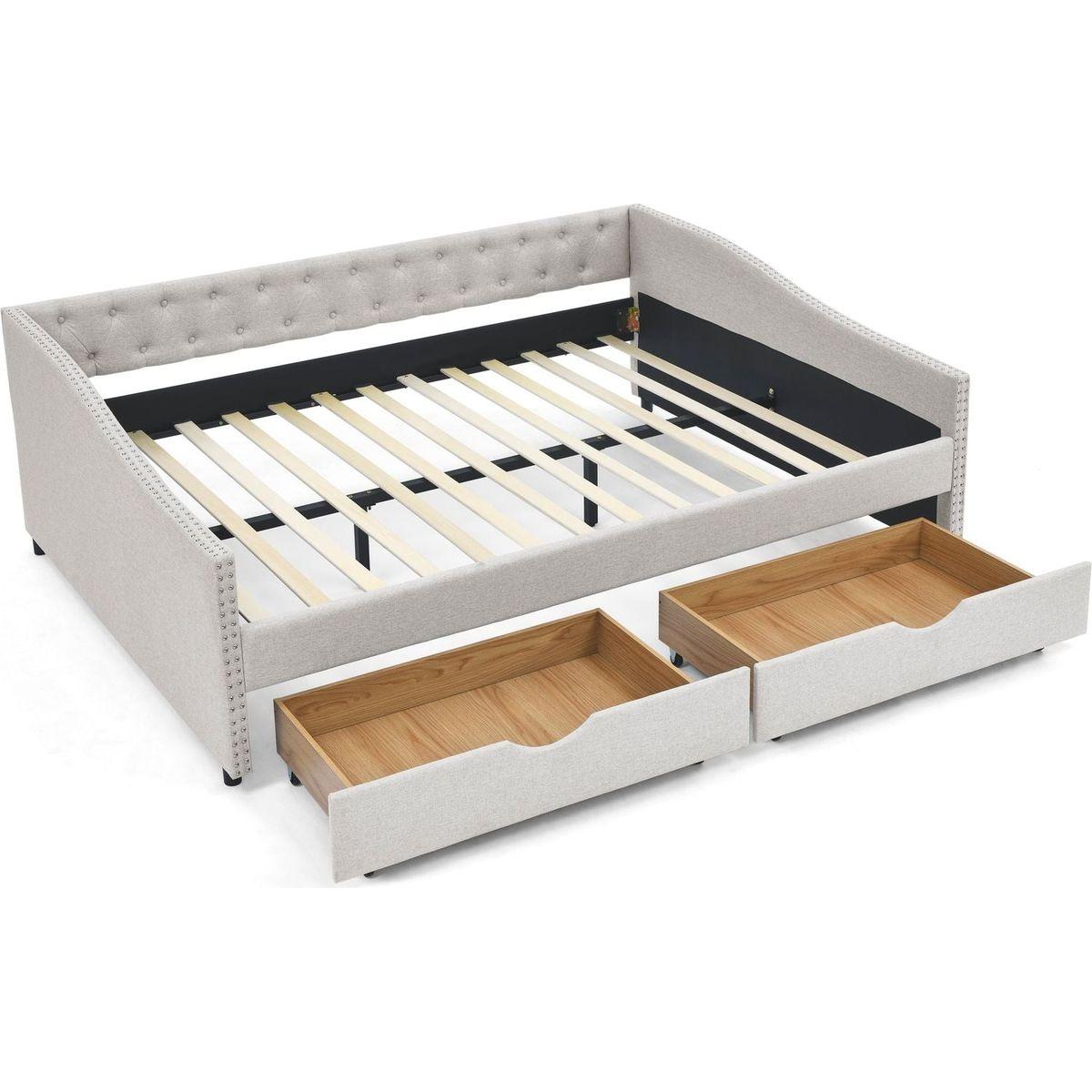 Queen Size Daybed with Drawers Upholstered Tufted Sofa Bed,,with Button on Back and Copper Nail on Waved Shape Arms, Beige (84.5"x63.5"x26.5")