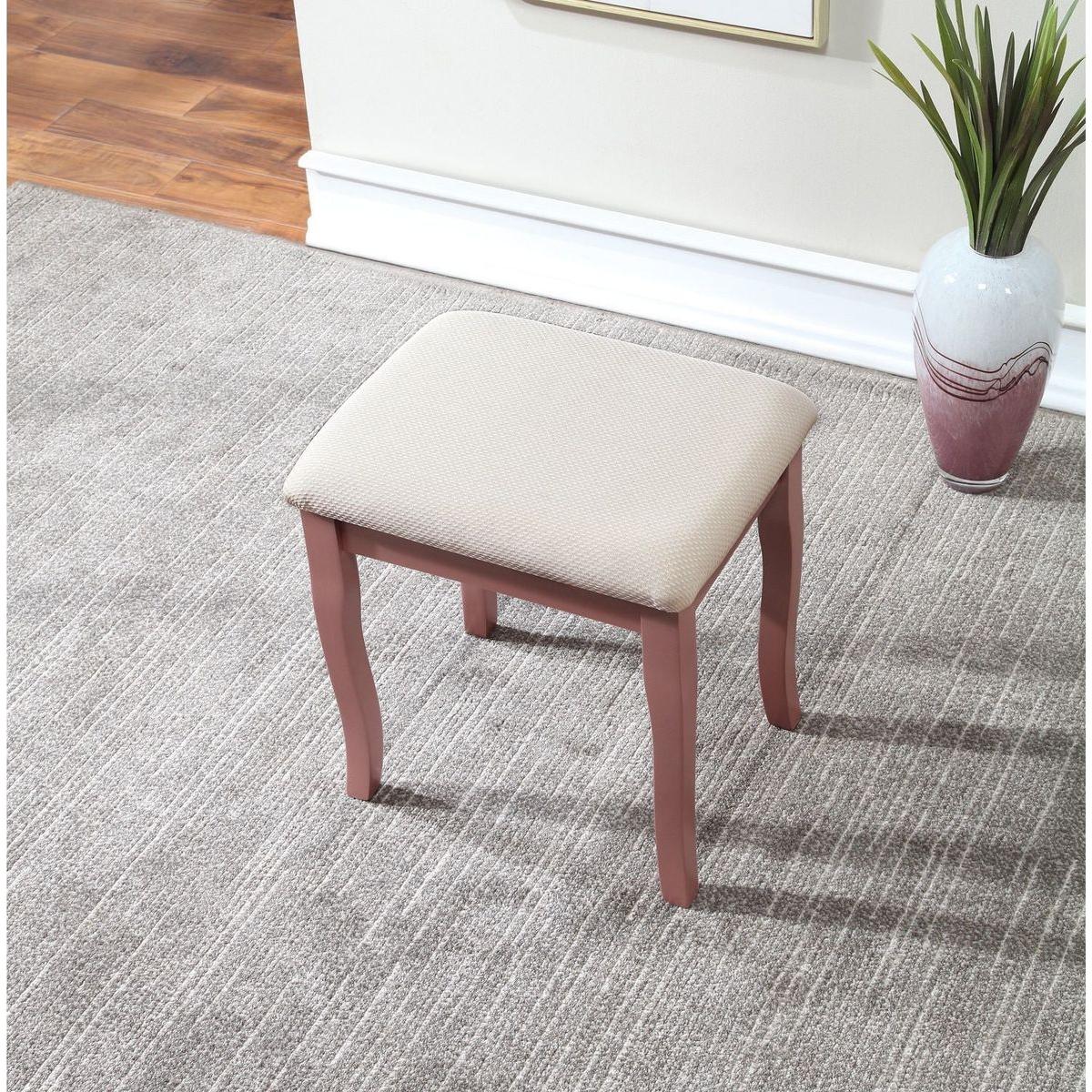 - Durable wood construction with a rose gold finish. Set includes vanity, mirror, and bench