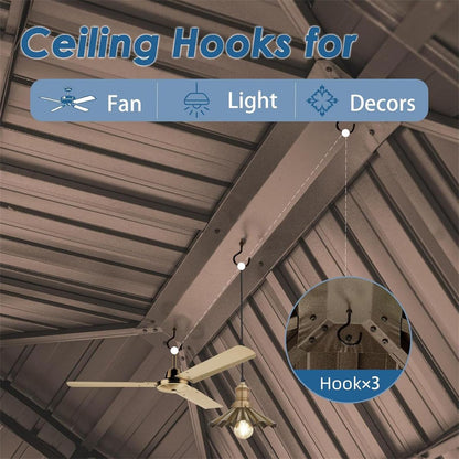 - Effortless Ambiance with Strong Hooks - Enhance your hardtop gazebo's versatility with 3 robust hooks! Each hook effortlessly holds up to 20 lbs, allowing you to hang lights, fans, or decorations effortlessly. Create your perfect outdoor atmosphere with ease.