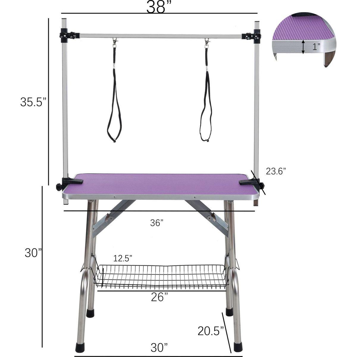 36" Folding Dog Pet Grooming Table Stainless Steel Frame Rubber Mat on Board with Adjustable Arm and Clamps pet dog Cat Grooming Table (PURPLE COLOR)