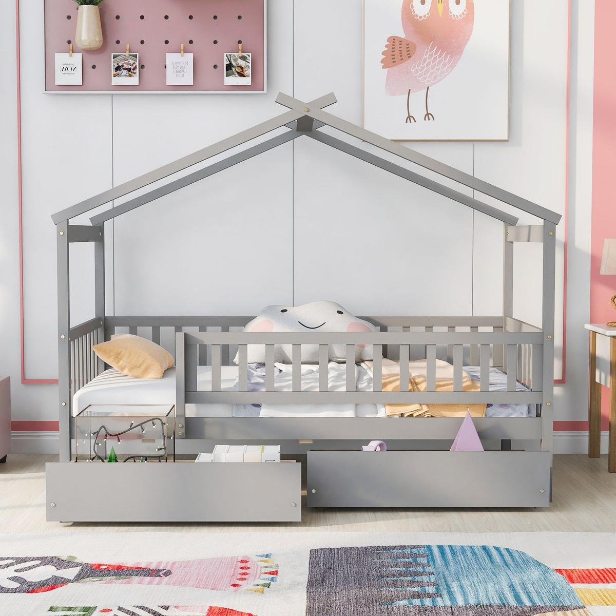 Twin Size Wooden House Bed with Two Drawers, Gray