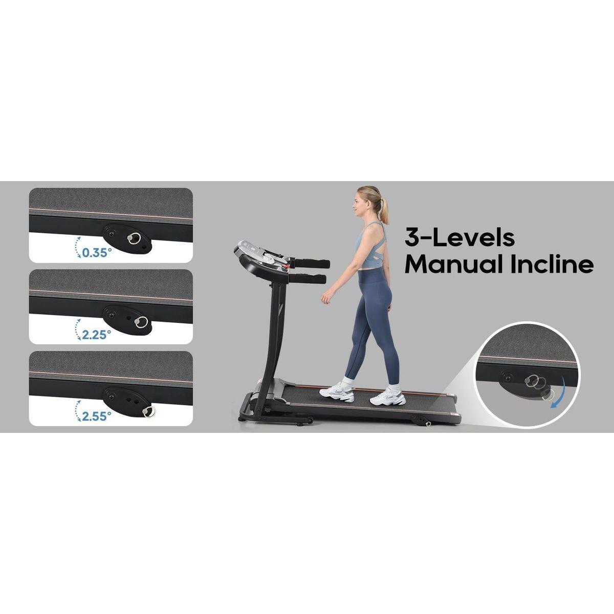 INCLINE TREADMILL: Customize the intensity of your workout with 3 different manual incline positions. Simulate the challenge of running uphill and feel the burn in your leg muscles as you push yourself to new heights.