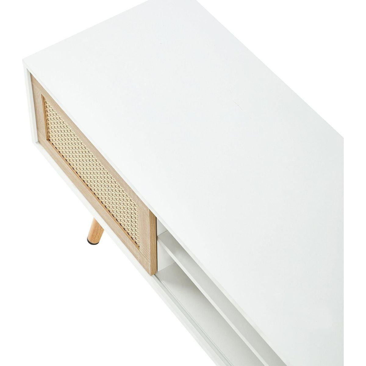 55.12" Rattan TV cabinet, double sliding doors for storage, adjustable shelf, solid wood legs, TV console for living room, White