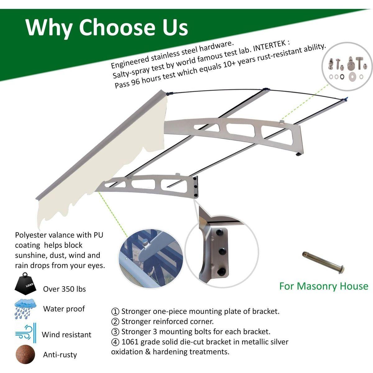 - 【HEAVY-DUTY BRACKETS】The brackets of awning are made of die-cut 1061 engineered Aluminum with hardness processing and oxidation finishing. The material are rust resistant and capable of providing strong, durable supporting for the awning against heavy snow and strong wind.