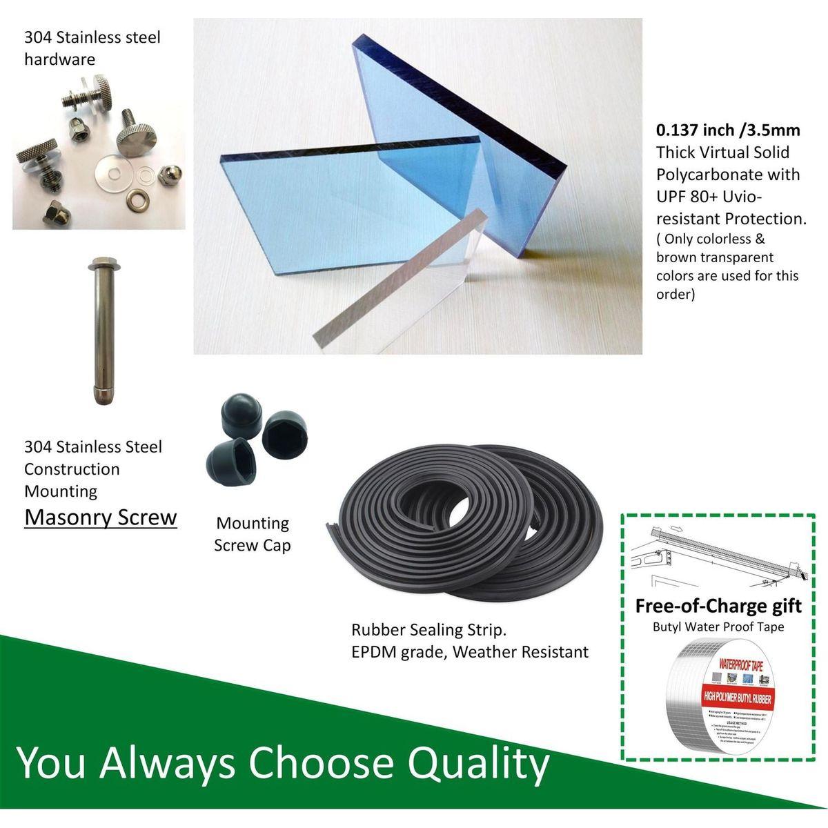- 【PREMIUM QUALITY SOLID POLYCARBONATE ROOF】DA5934C Series door window awning canopy uses 0.137"/3.5mm thick virtually solid polycarbonate panel with UPF80+ Ultraviolet ray protection. The awning canopy is tested independently INTERTEK proving to be capable of affording the loading over 350lbs. DA5934C Series are only for masonry concrete wall house.