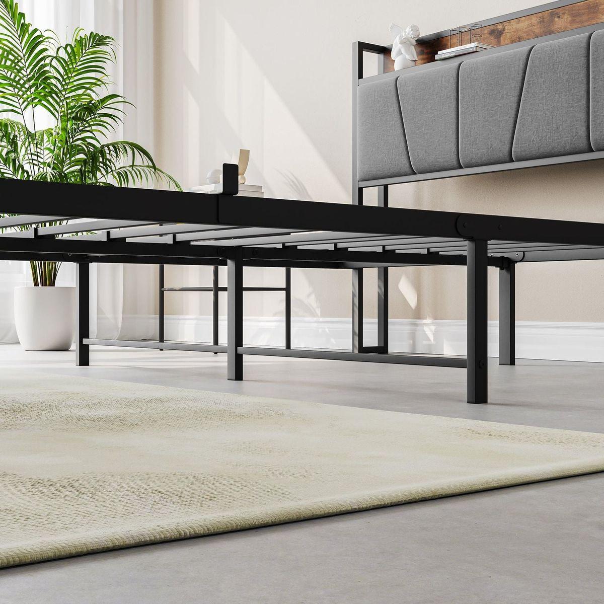 - The bed headboard is built-in with 2 outlets and 2 USB. Convenient for you to place iPhone/Android and other devices on it. The bed frame with a storage shelf helps you easy to find your phone, turn off the alarm clock, and get stuff you need while enjoyably lying on the bed.
