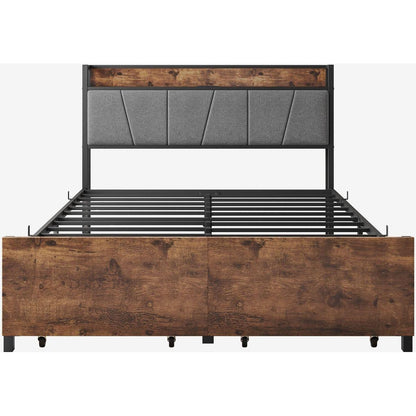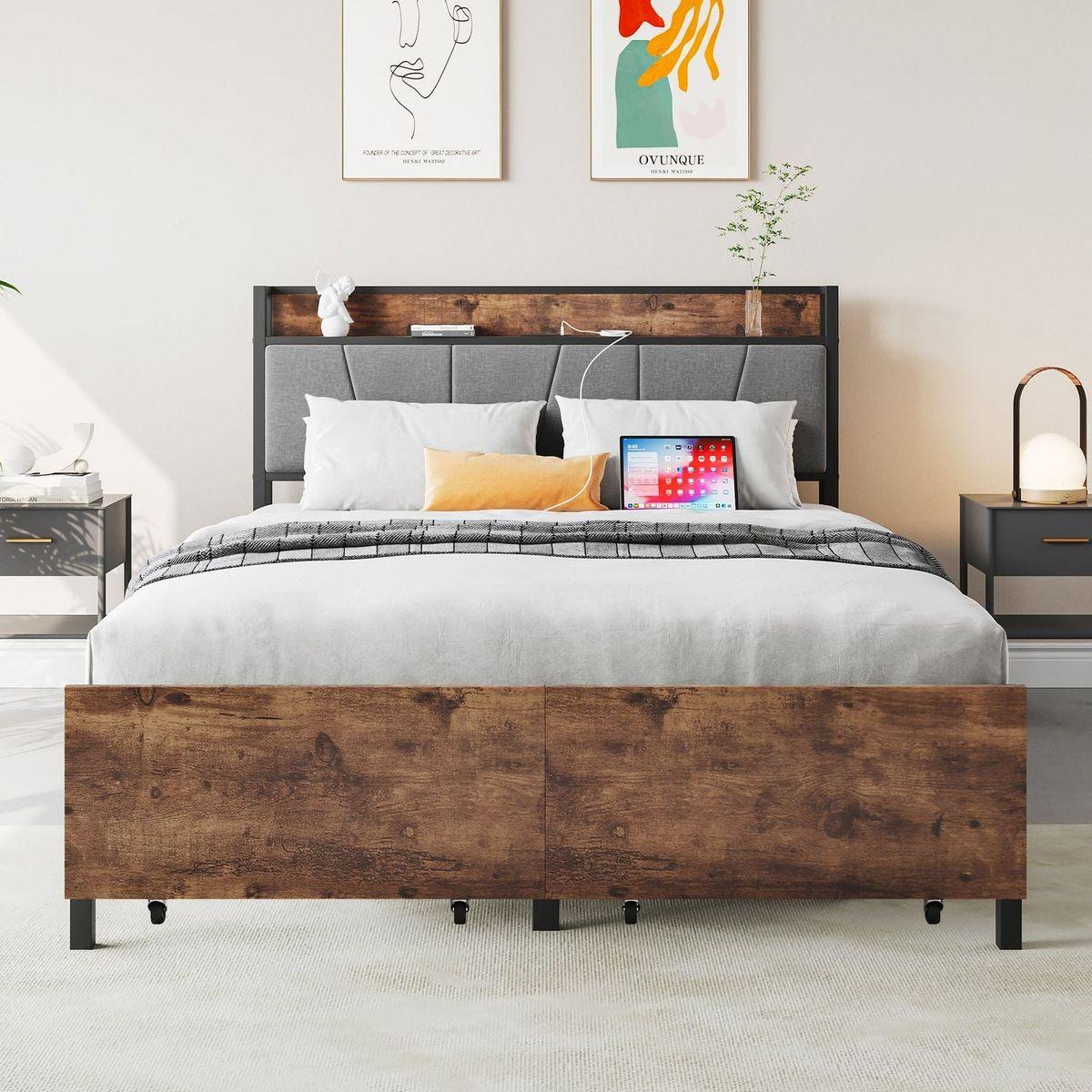 Full Size Bed Frame, Storage Headboard with Charging Station and 2 Storage Drawers, Solid and Stable, Noise Free, No Box Spring Needed, Easy Assembly,Vintage Brown and Gray