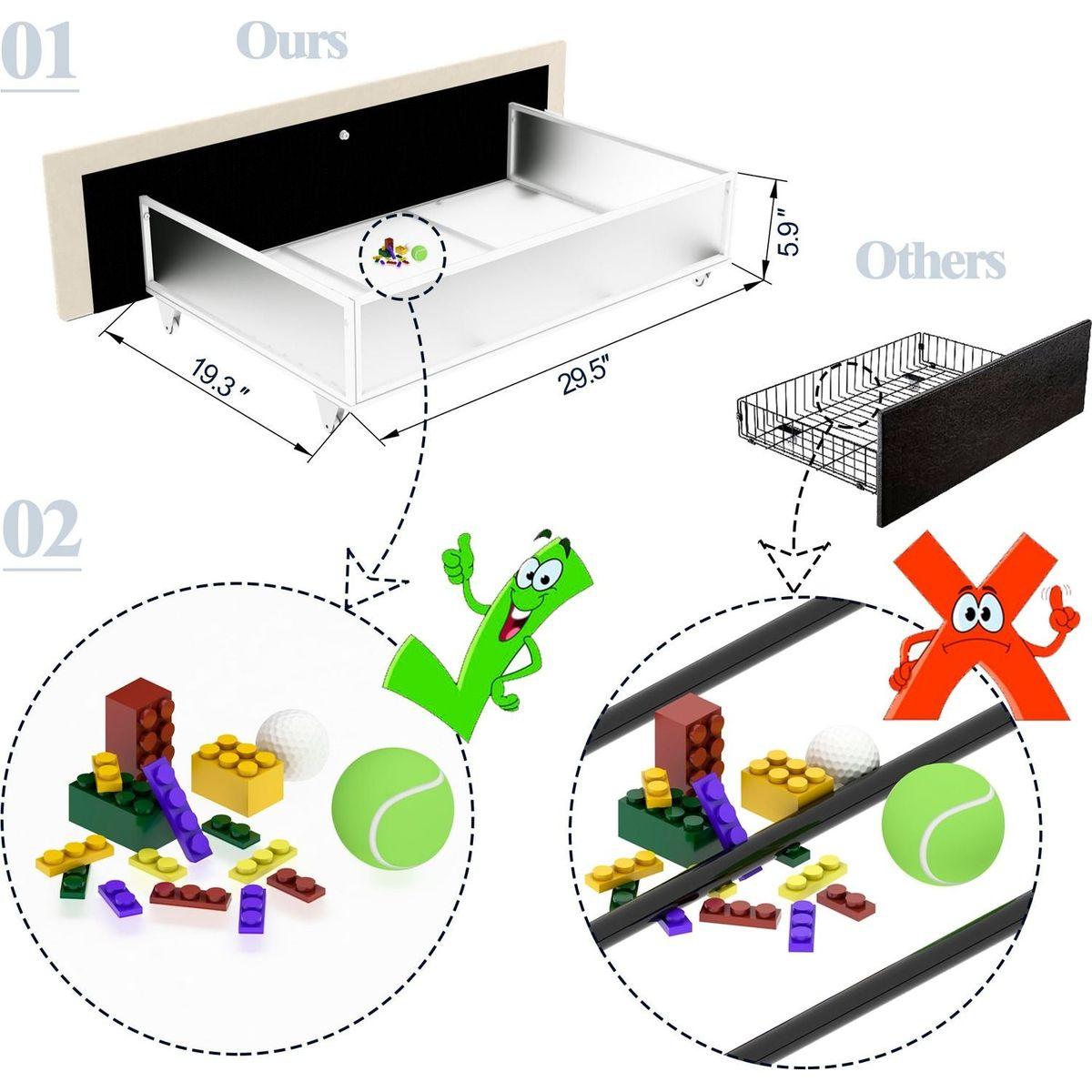 • The 2 built-in plastic-lined drawers are designed to hold belongings of any size, ranging from small kids toys to freshly stacked bedding sheets. And keep your belongings dust-proof. This is superior to other wire drawers as it can hold personal items of any size as well as protect the stored items from dust. The drawers are also built with square tubing metal frames to support a weight capacity of 40LBS per drawer. Dimension is 29.5" x 19.3" x 5.9".
