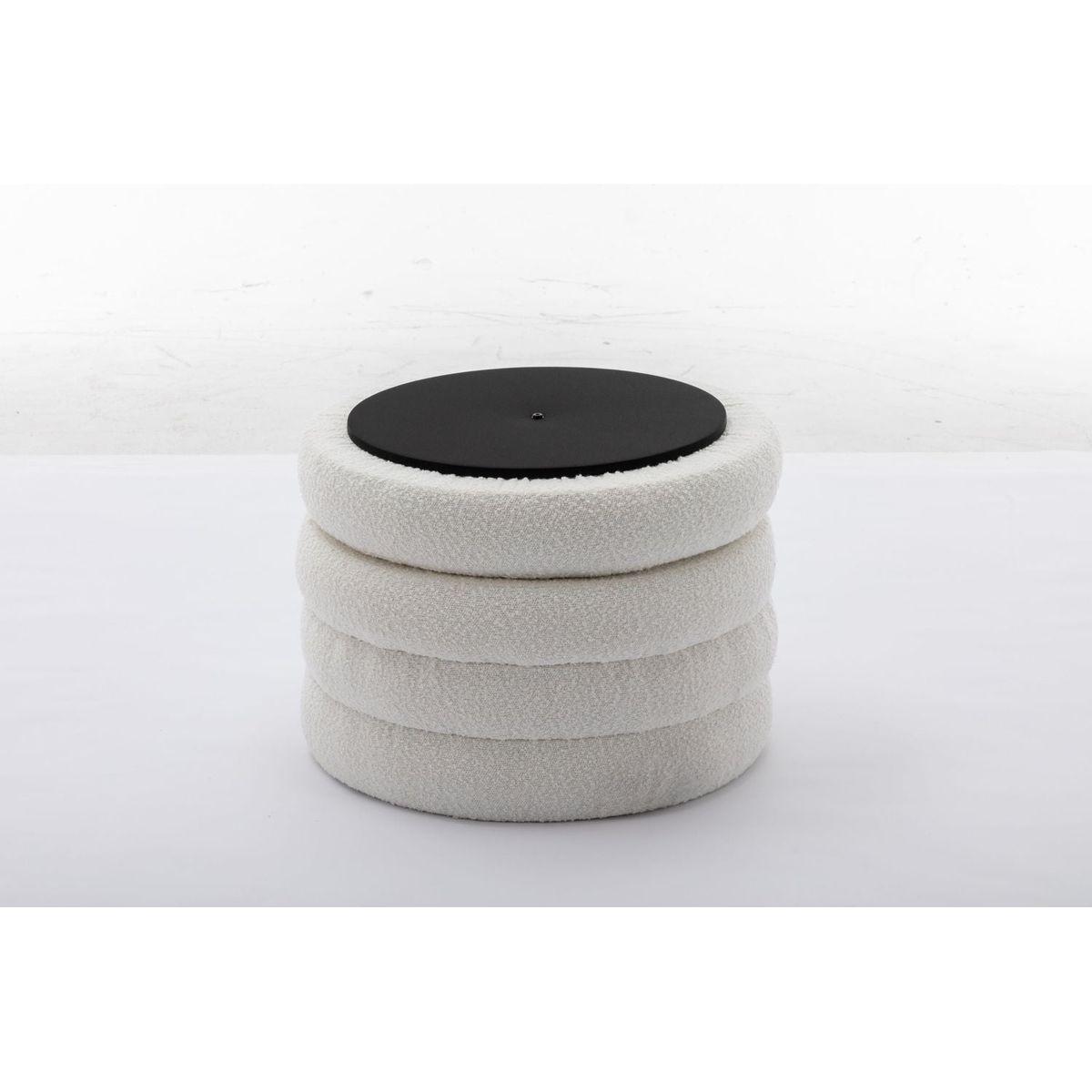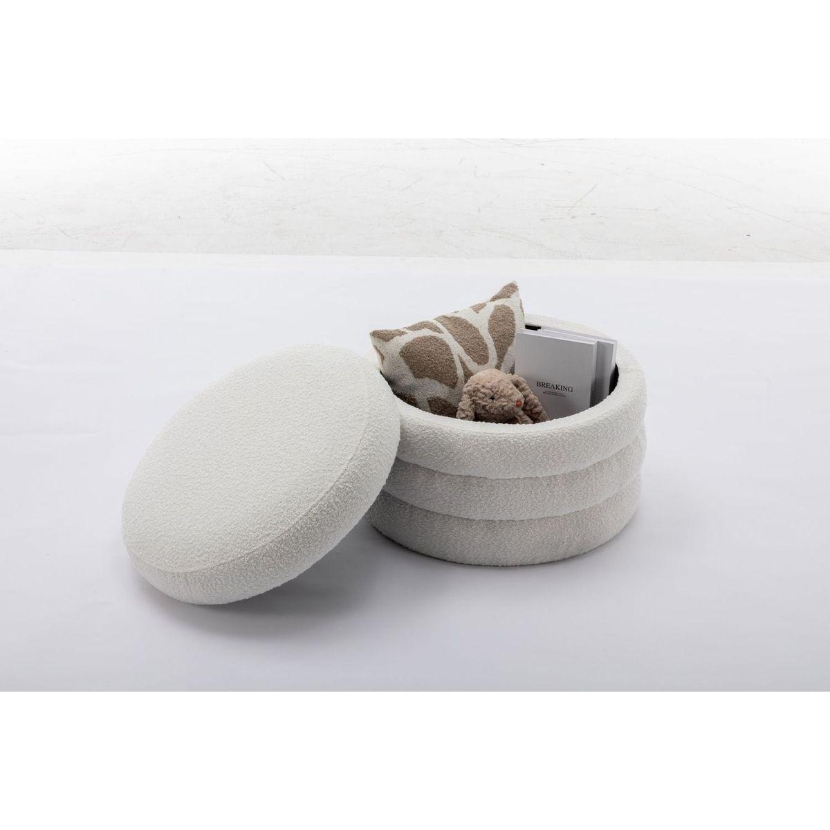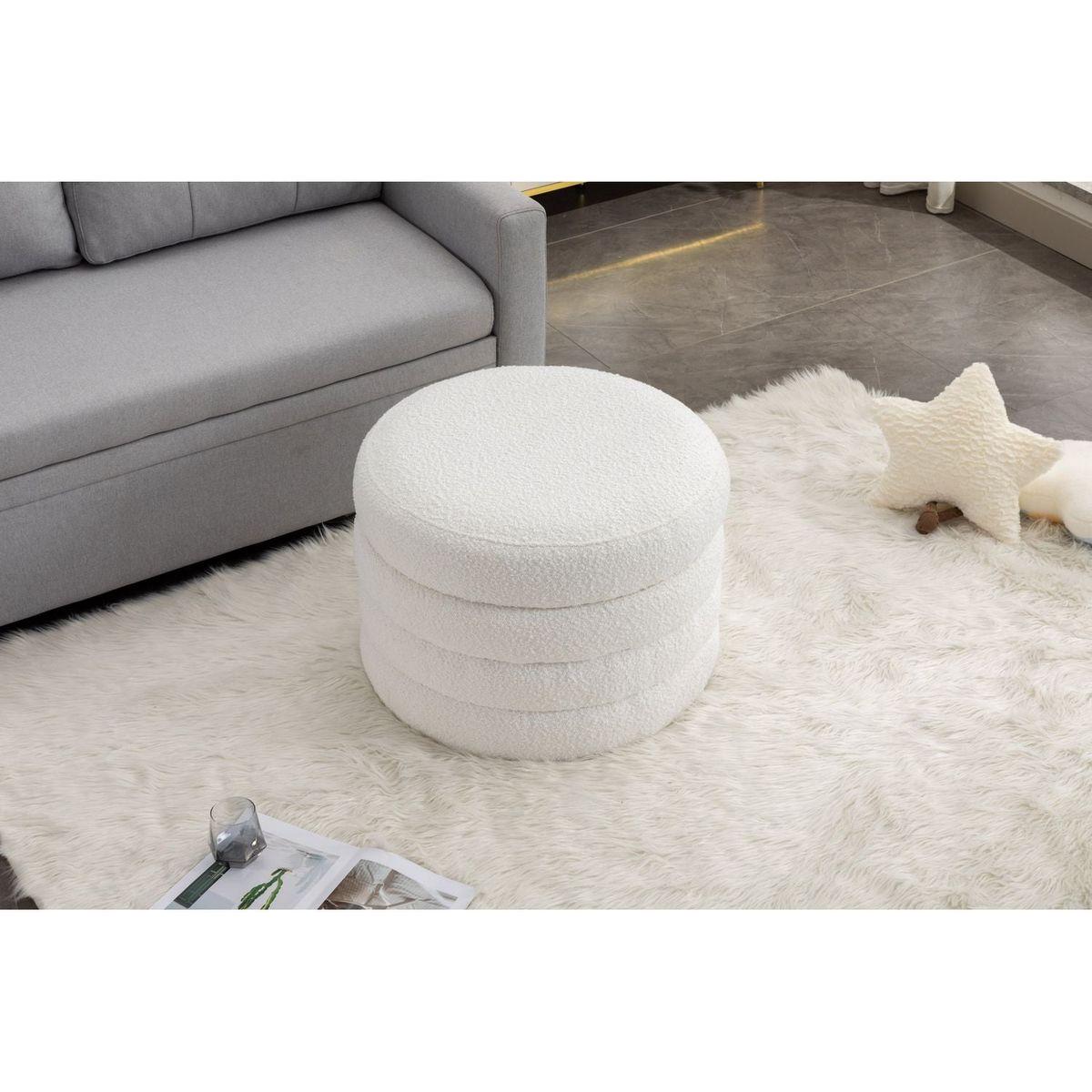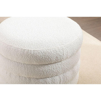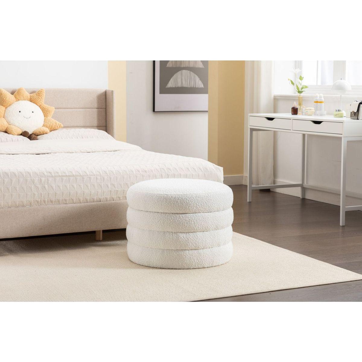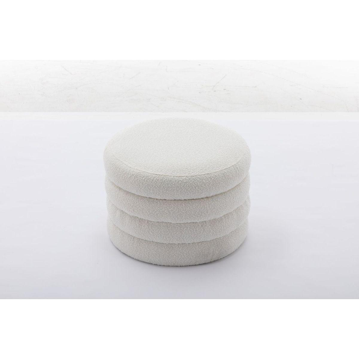 Boucle Fabric Storage Round Ottoman Footstool With Wooden Shelving,Ivory