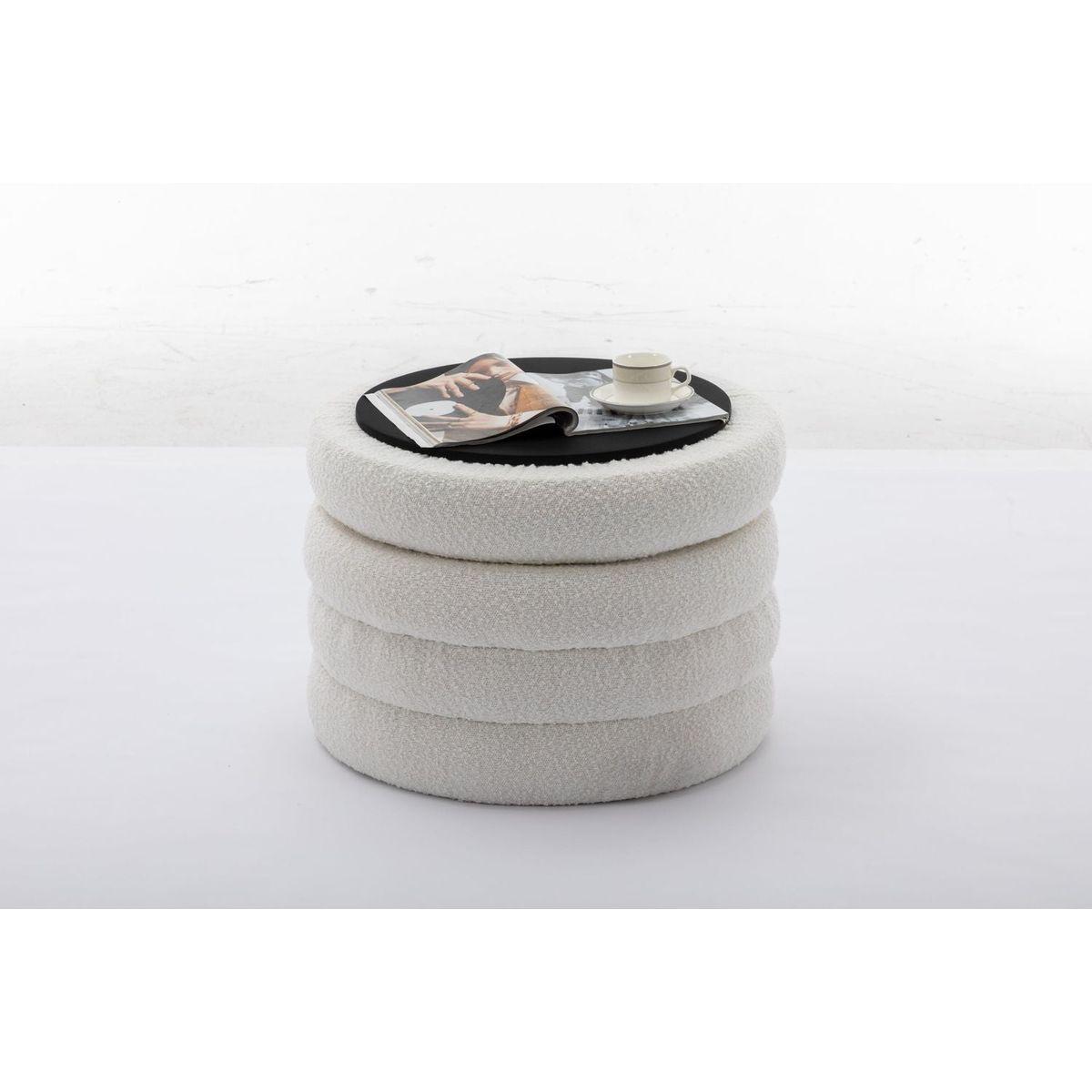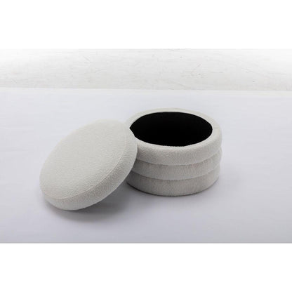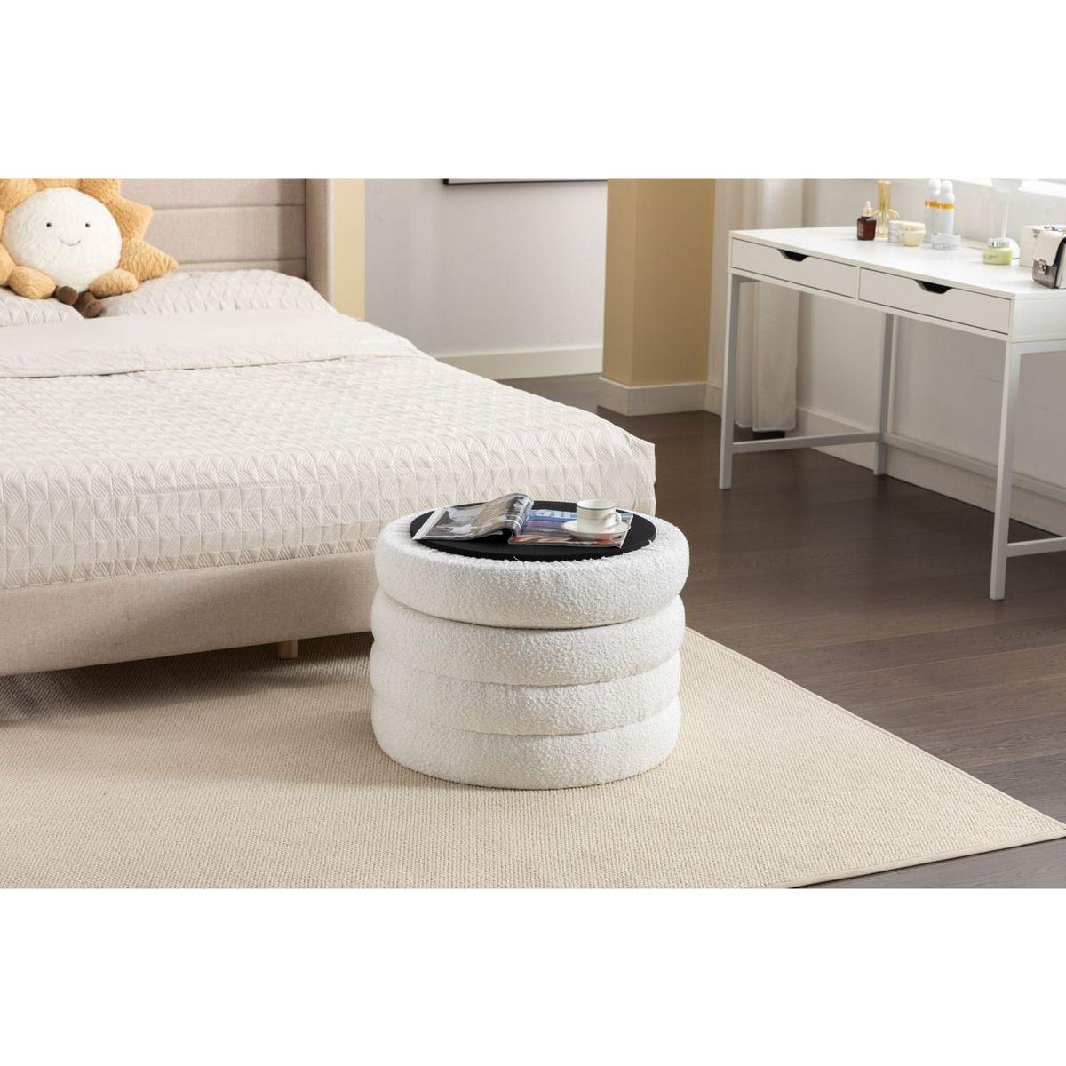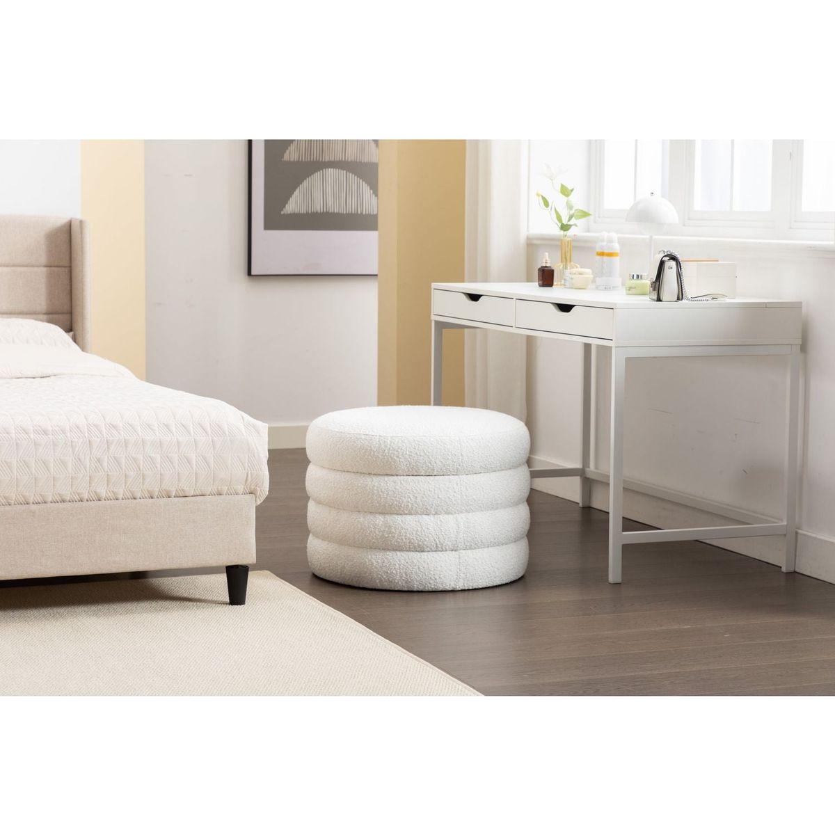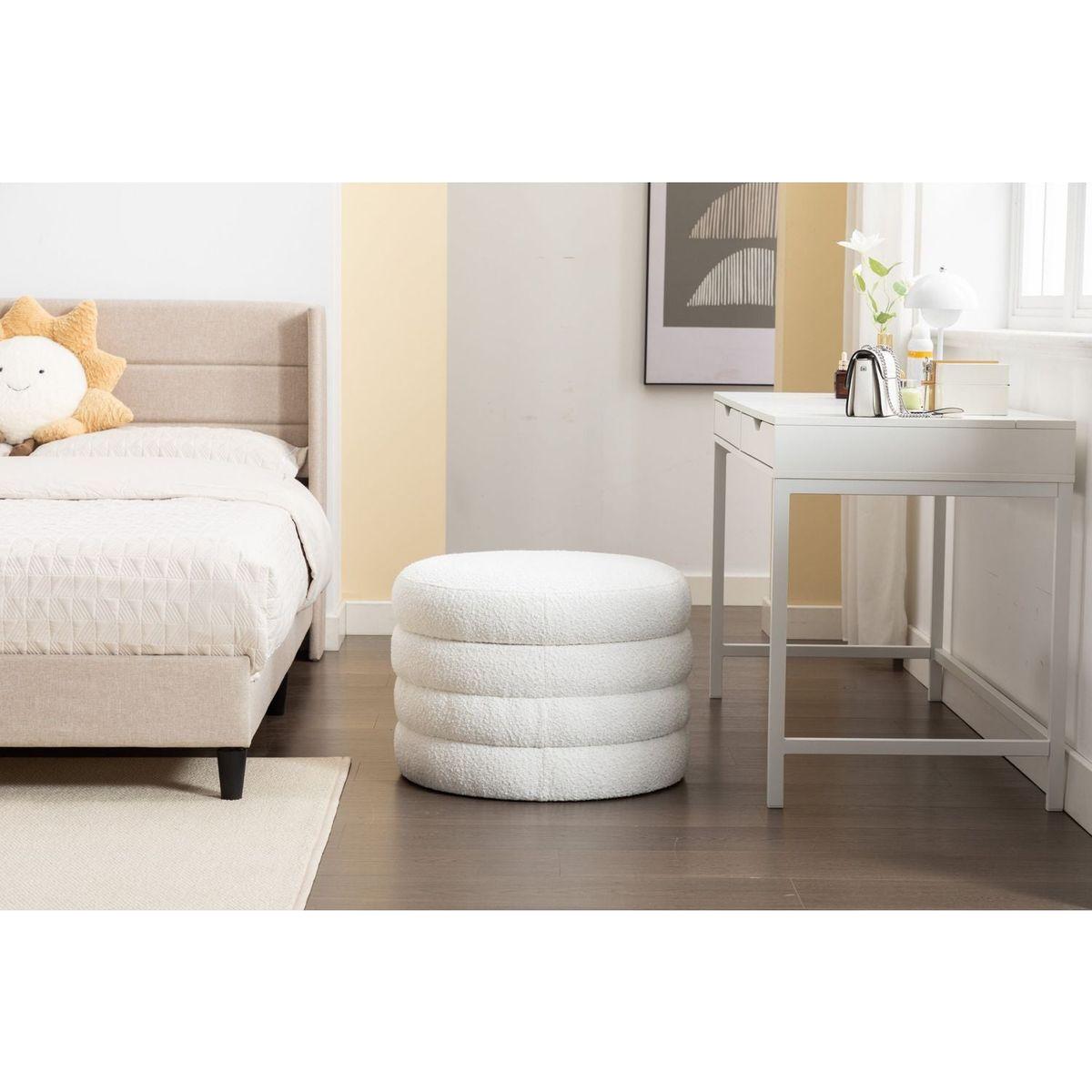 Boucle Fabric Storage Round Ottoman Footstool With Wooden Shelving,Ivory