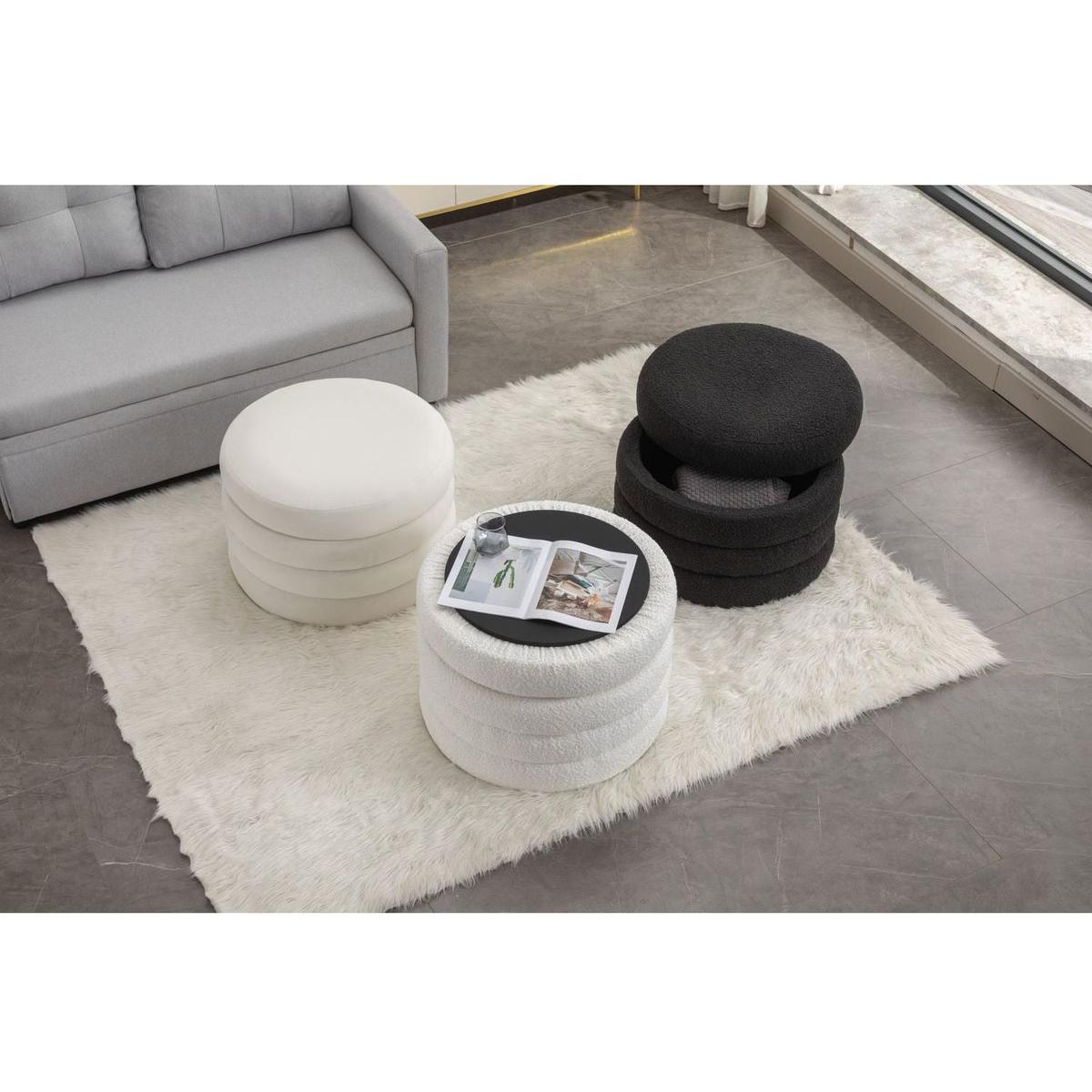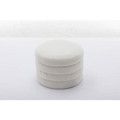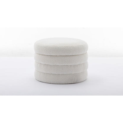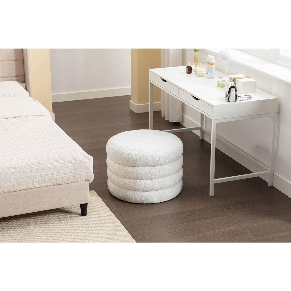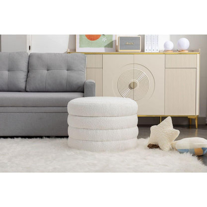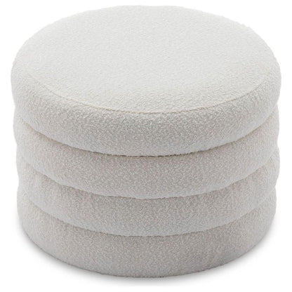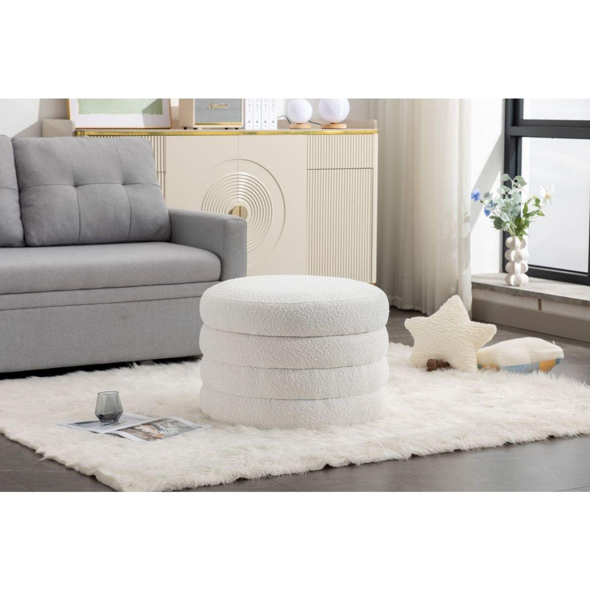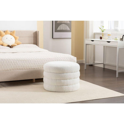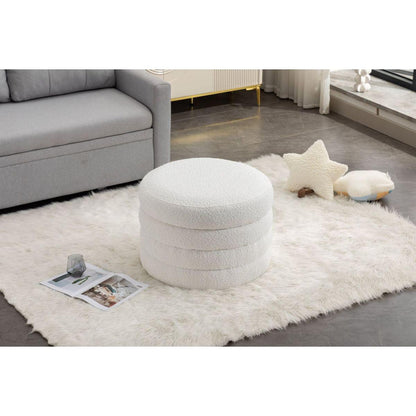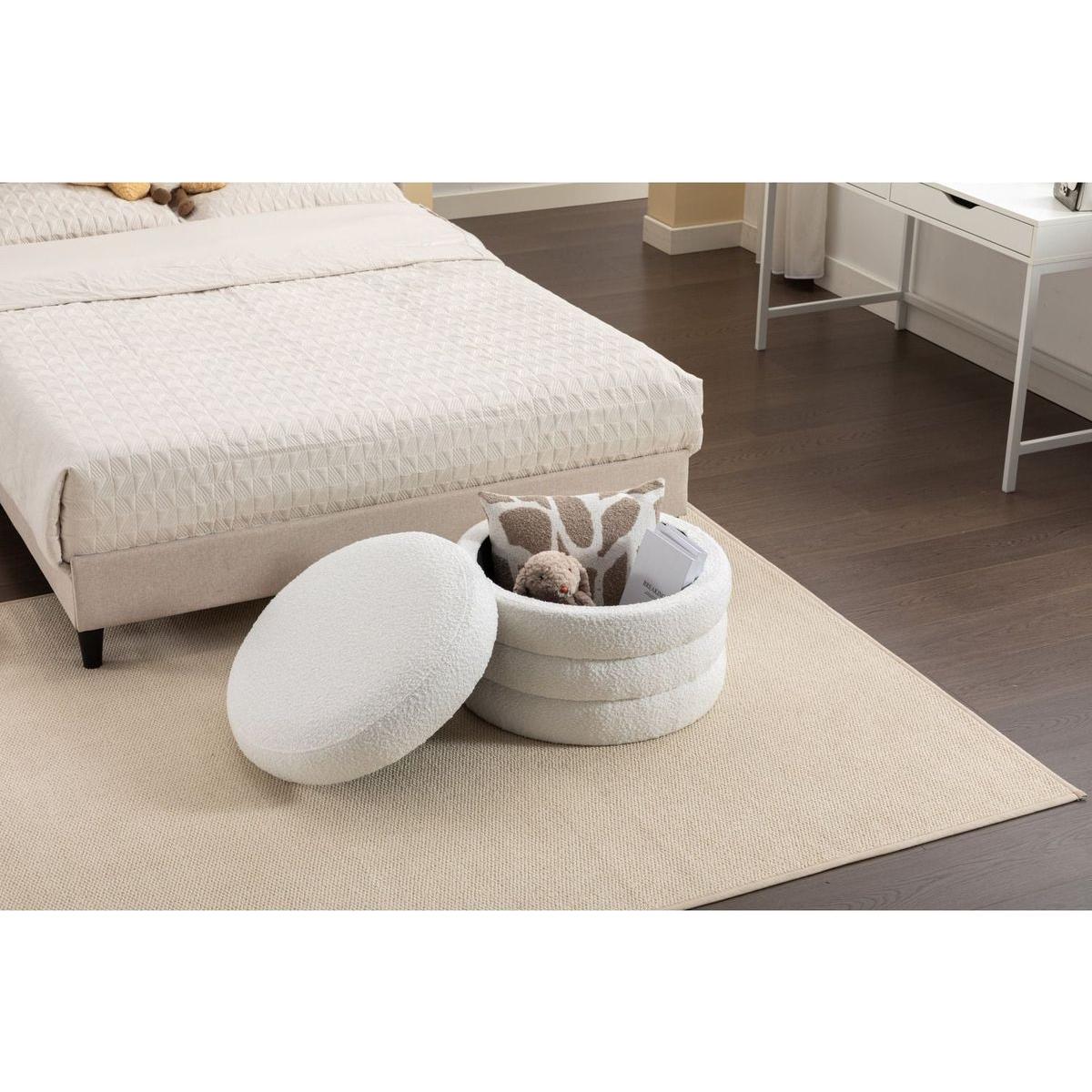 Boucle Fabric Storage Round Ottoman Footstool With Wooden Shelving,Ivory