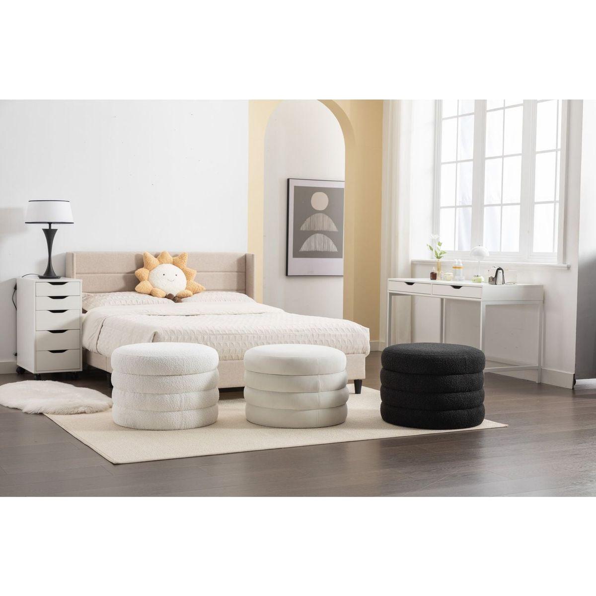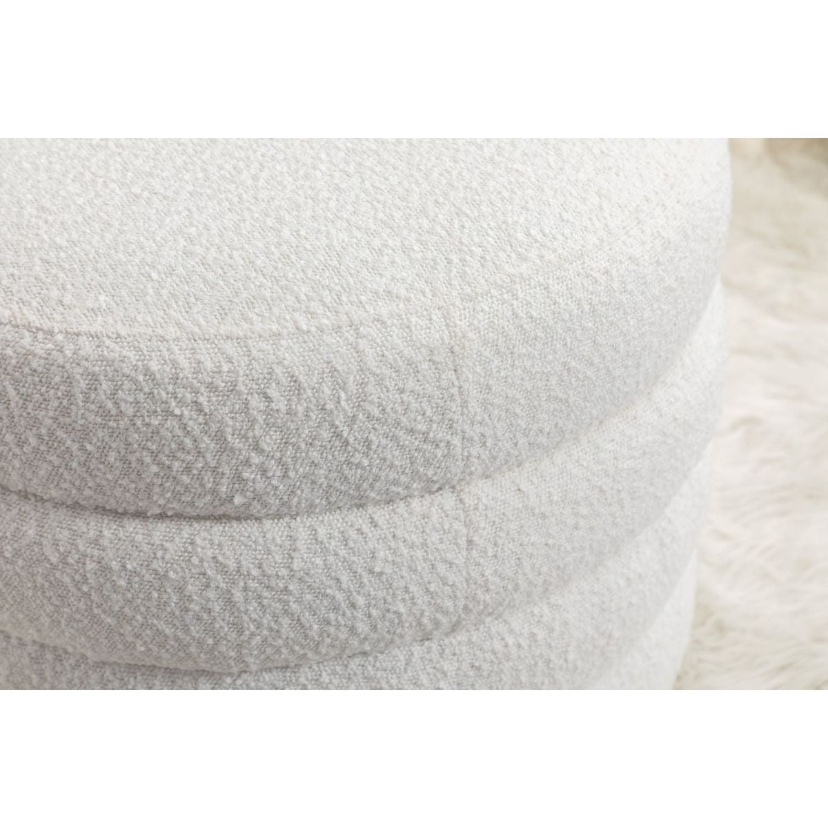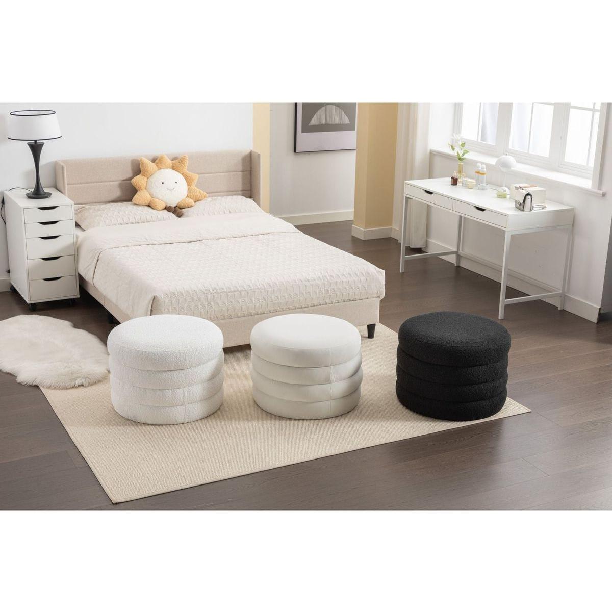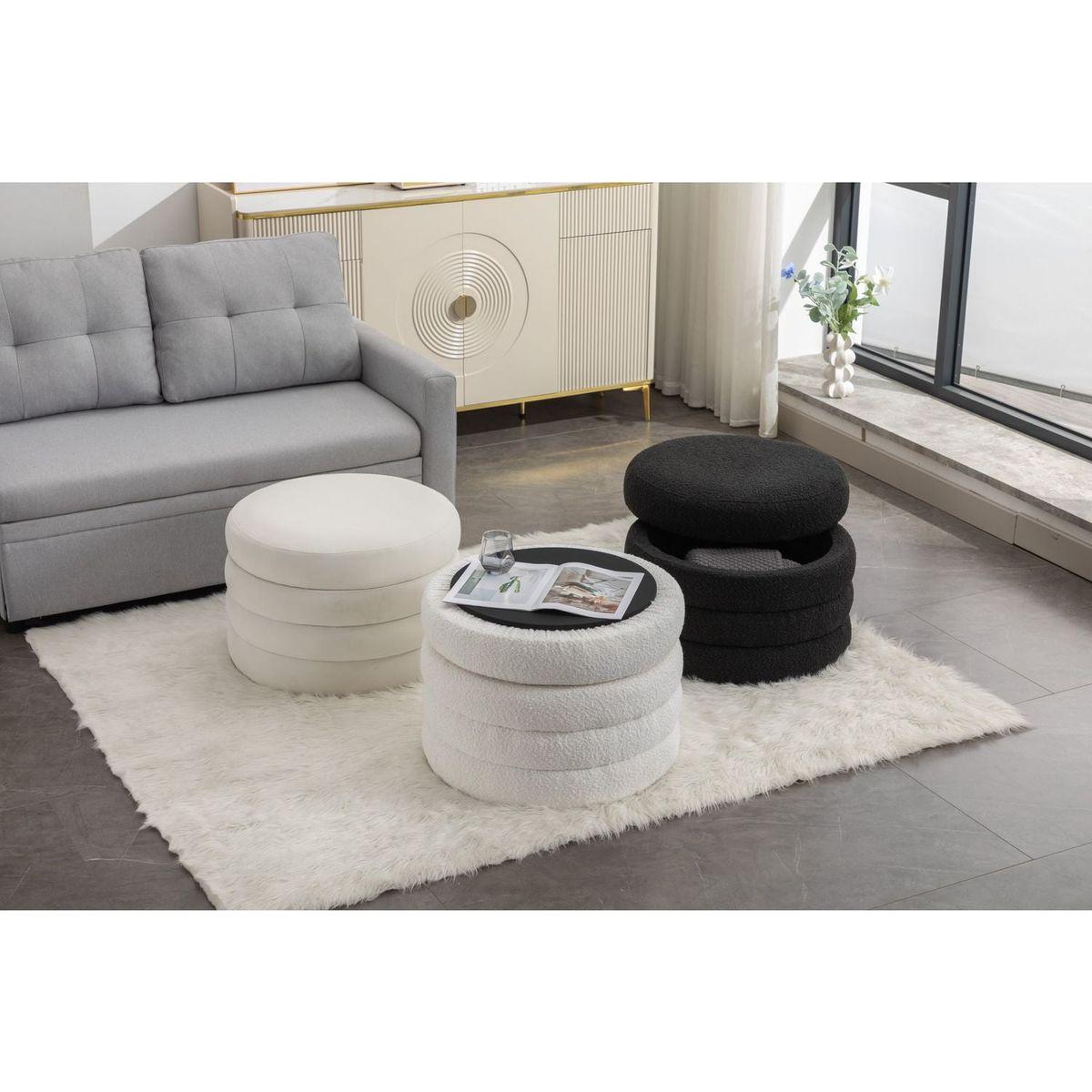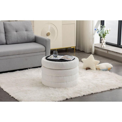 Boucle Fabric Storage Round Ottoman Footstool With Wooden Shelving,Ivory