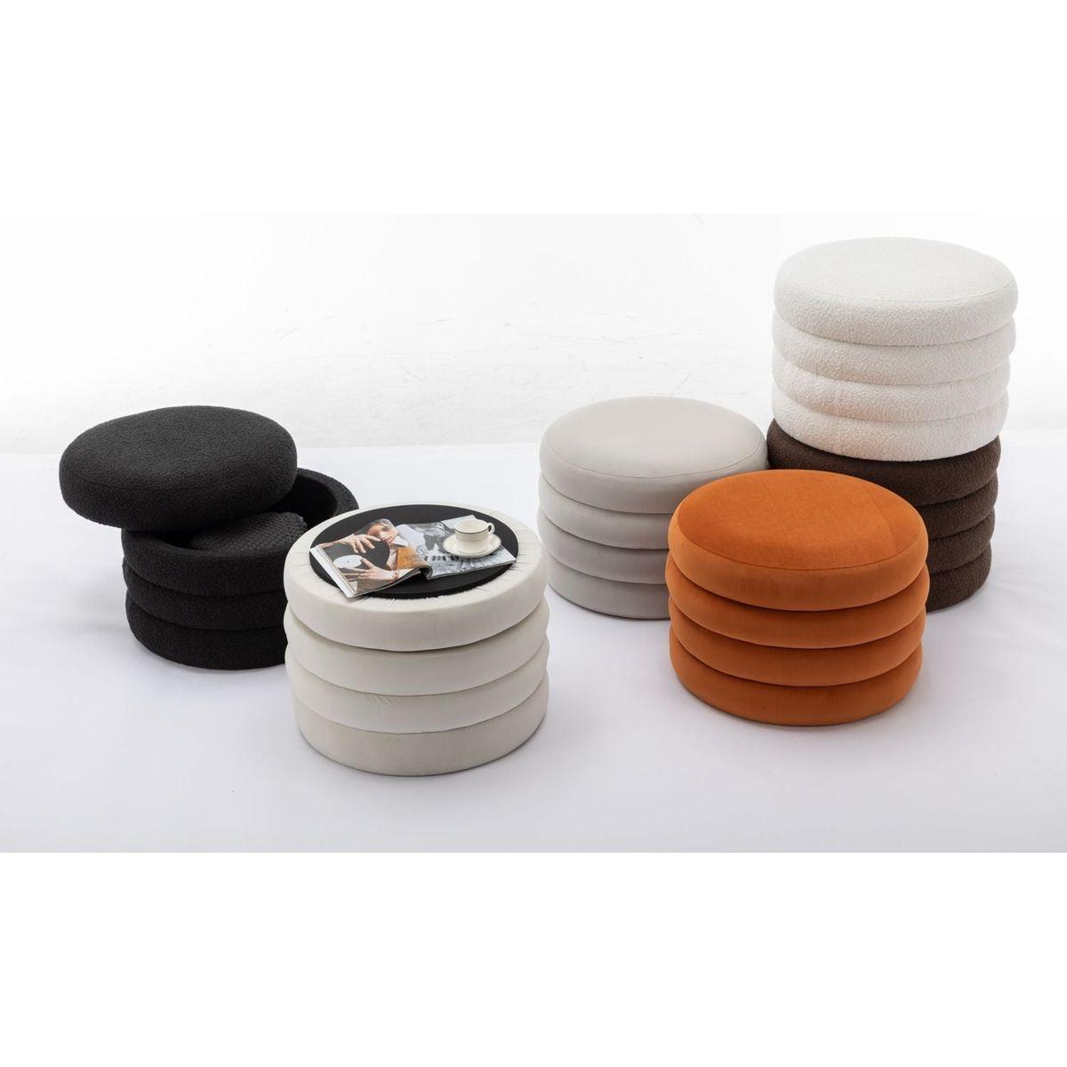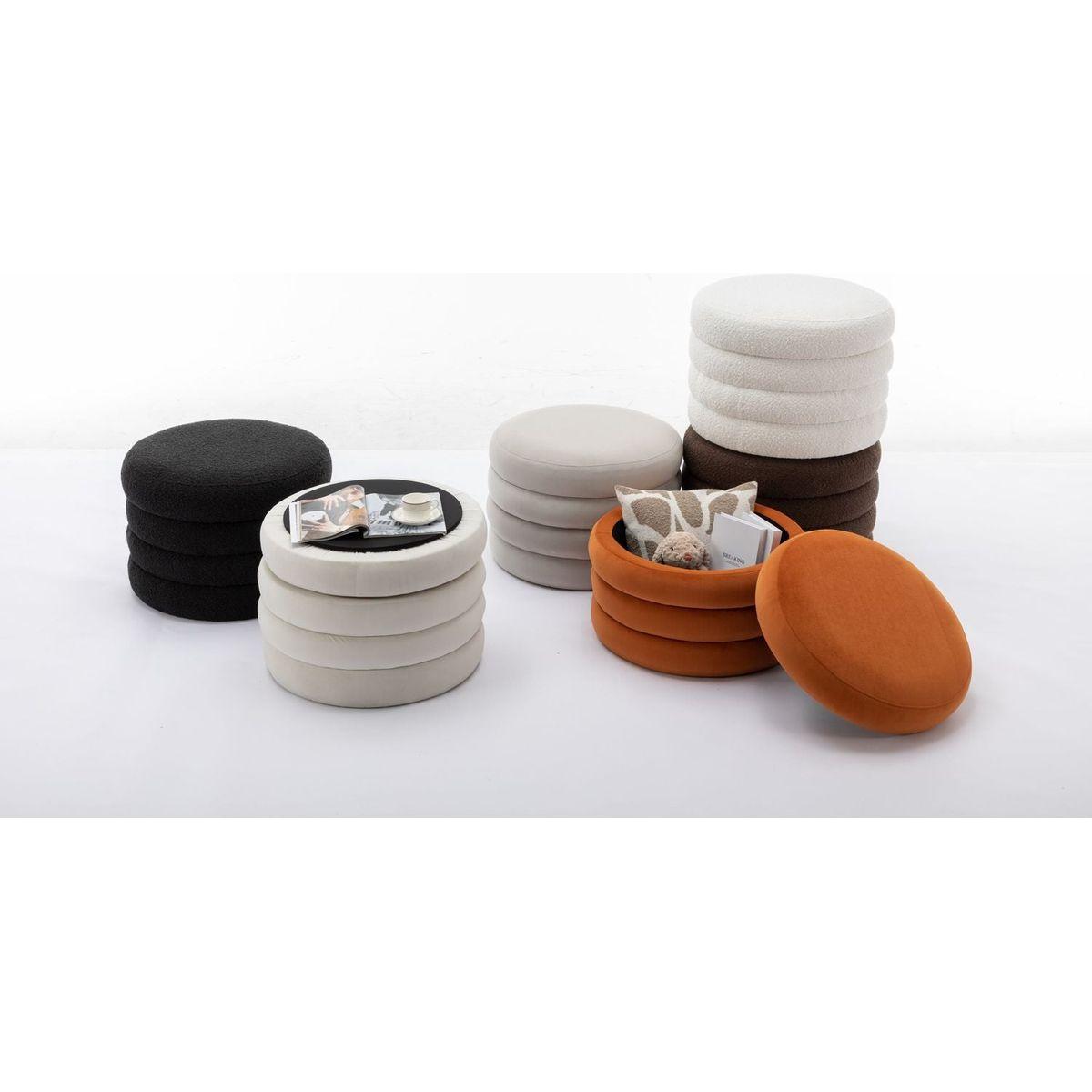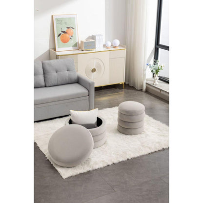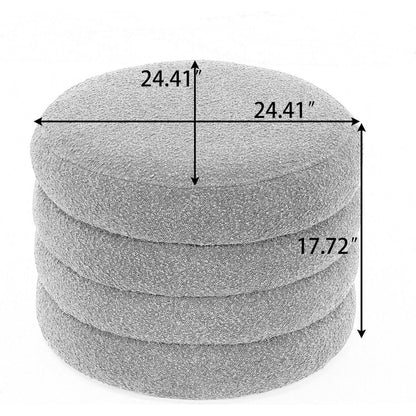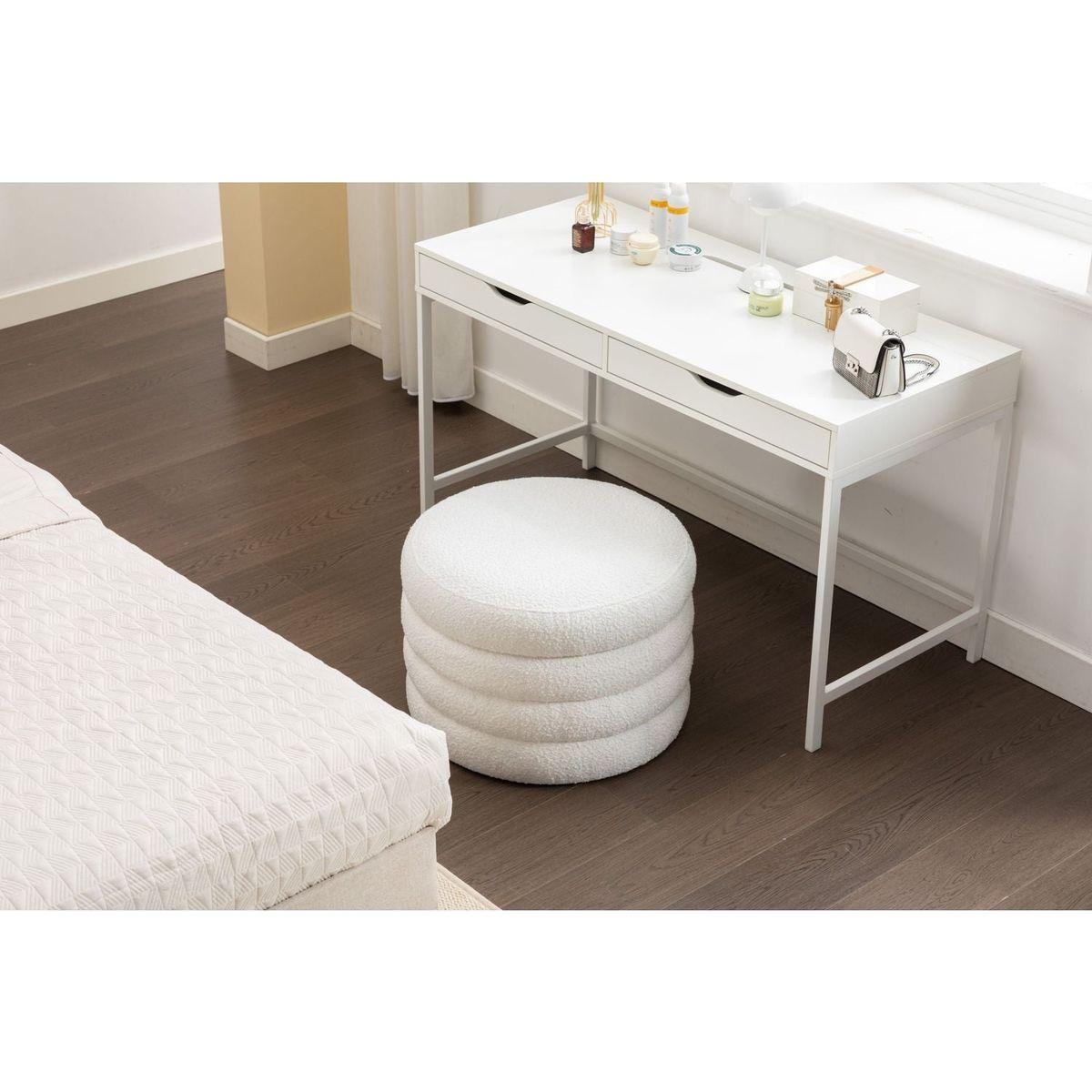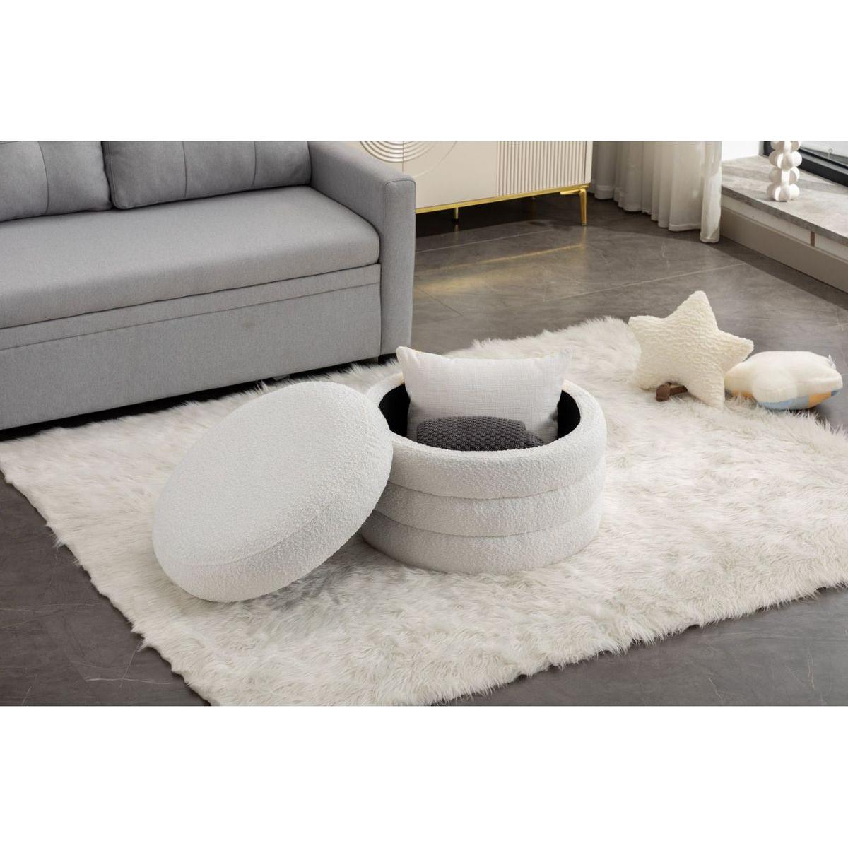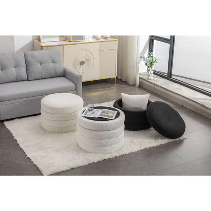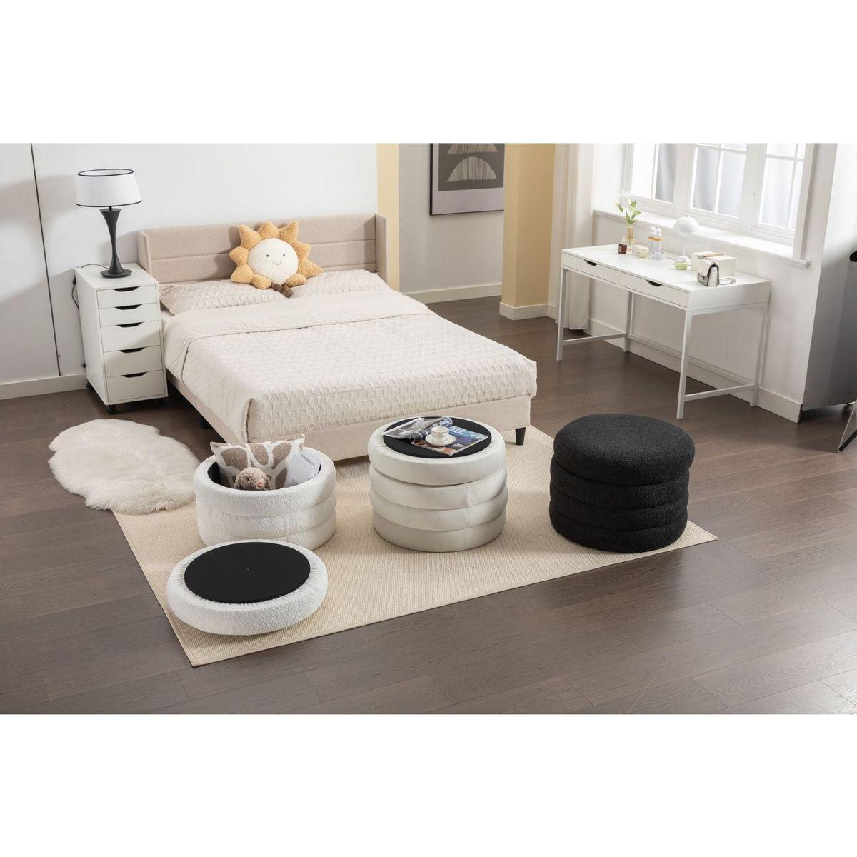 Boucle Fabric Storage Round Ottoman Footstool With Wooden Shelving,Ivory