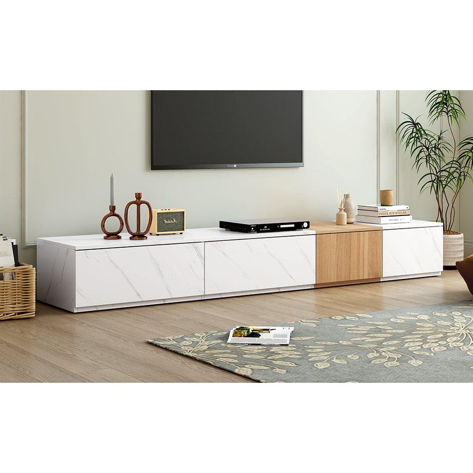 TV Stand with Faux Marble and Walnut Wood Grain Finish for TVs up to 88", Modern Free-Combination Entertainment Center with 4 Storage Drawers for Living Room, White