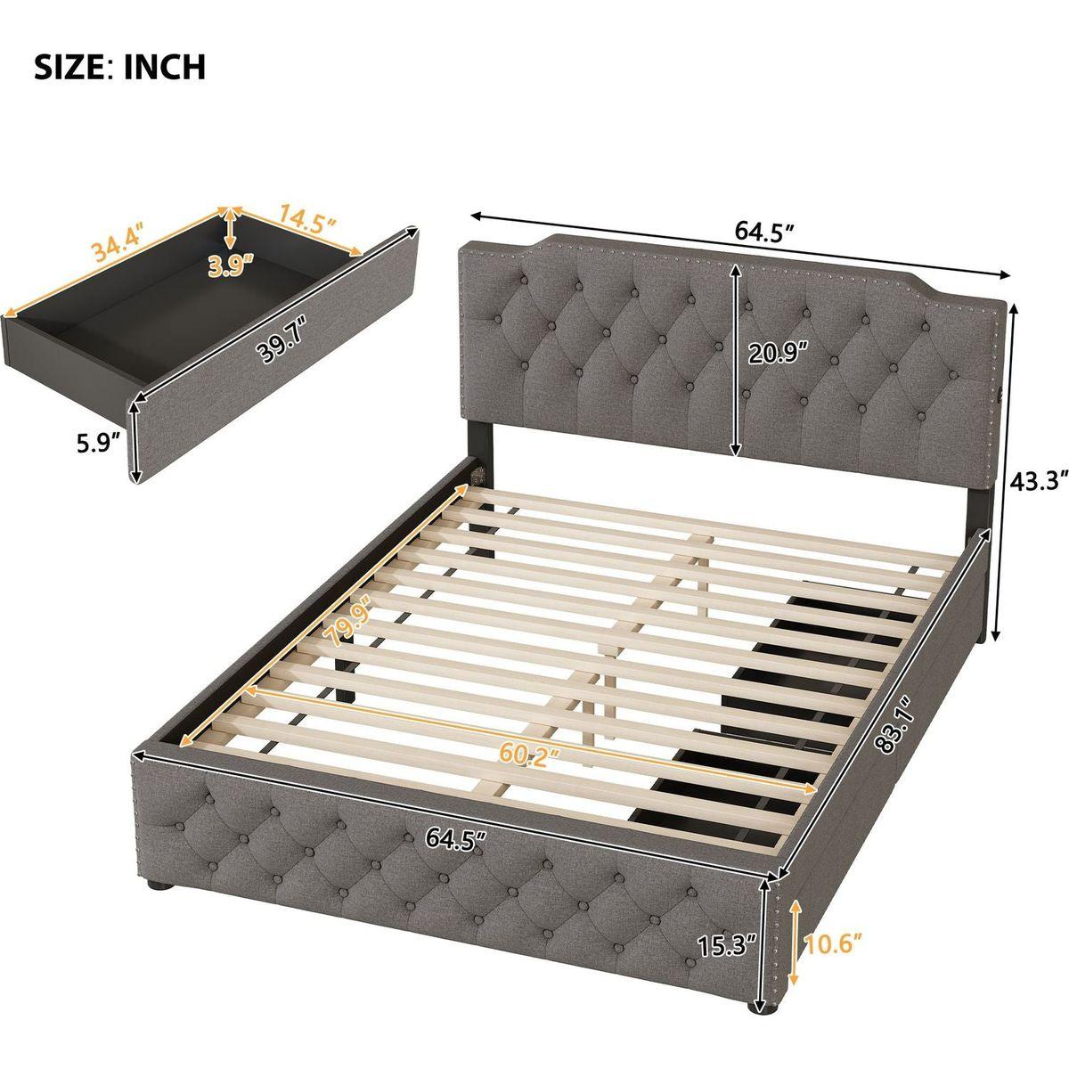 Queen Size Upholstered Platform Bed with 2 Drawers and 2 sets of USB Ports on each side, Linen Fabric, Gray