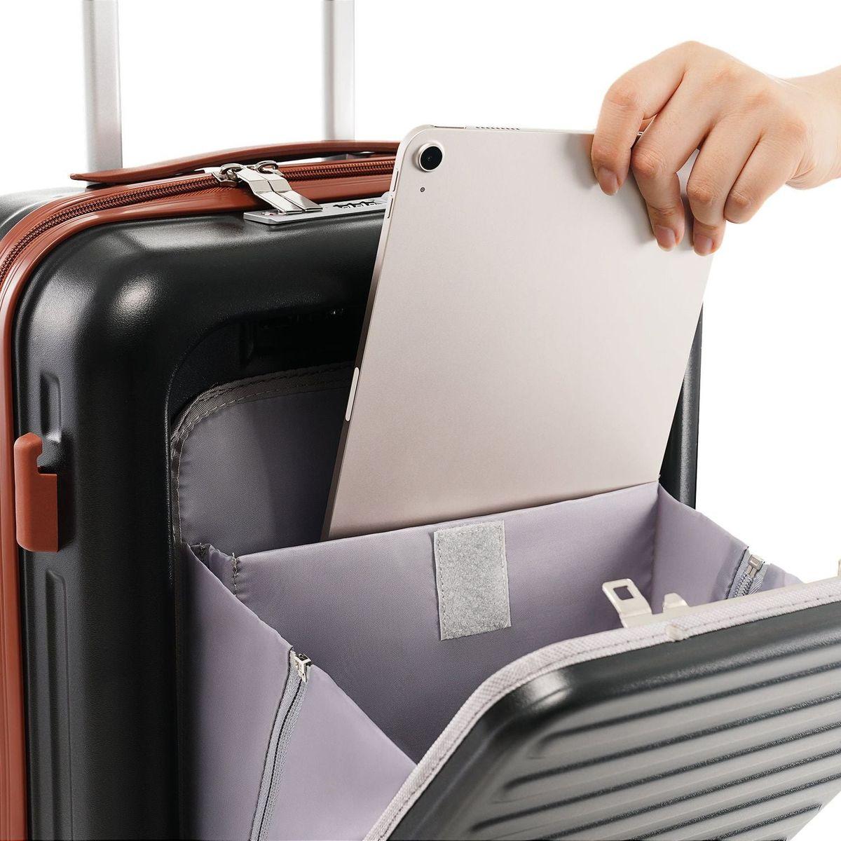 - Smart Convenience Features: The 20-inch carry-on luggage is equipped with a USB interface, allowing you to charge your mobile devices anytime, anywhere. Additionally, the integrated hook and cup holder design make it more convenient to use while traveling.