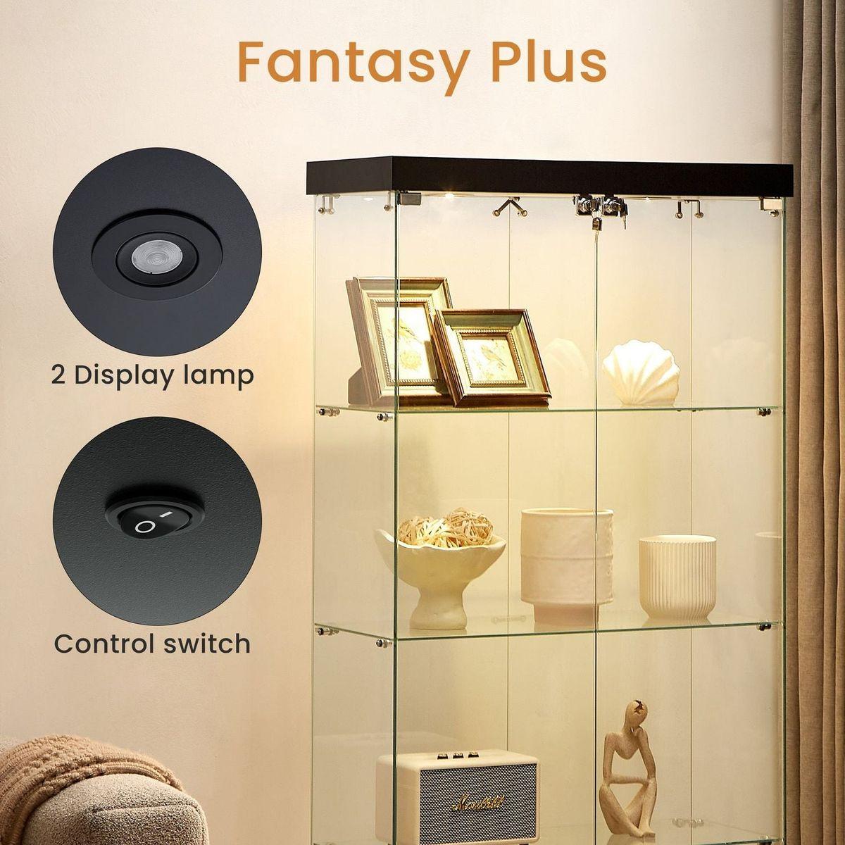 Two warm yellow ambient lights make the display cabinet more beautiful and the items on display more atmospheric.