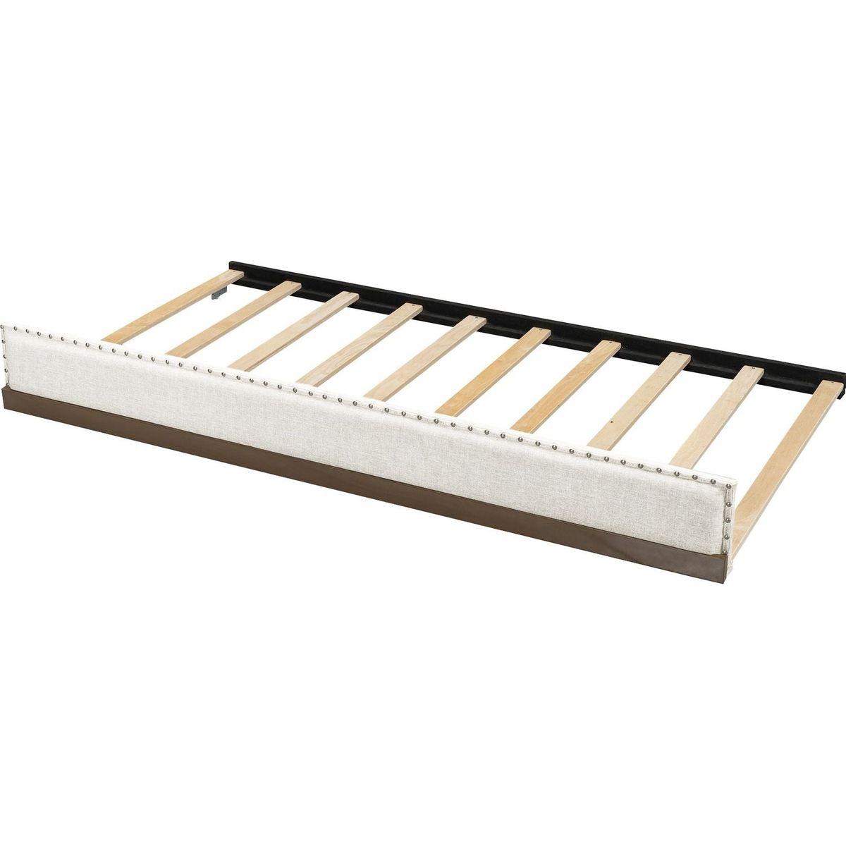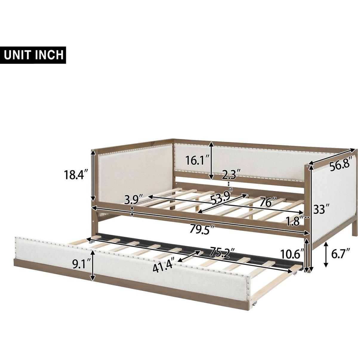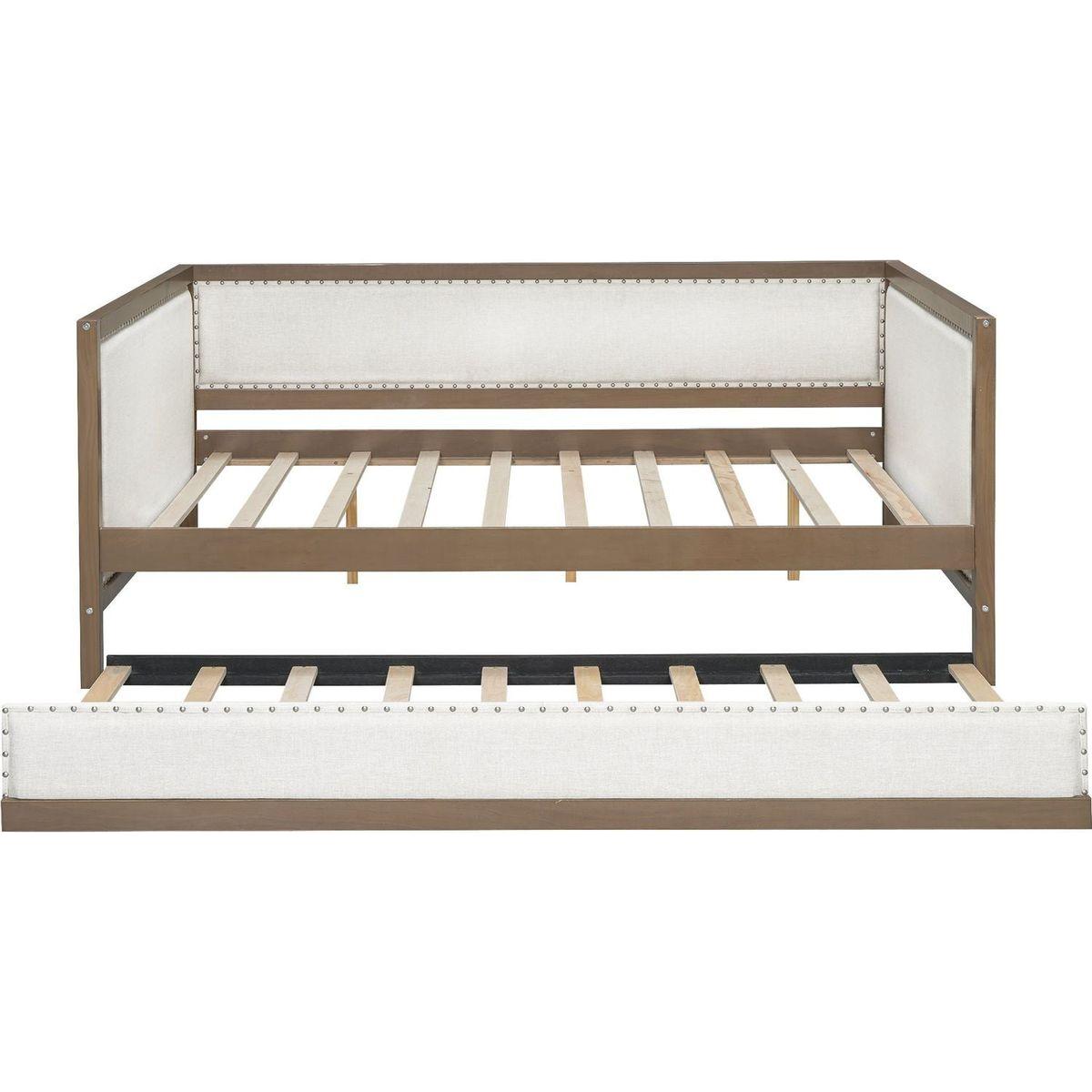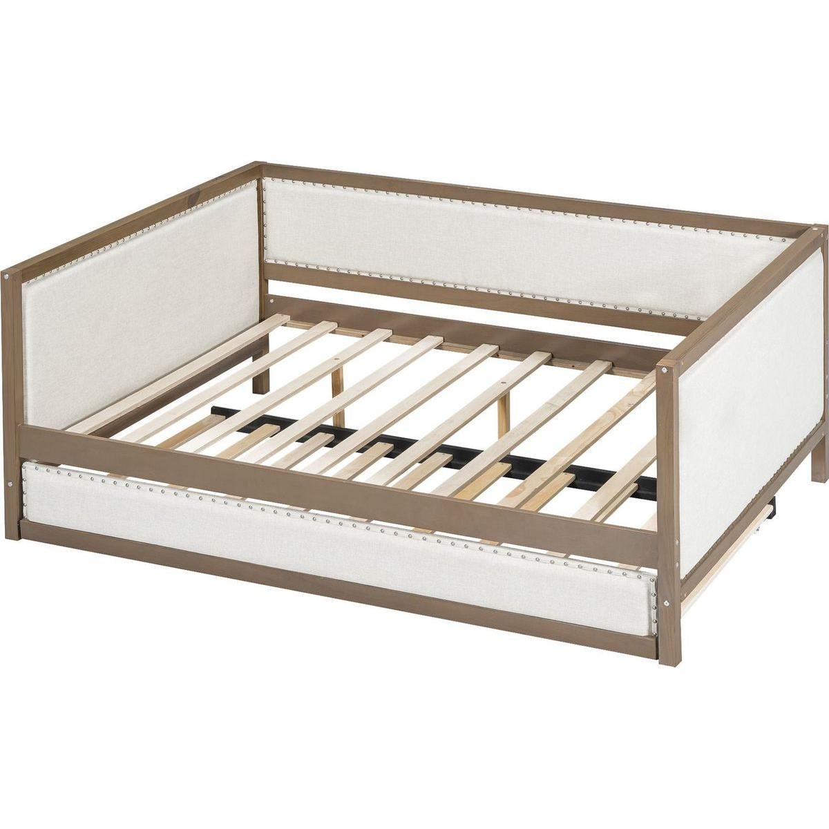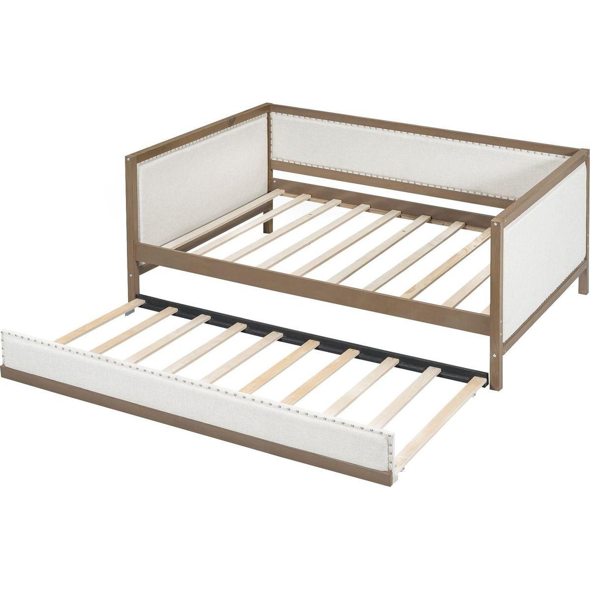 Full Size Upholstered Daybed with Trundle and Nailhead Decoration, Wood Color