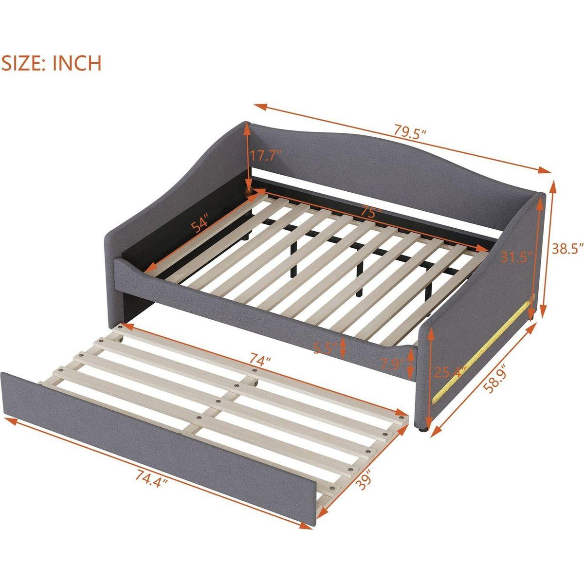 Embossed with light stripes on each side of the bed, this daybed brings artistic atmosphere to your home. The design is full of fun and can make you feel easy and comfortable.This bed provides a fun and adorable place for you to enjoy yourselves.This modern profile of the bed track design acts as an eye-catching focal point.This bed comes with a twin size trundle. Perfect for small apartment or someone who love sleepovers. Simply roll out the trundle when it is needed and roll in when it's not in use. This daybed will surely be a beautiful and practical piece for your bedroom.