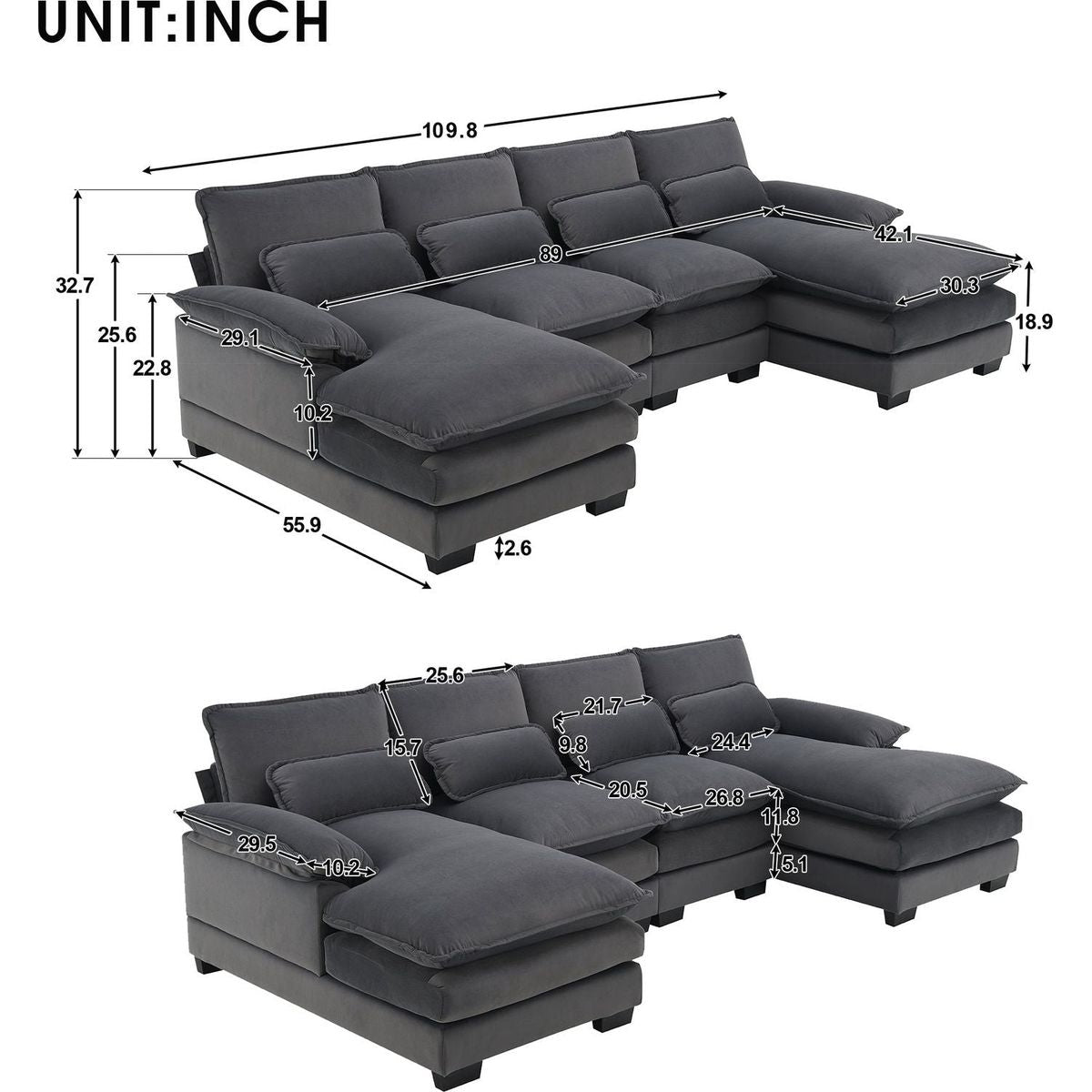 109.8x55.9" Modern U-shaped Sectional Sofa with Waist Pillows,6-seat Upholstered Symmetrical Sofa Furniture,Sleeper Sofa Couch with Chaise Lounge for Living Room,Apartment,2 Color