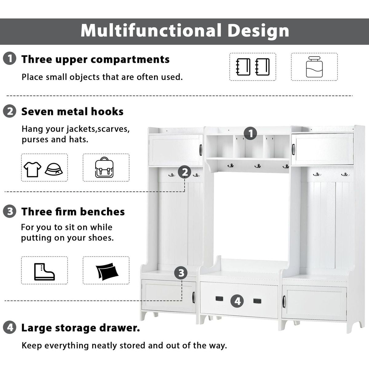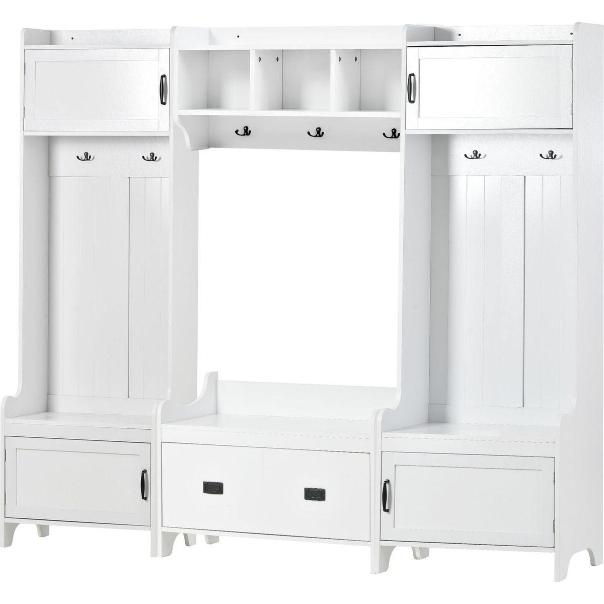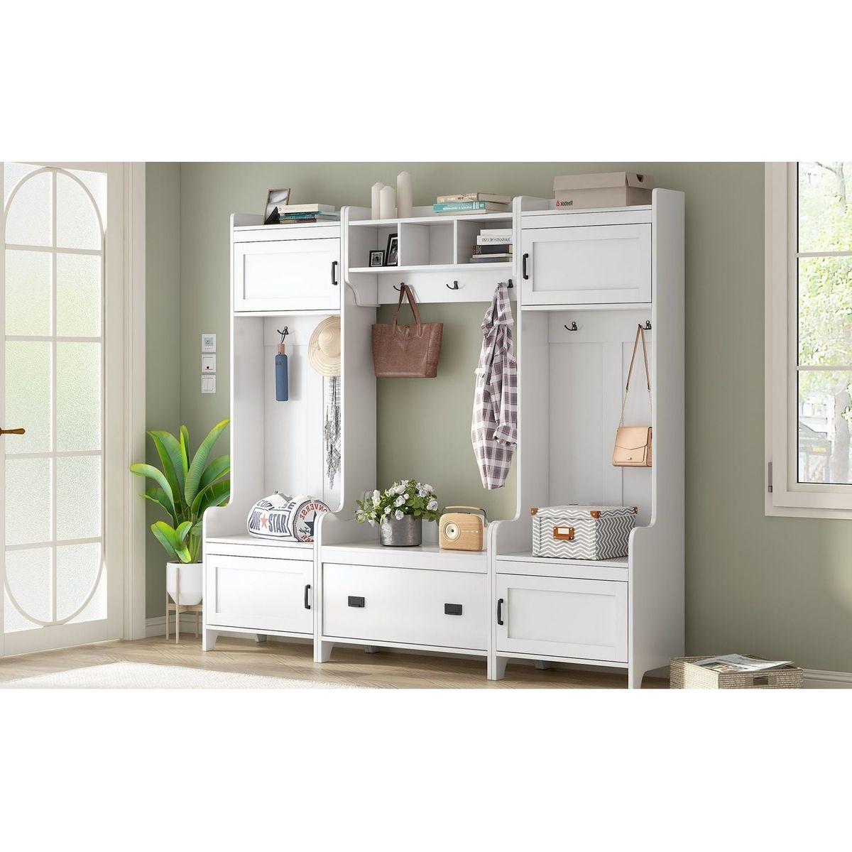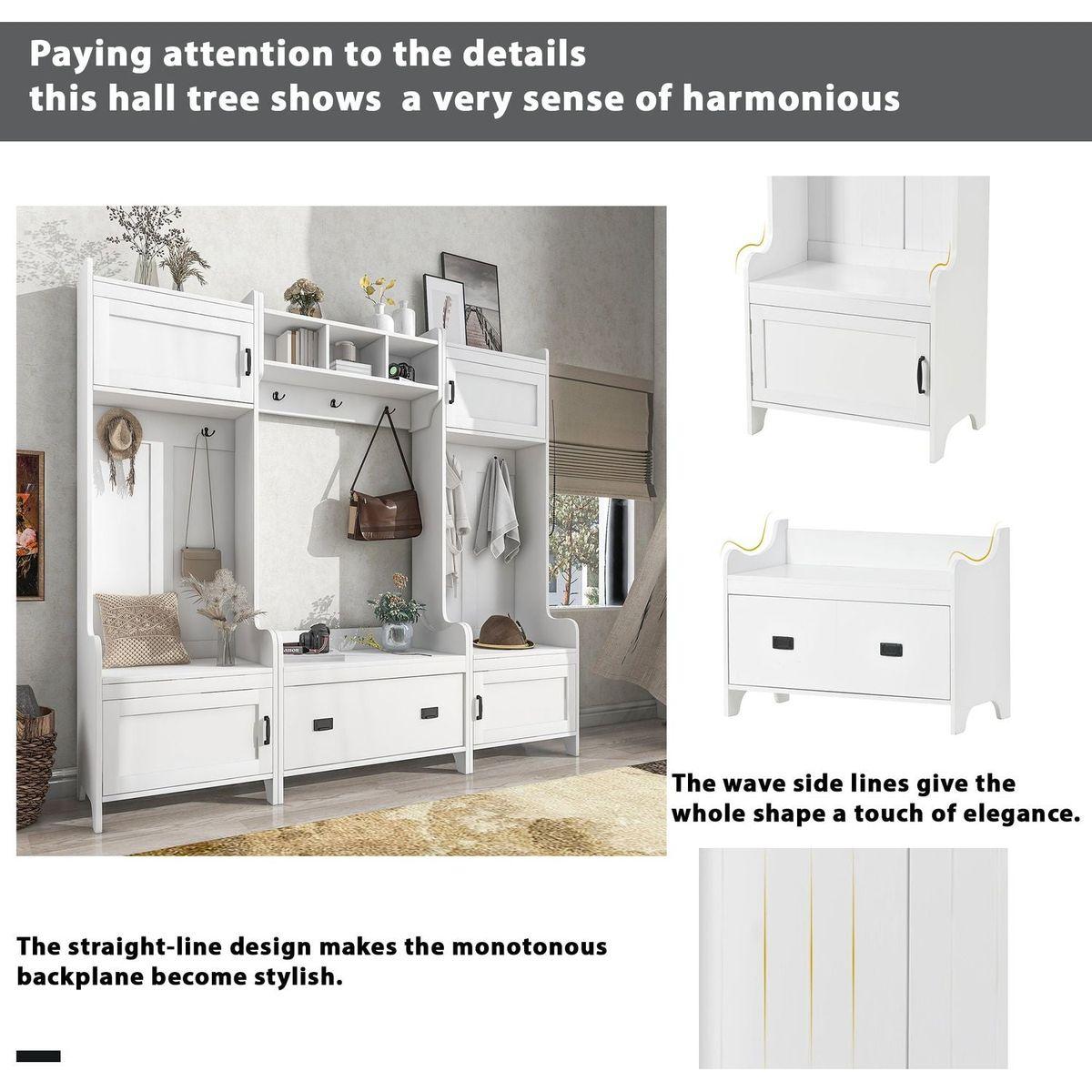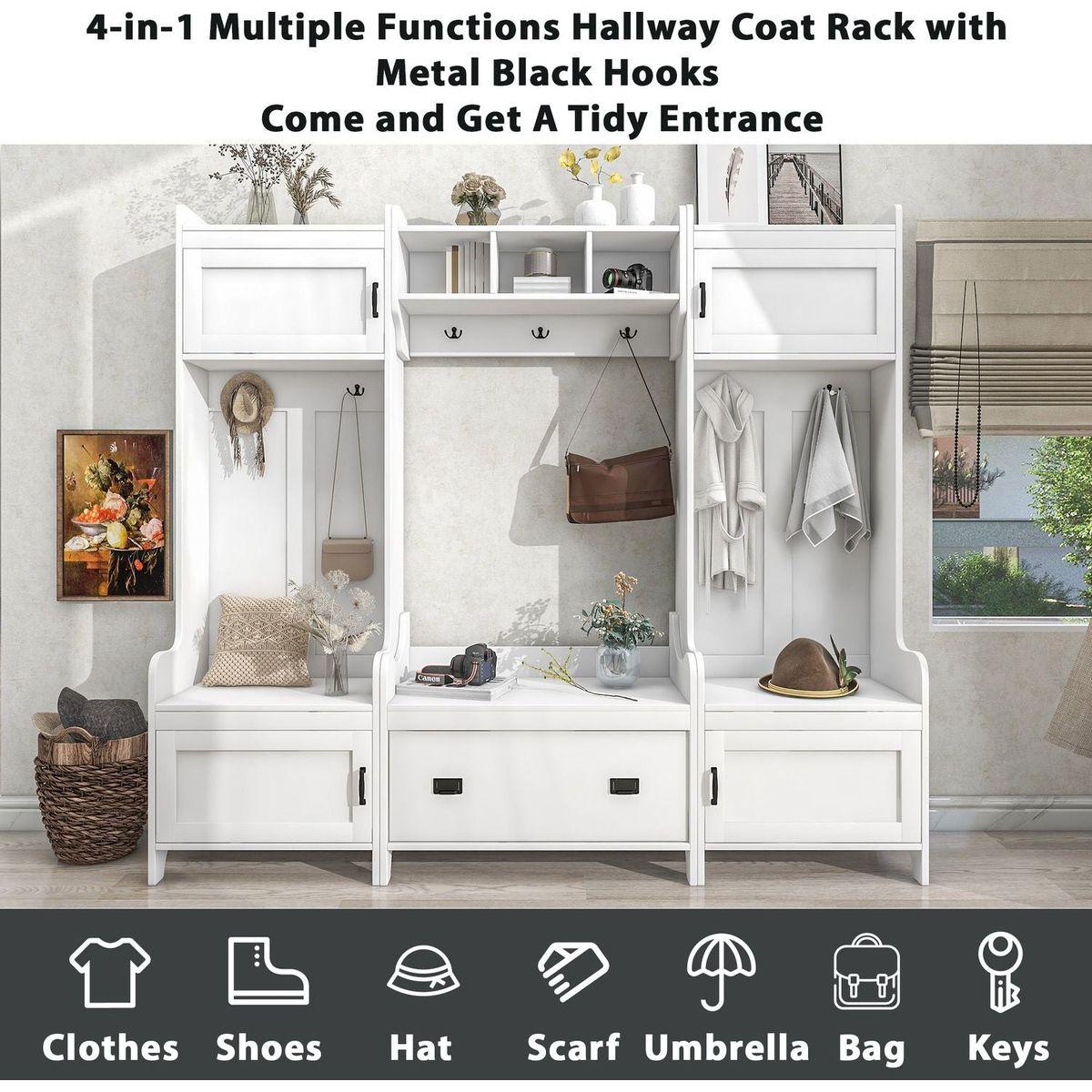 - This 4-in-1 hall tree including a hanging entryway shelf, a storage bench, 7 coat racks, and 4 storage cabinets, becoming an excellent organize solution for entrance.