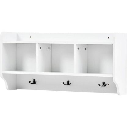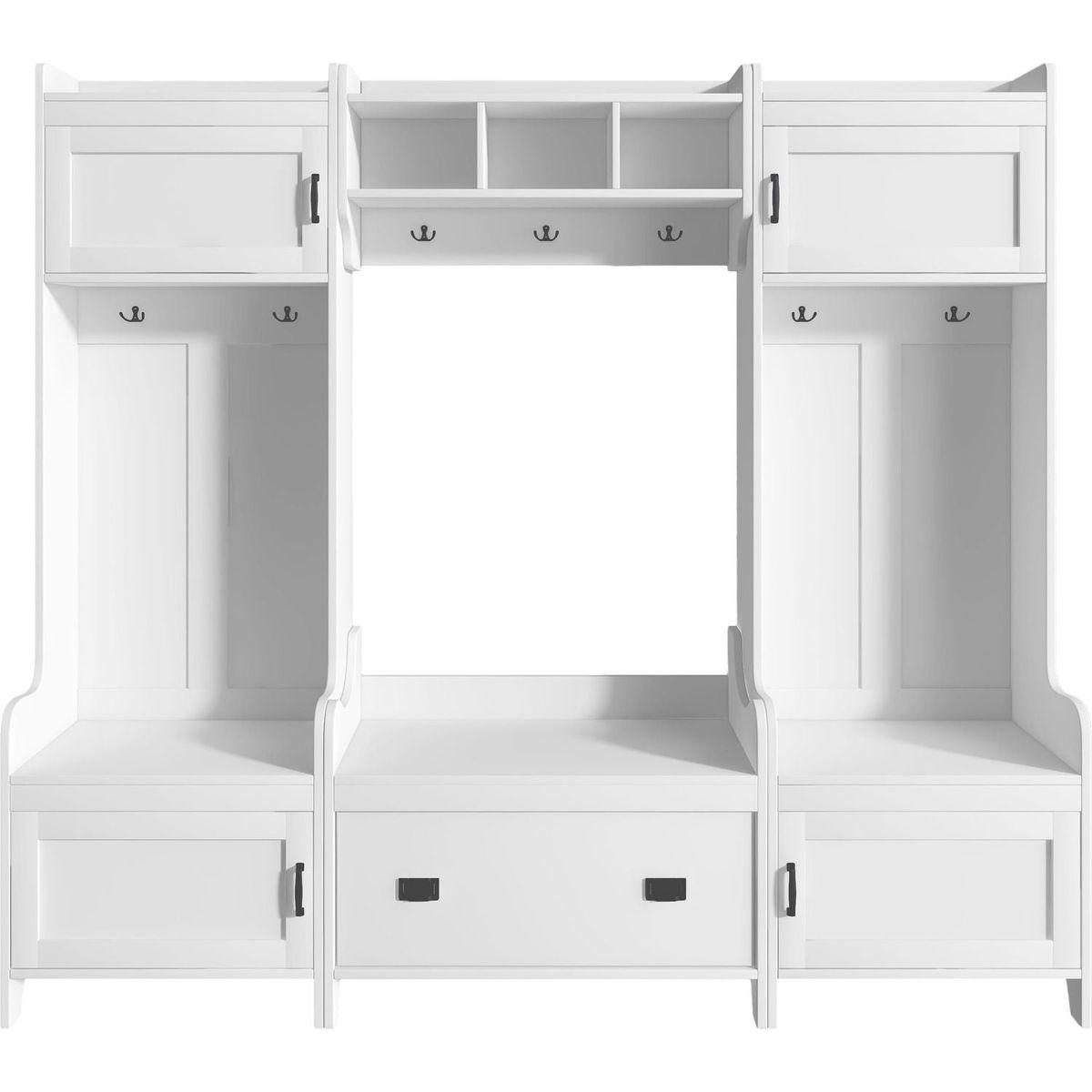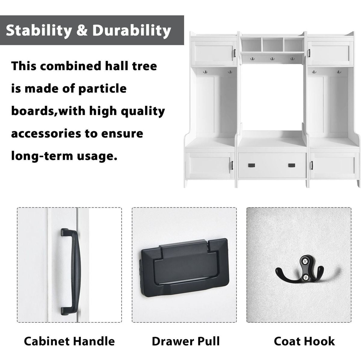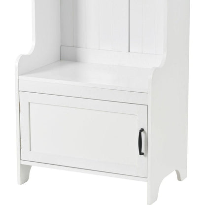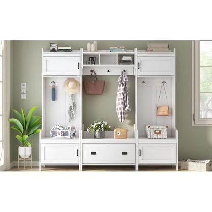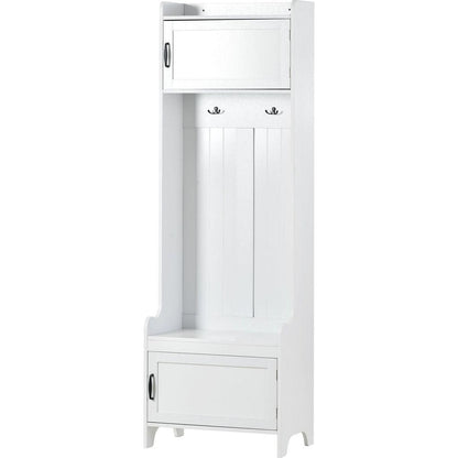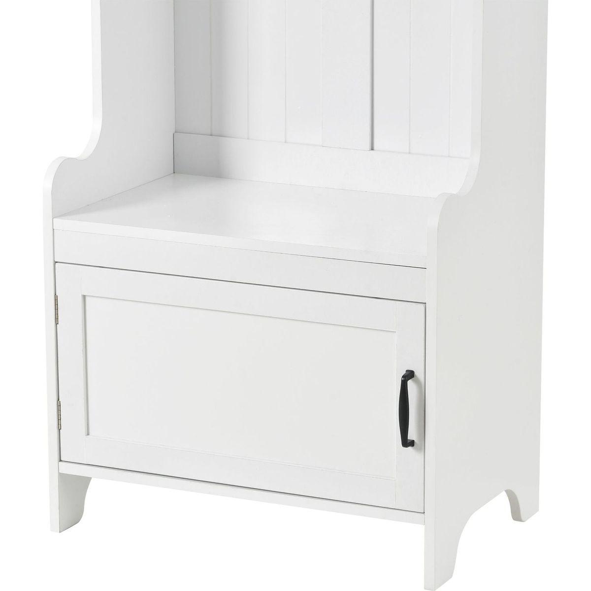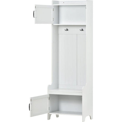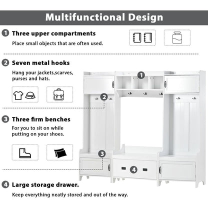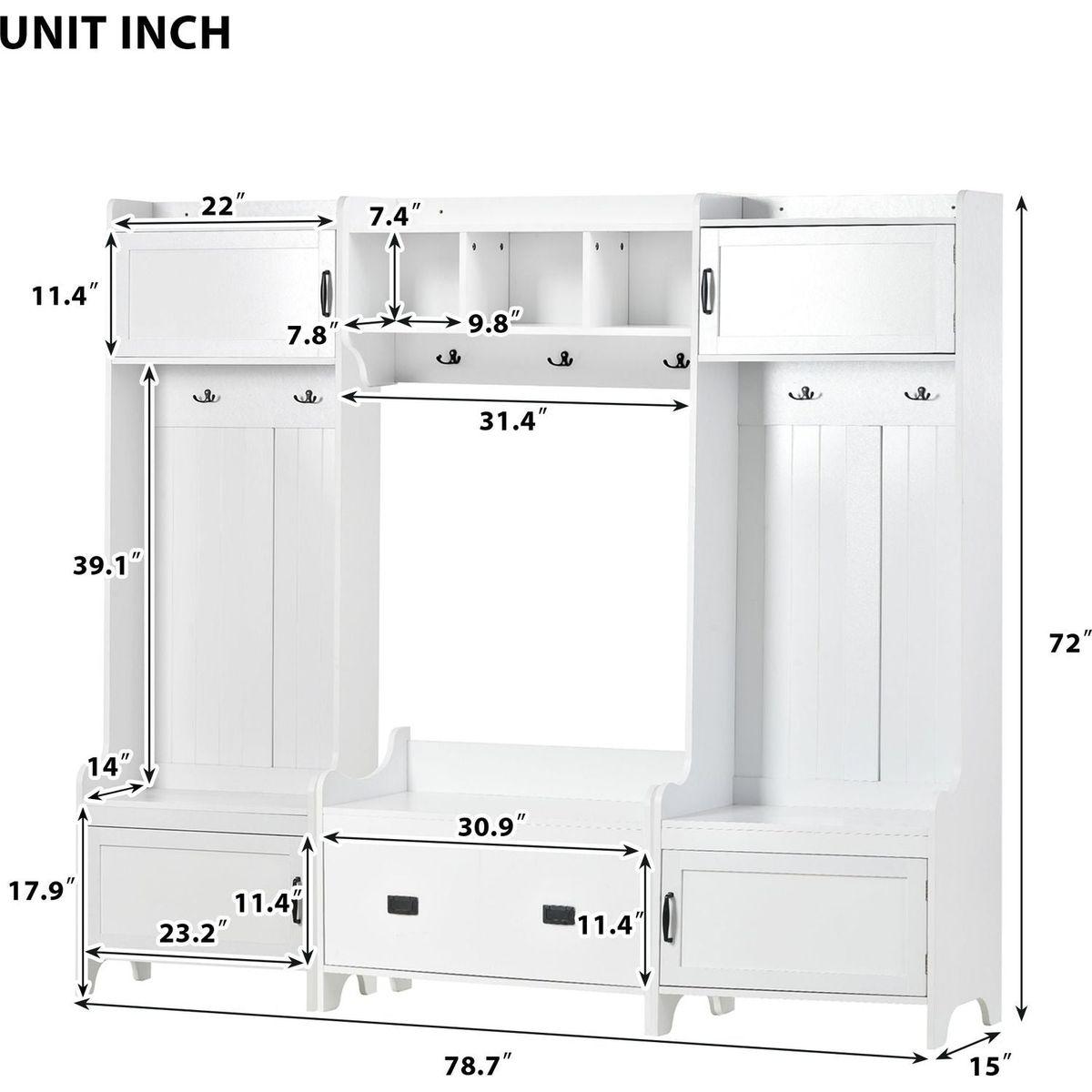 - This 4-in-1 hall tree including a hanging entryway shelf, a storage bench, 7 coat racks, and 4 storage cabinets, becoming an excellent organize solution for entrance.