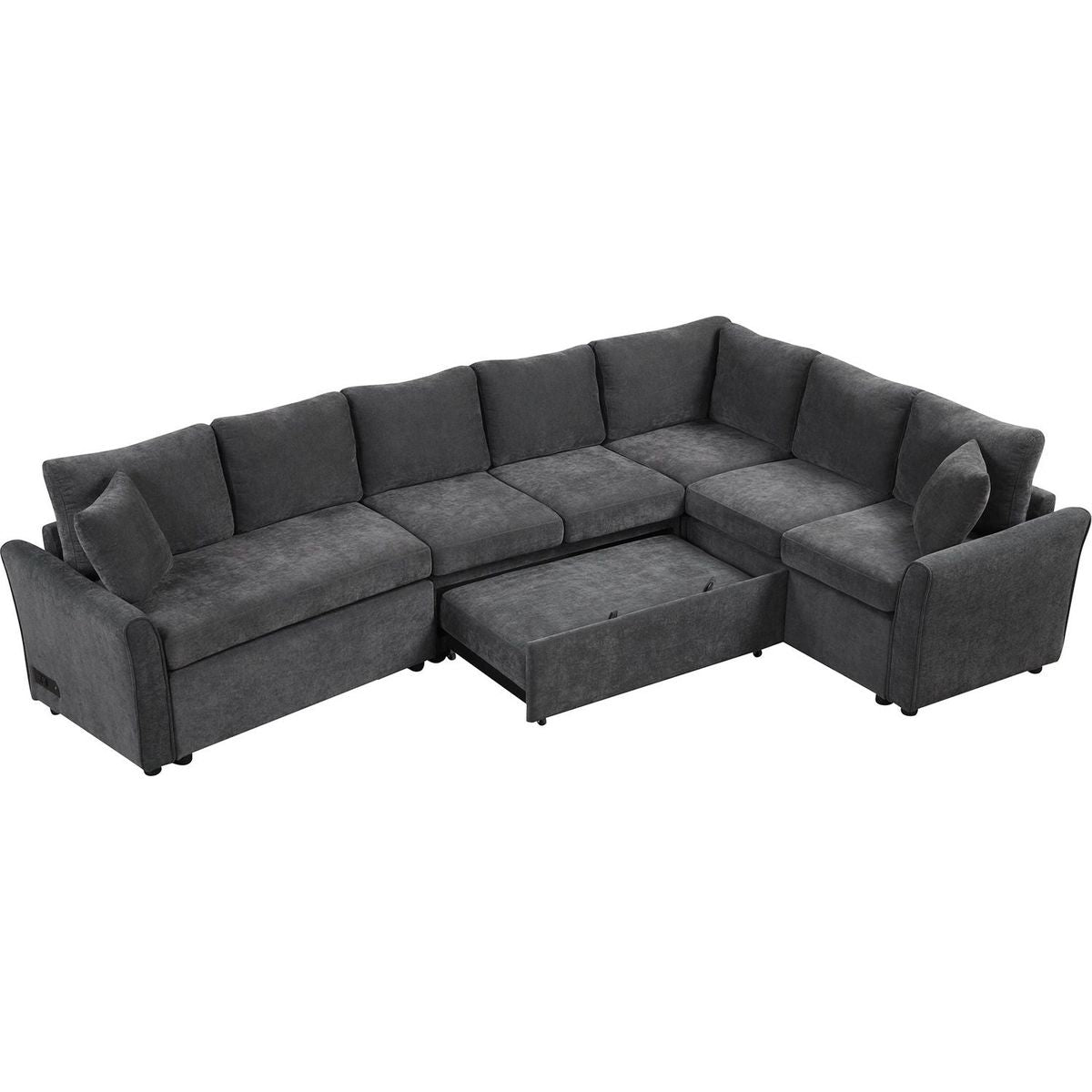 124.8"L-shaped Sofa Convertible Sofa Bed Pull Out Sofa Sleeper with Two Back Pillows, Two USB Ports and Two Power Sockets for Living Room, Gray