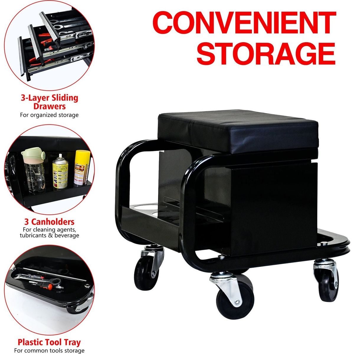 - Premium 3-inch PP casters allow the stool to glide easily over rough surfaces and cracks, while its 360-degree swivel feature offers maneuverability.