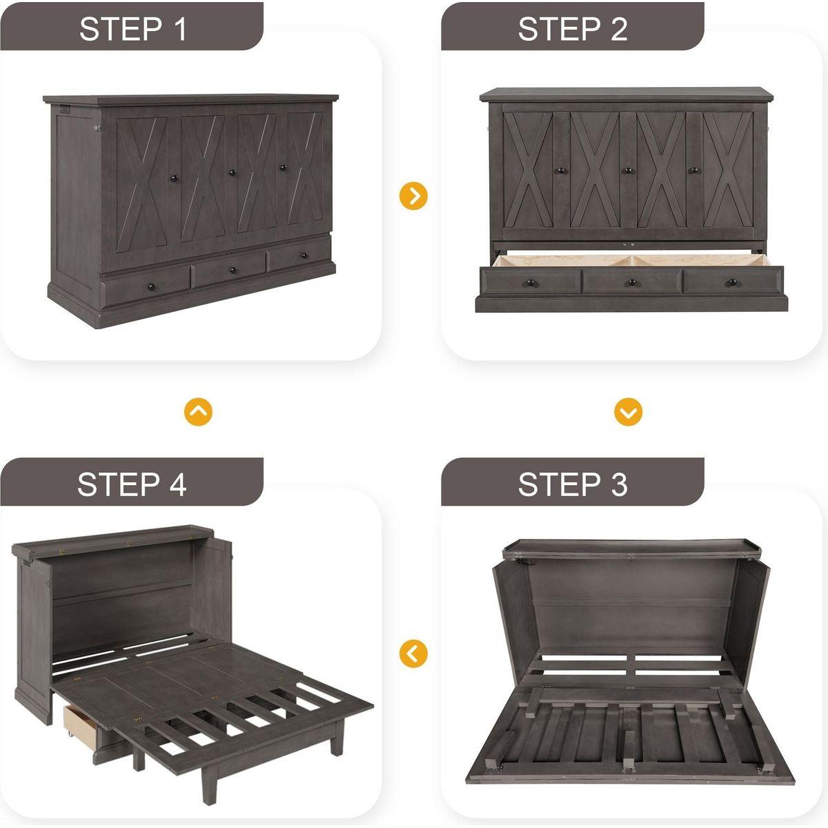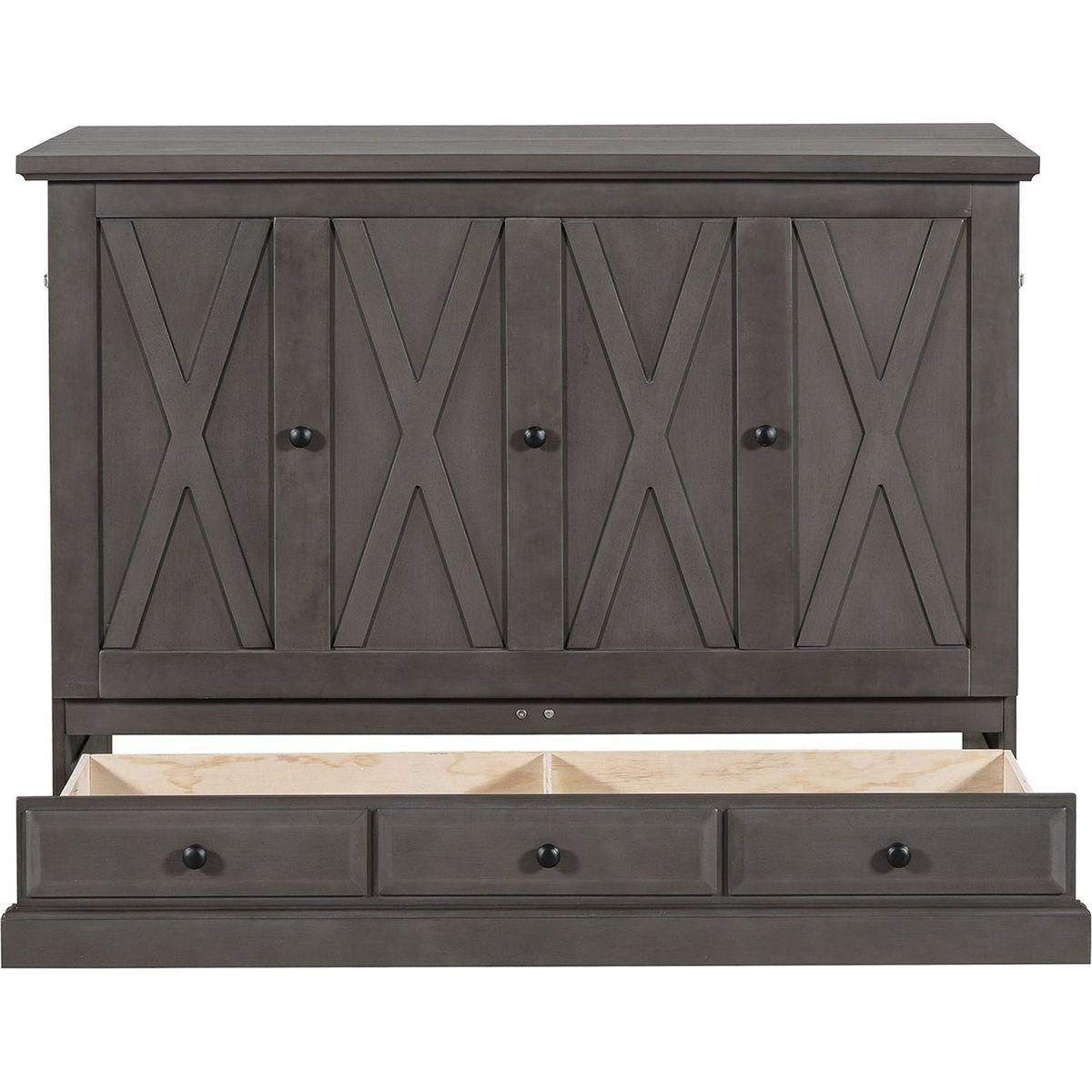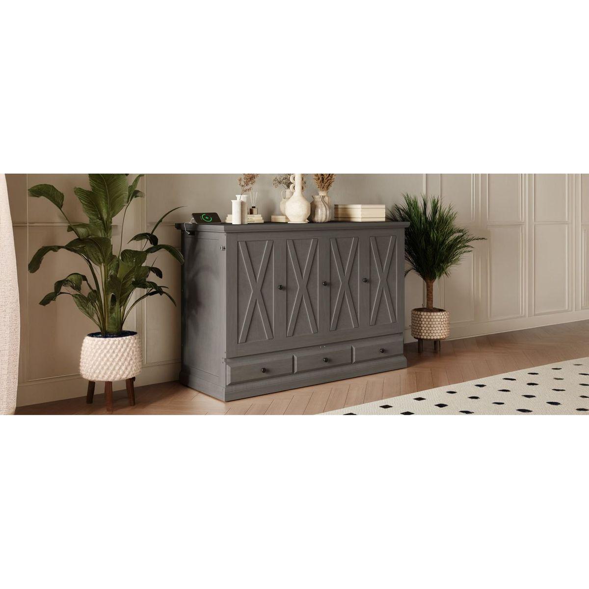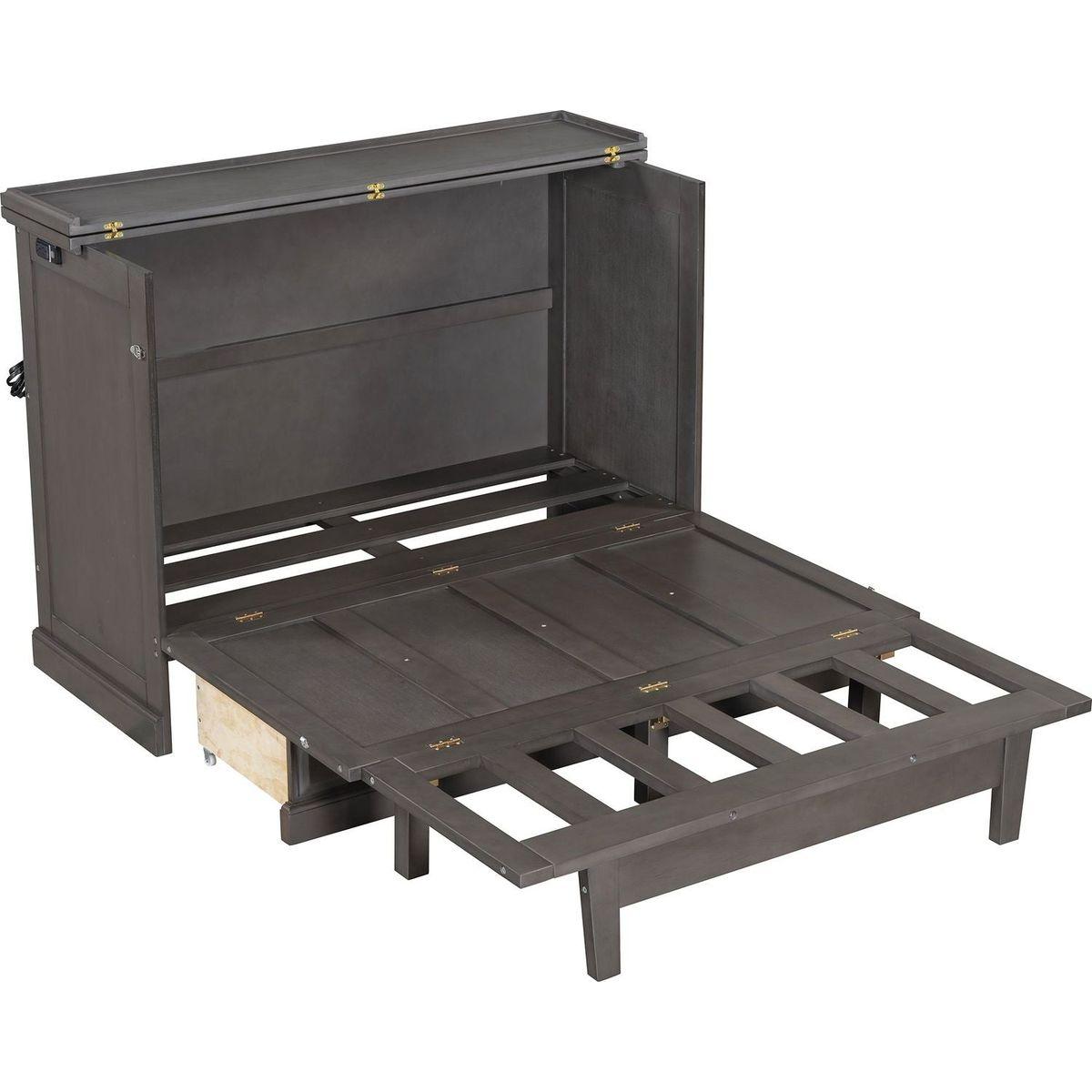 Solid Pine Murphy Bed Chest Cube Cabinet Bed with Charging Station and Large Storage Drawer for Home Office or Small Room,Full,Gray