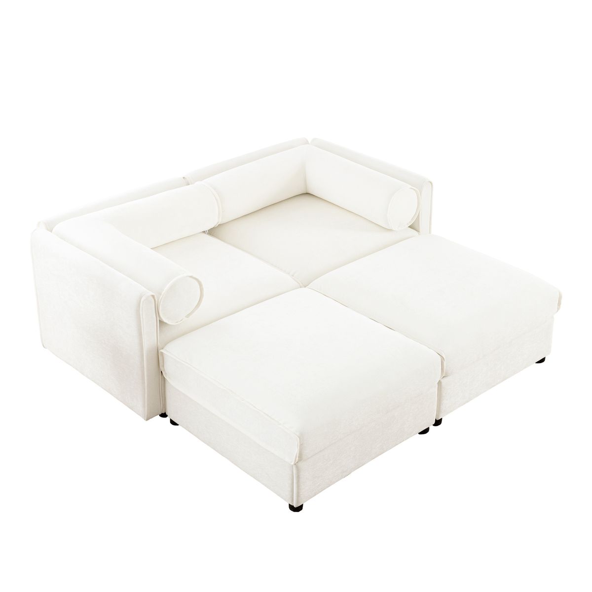 Stylish White Chenille 2-Seater Sofa with Ottoman Storage, Cylindrical Backrest and Armrests, Modern Fabric Loveseat