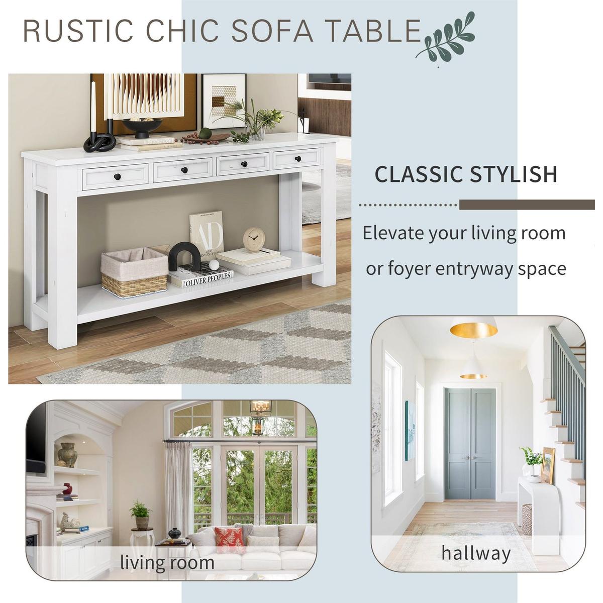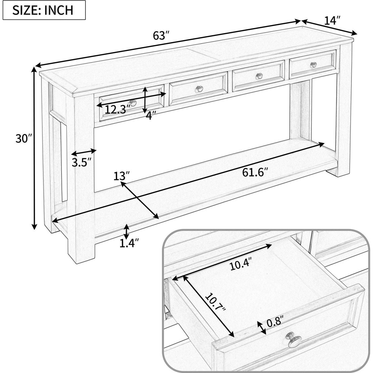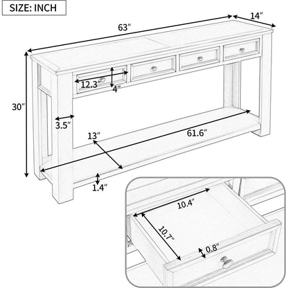 - Large Storage Space: Dimensions 63"L× 14"W× 30"H. The console table features with 4 drawers and a fixed lower shelf and long enough tabletop which provide enough storage space.