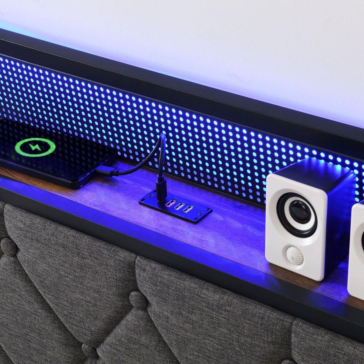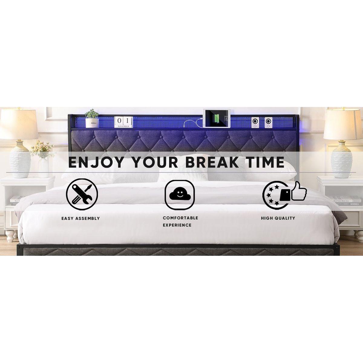 King Bed Frame with Storage Headboard, Charging Station and LED Lights, Upholstered Platform Bed with Heavy Metal Slats, No Box Spring Needed, Noise Free, Easy Assembly, Dark Gray