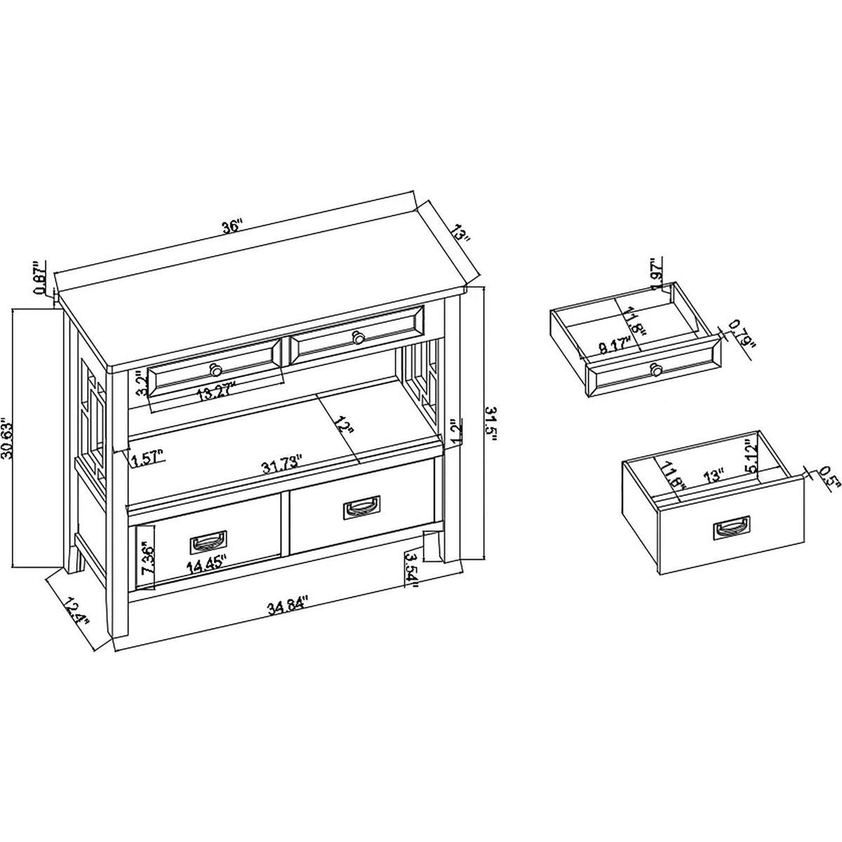· Easy and Fast to Install】- Including all necessary tools and clear instructions, and pieces were labeled perfectly, so you can easy and fast to assemble this buffet table. Overall Dimension: Overall: 31.5'' H x 36.02'' W x 13'' D. Shelf: 13.34'' H x 49'' W x 35'' D. Leg Height: 3.54''H.