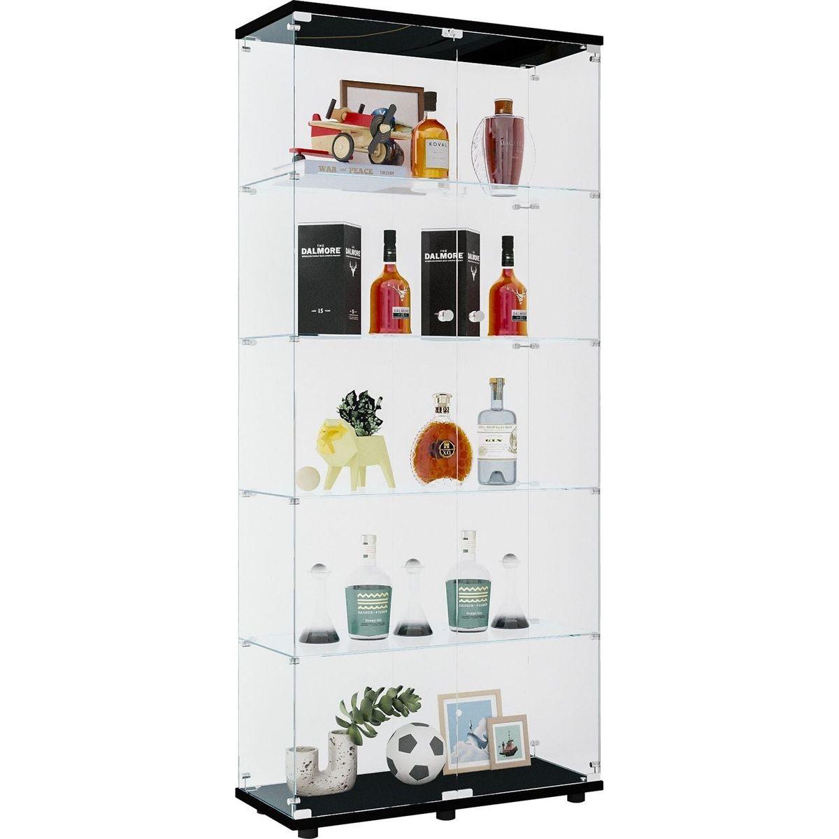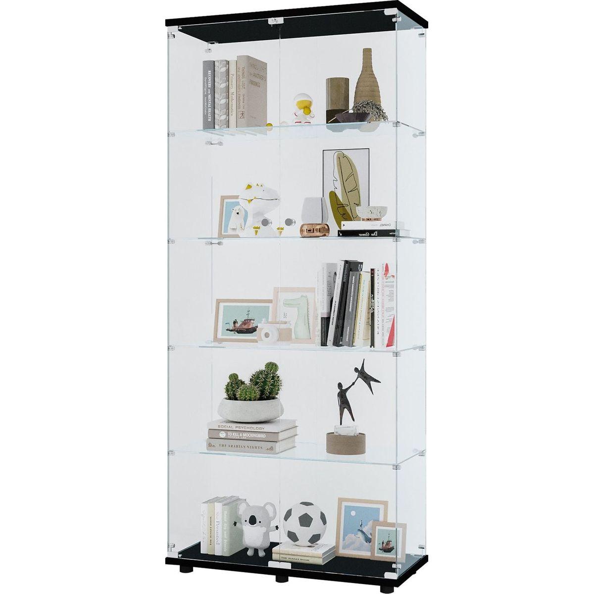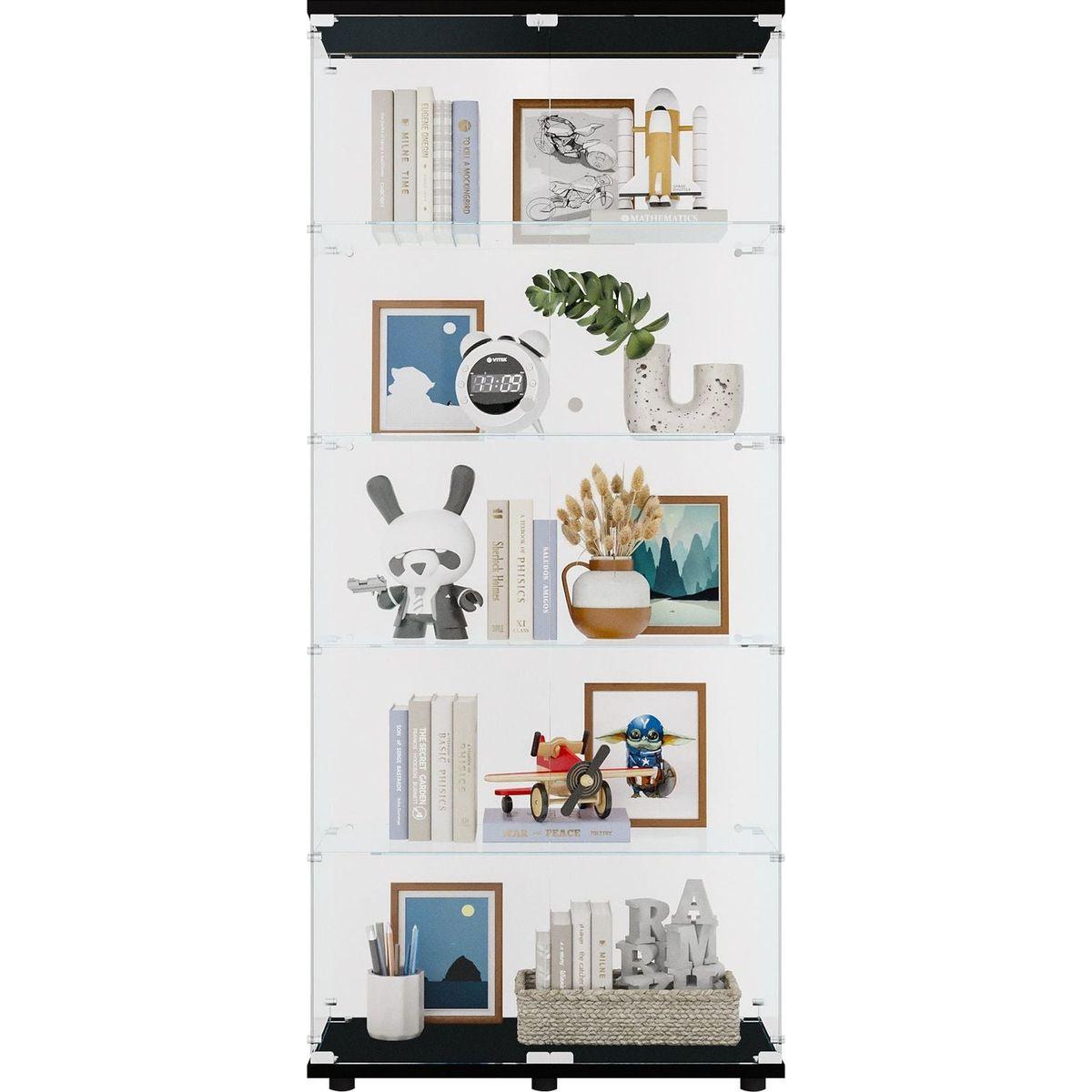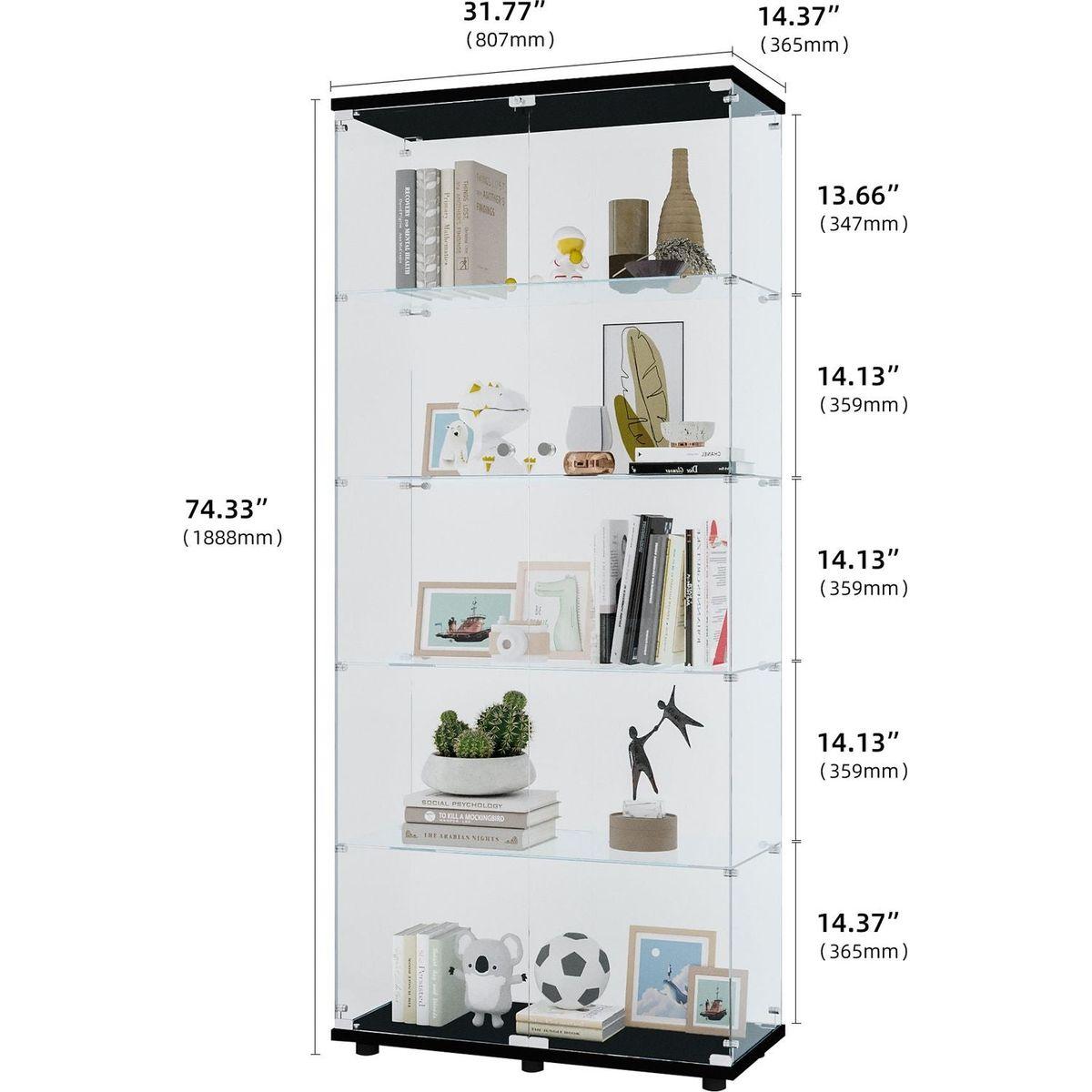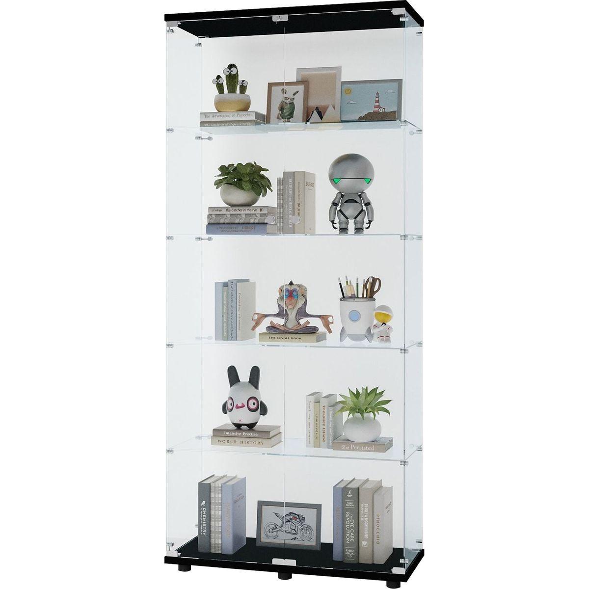 Glass Display Cabinet with 5 Shelves Double Door, Curio Cabinets for Living Room, Bedroom, Office, Black Floor Standing Glass Bookshelf, Quick Installation